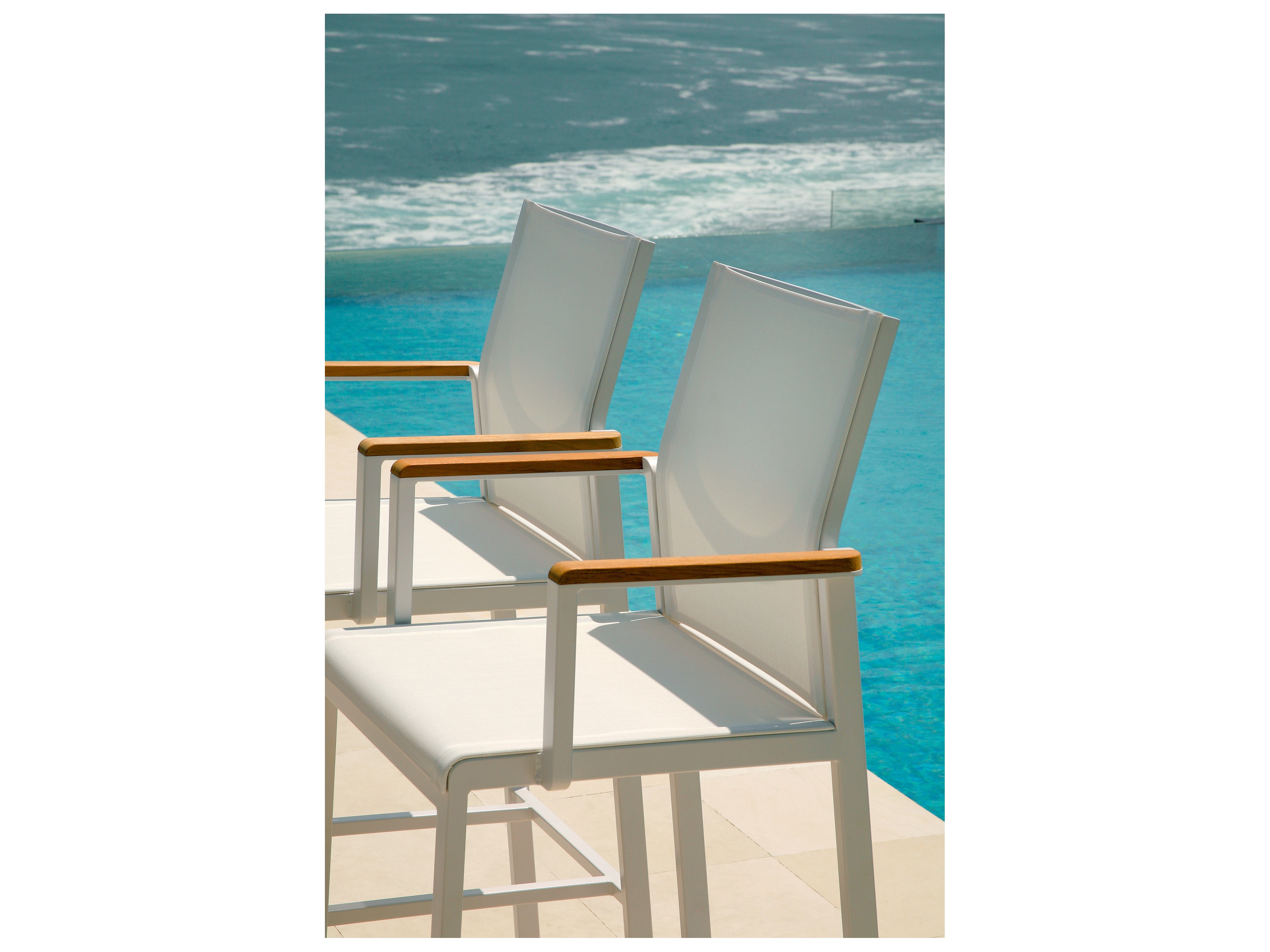 Elevate your outdoor living space with the elegant Aura outdoor bar stool. Crafted with durable aluminum and featuring Textilene(R) sling, this stool provides a comfortable and stylish seating option for your patio or terrace. The teak arms add a touch of sophistication, while the footbar with a protective cover ensures lasting protection and comfort.