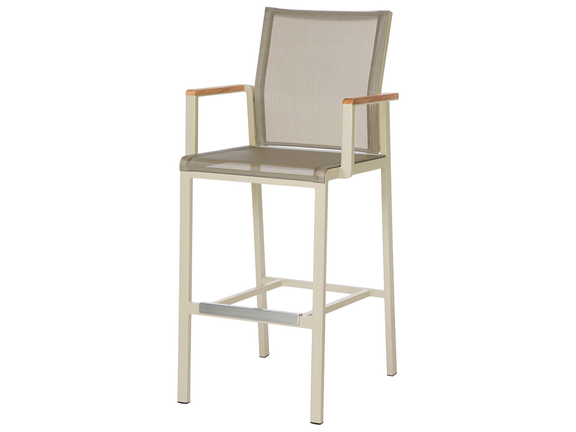 Elevate your outdoor living space with the elegant Aura outdoor bar stool. Crafted with durable aluminum and featuring Textilene(R) sling, this stool provides a comfortable and stylish seating option for your patio or terrace. The teak arms add a touch of sophistication, while the footbar with a protective cover ensures lasting protection and comfort.