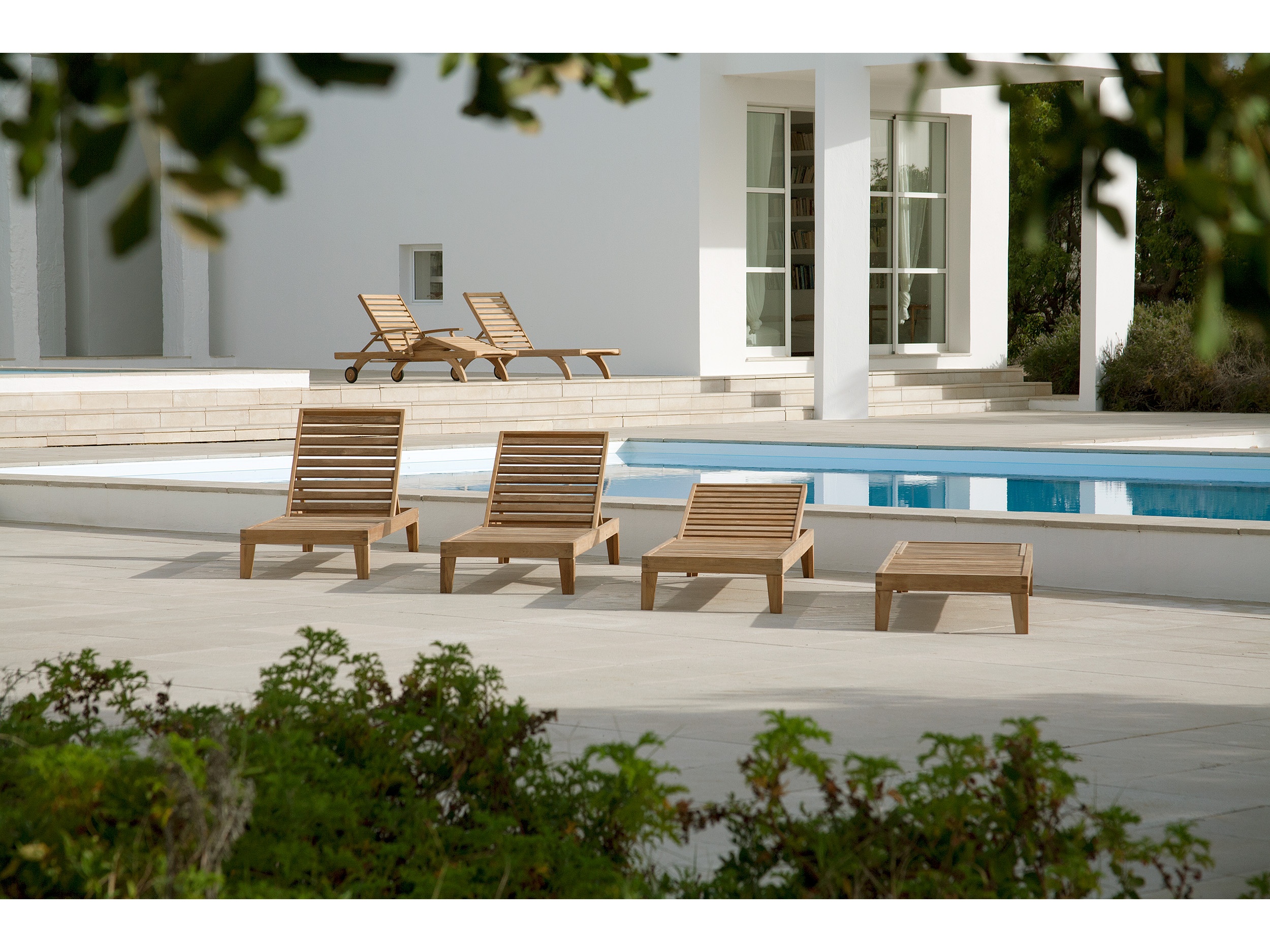 The Capri outdoor chaise lounge offers an exquisite design that blends functionality and style. Made with durable teak, this chaise lounge features an adjustable backrest with four positions, allowing you to find your perfect relaxation angle. Additionally, multiple loungers can be seamlessly linked together both side by side and end to end using our specially designed brass clips (sold separate), making it an ideal choice for creating a cohesive outdoor seating area.