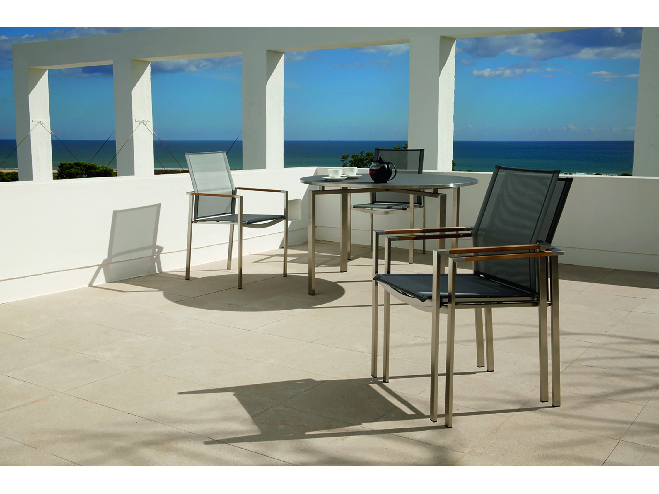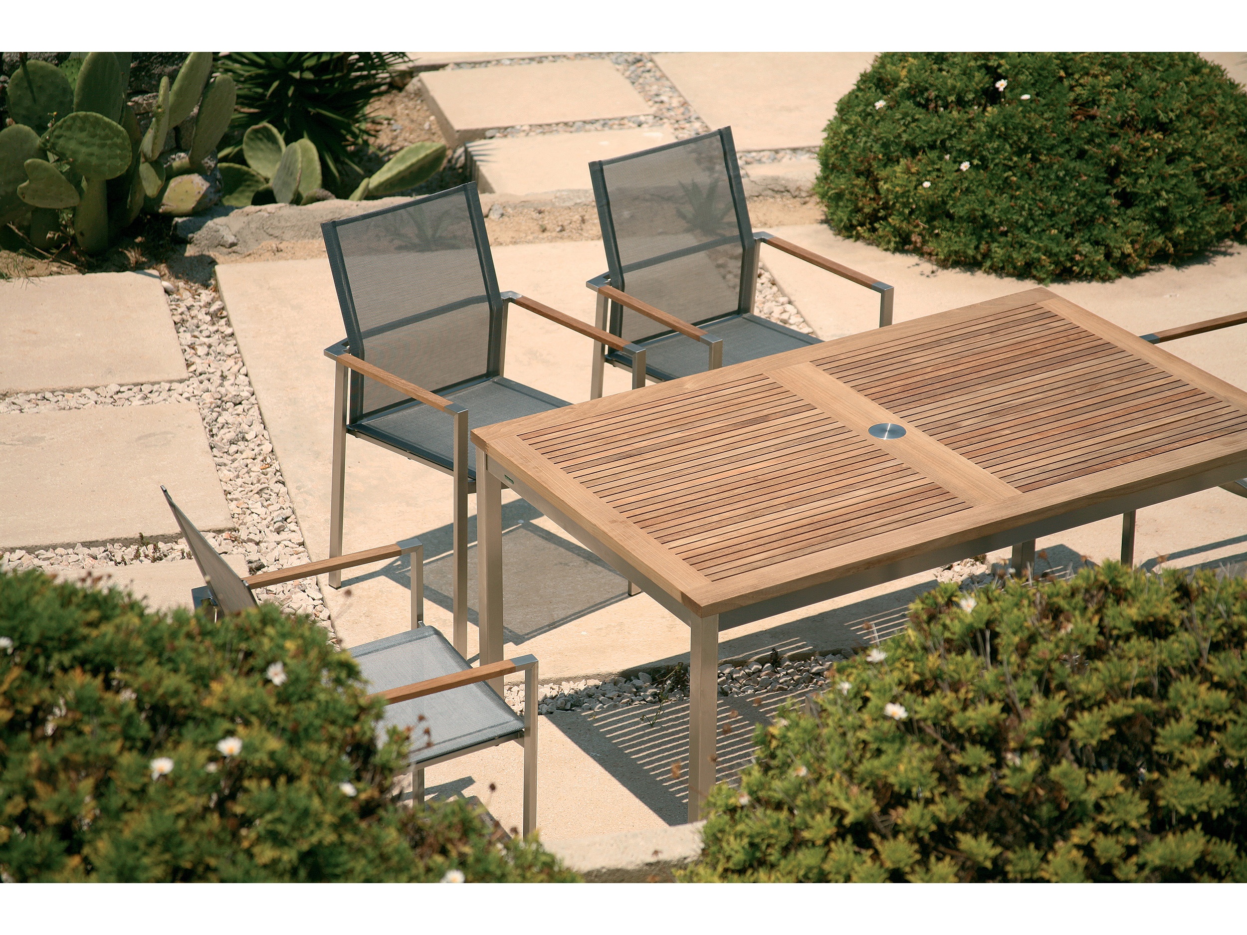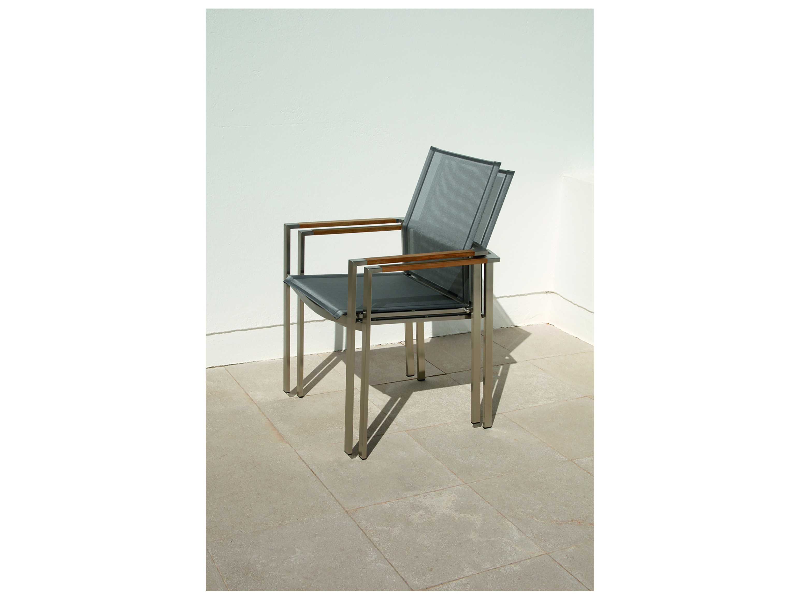 Barlow Tyrie Mercury Dining Arm Chair - Silver Stainless Steel Frame - Platinum Textilene Sling - Natural Teak Arms