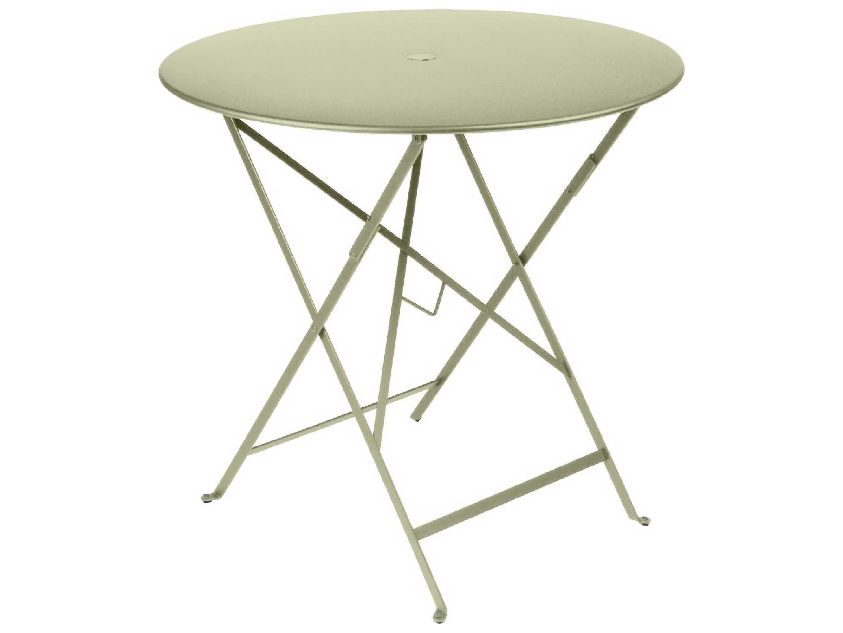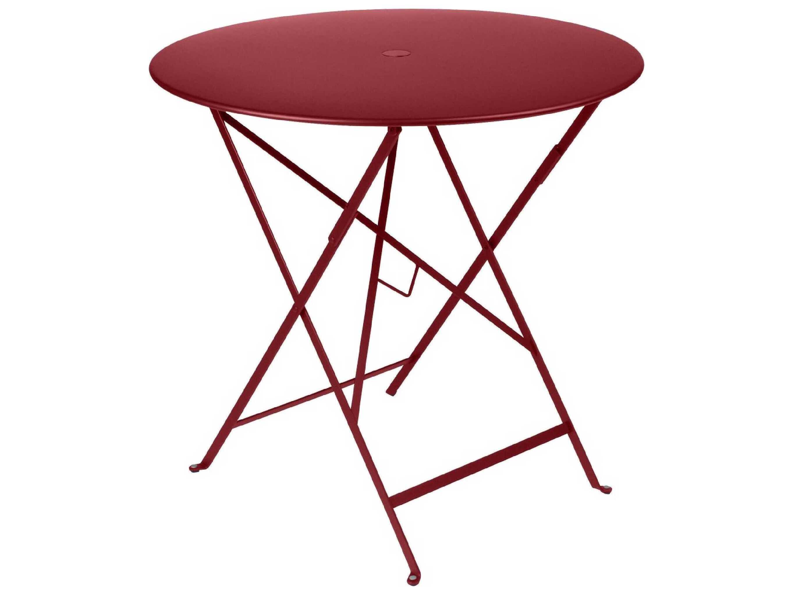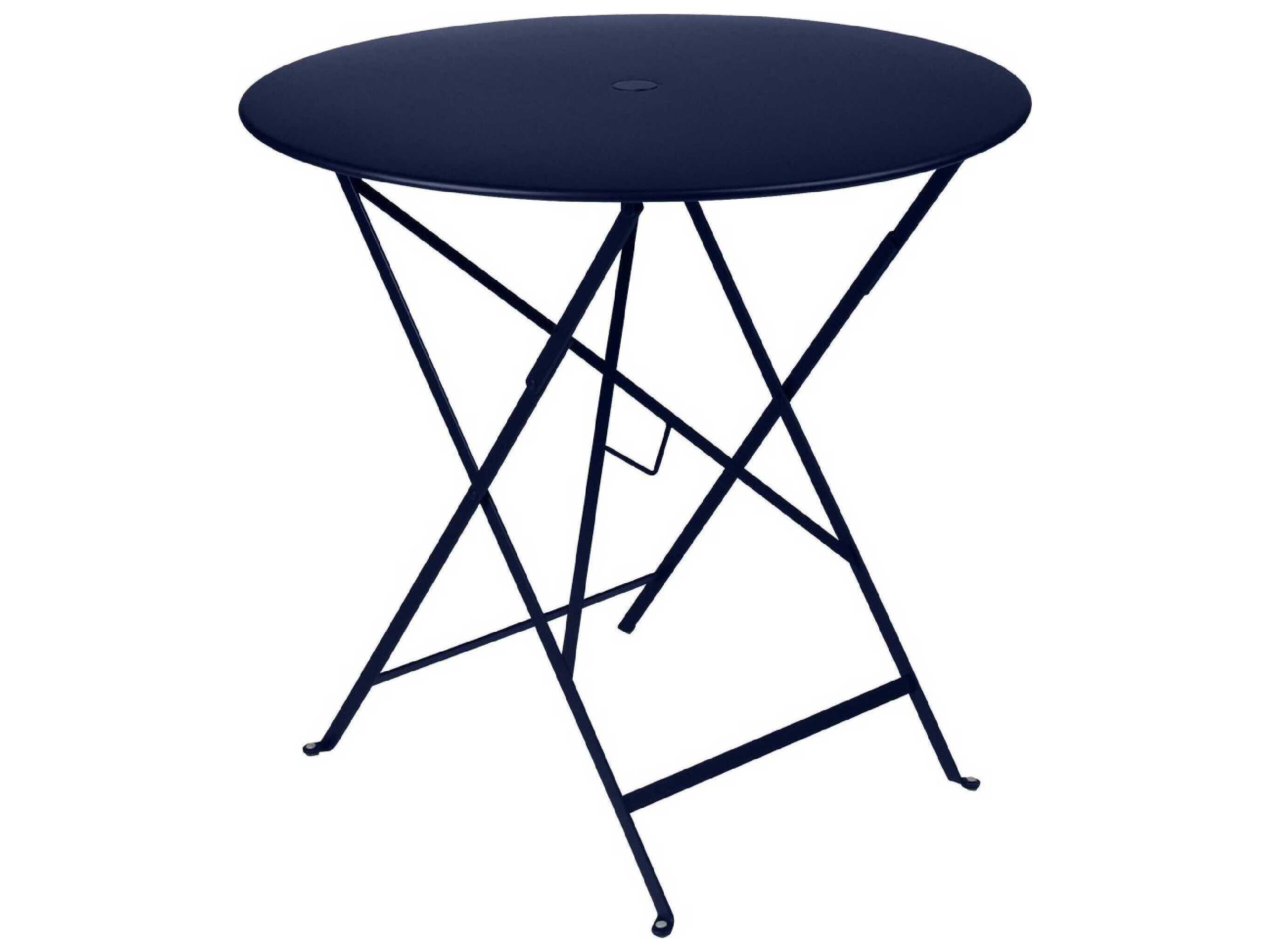 The round 30" folding Bistro table is made of lacquered steel and includes a 1.5" umbrella hole. Seats two for dinner and four for drinks.
