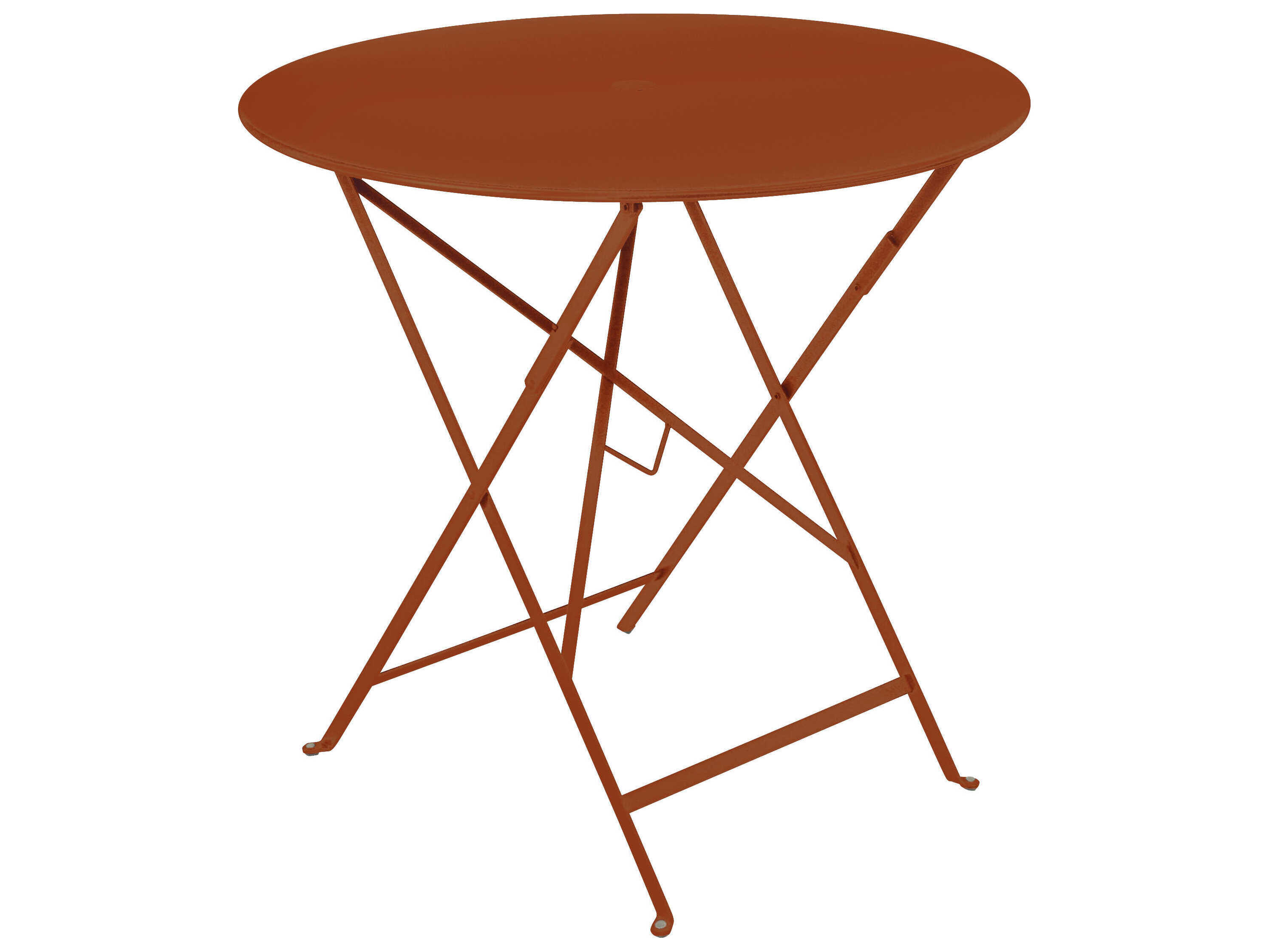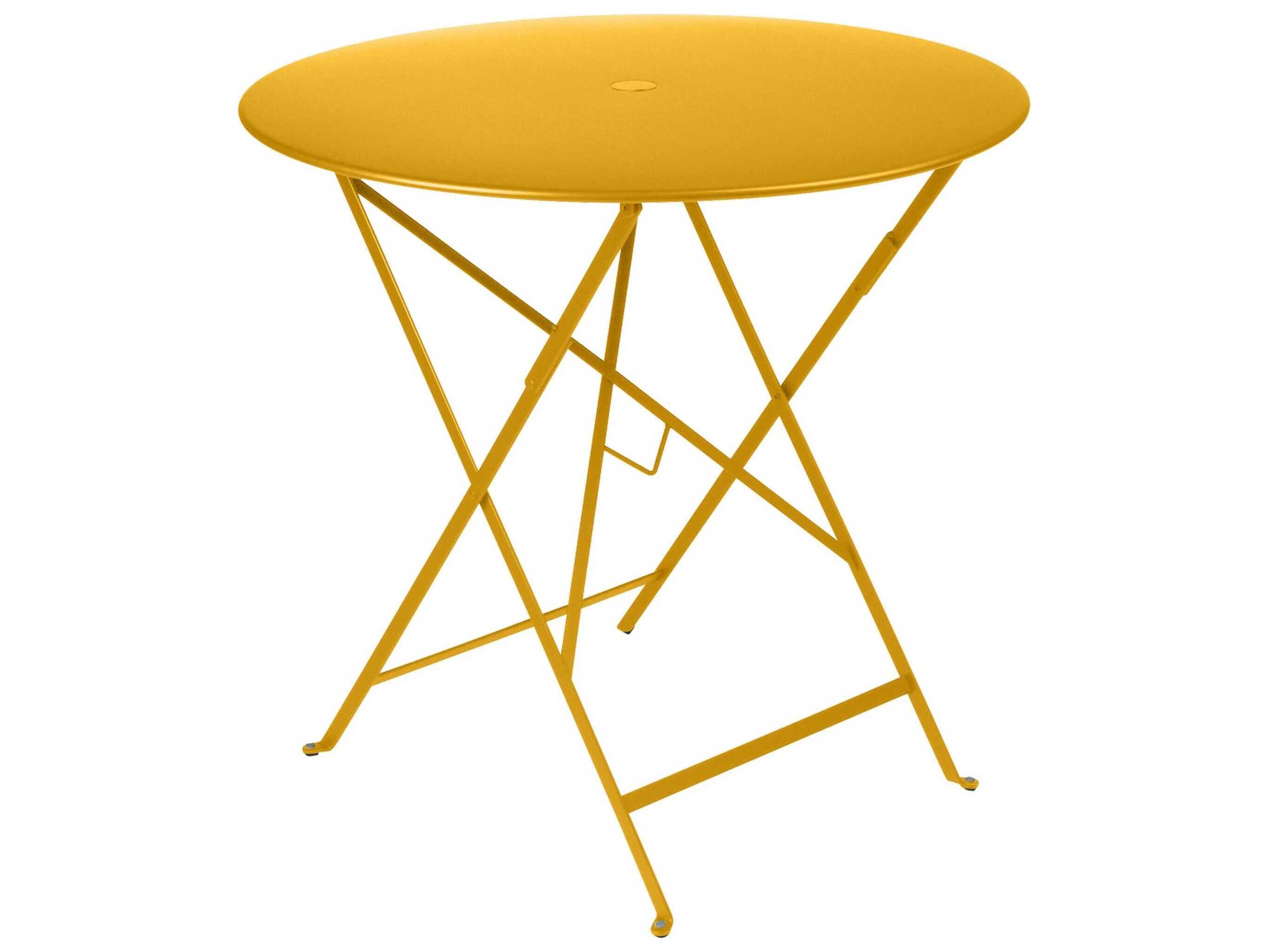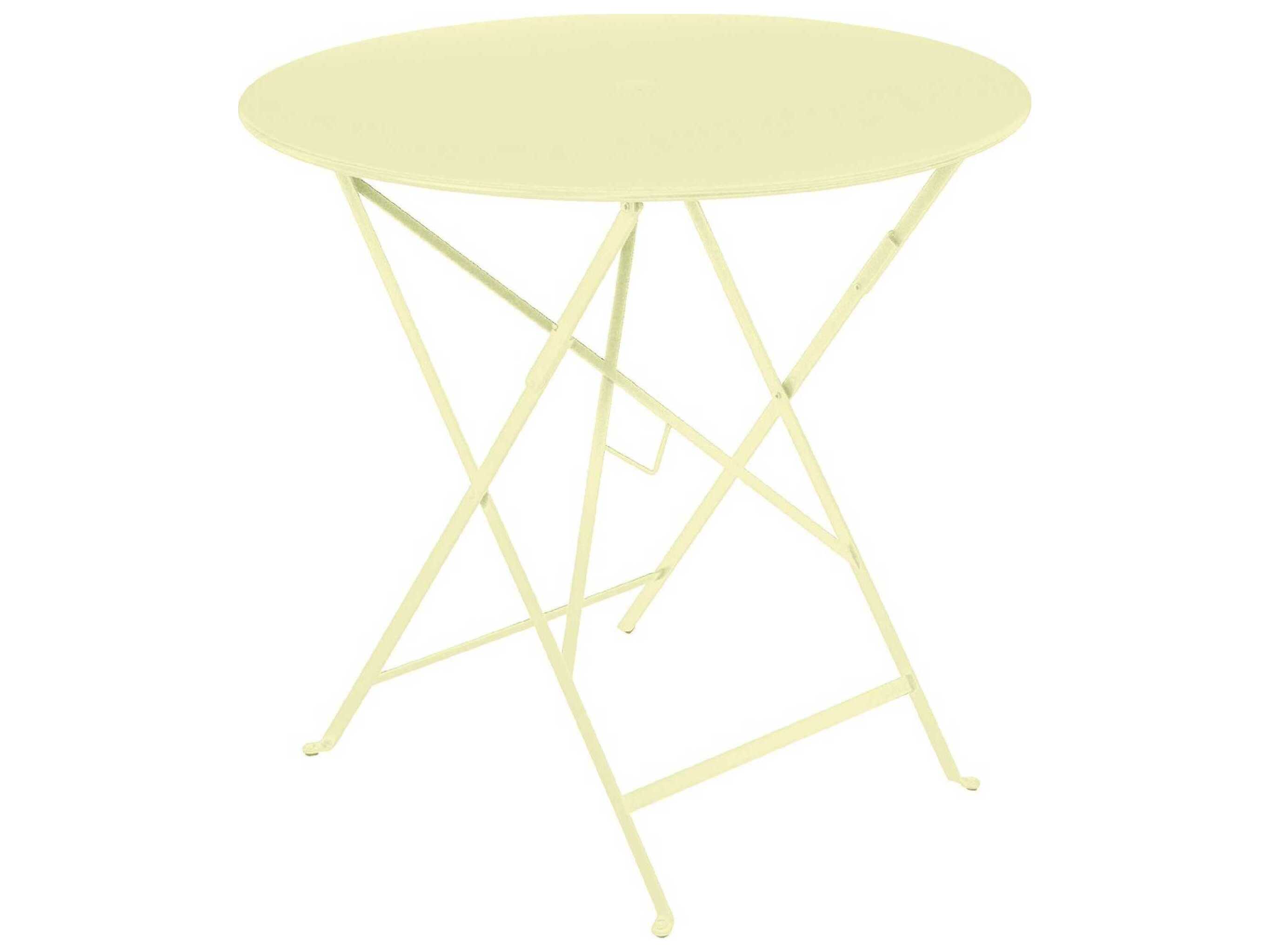 The round 30" folding Bistro table is made of lacquered steel and includes a 1.5" umbrella hole. Seats two for dinner and four for drinks.