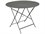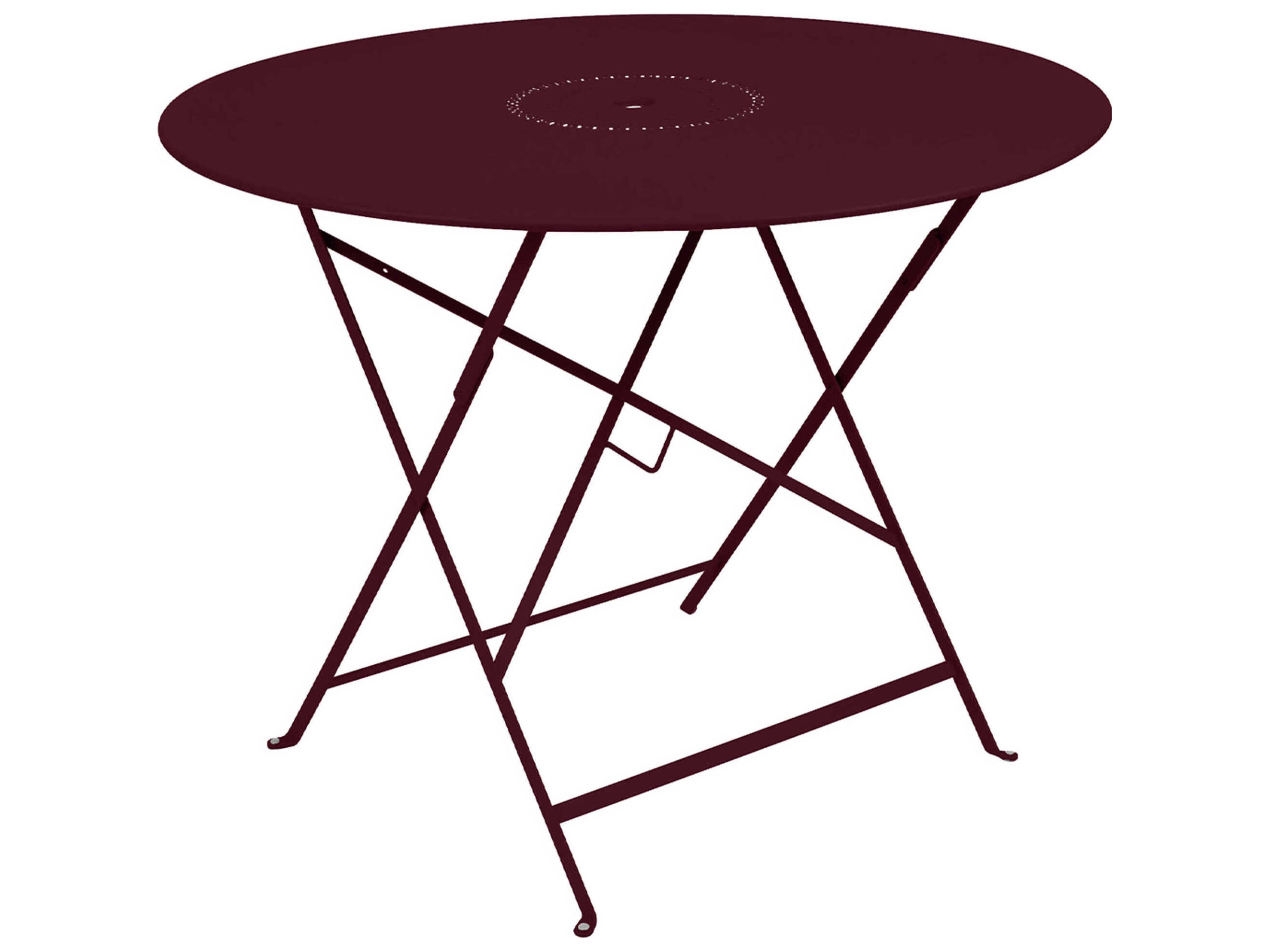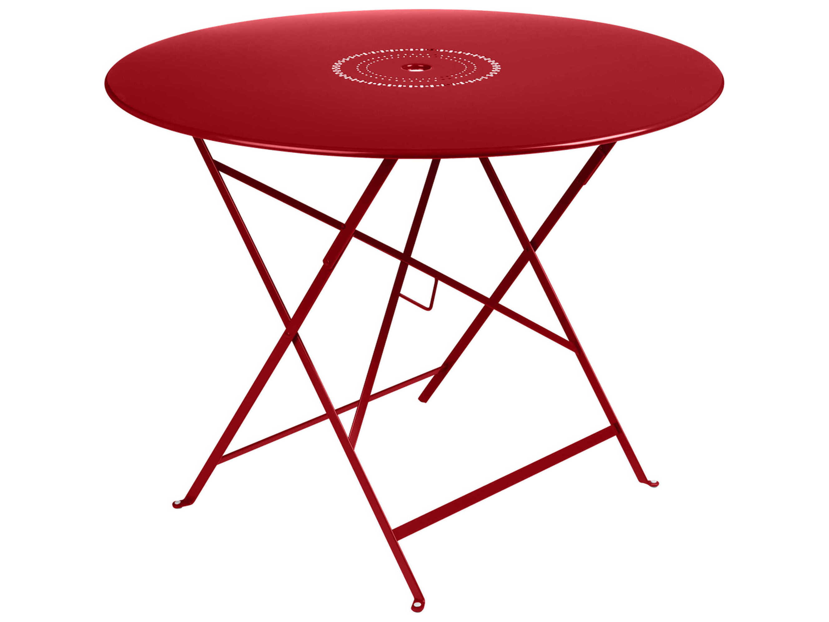 The 38" round folding Bistro table is made of lacquered steel and includes beautiful perforated detail in the table top, as well as a 1.5" umbrella hole. Seats 4 to 5 people.
