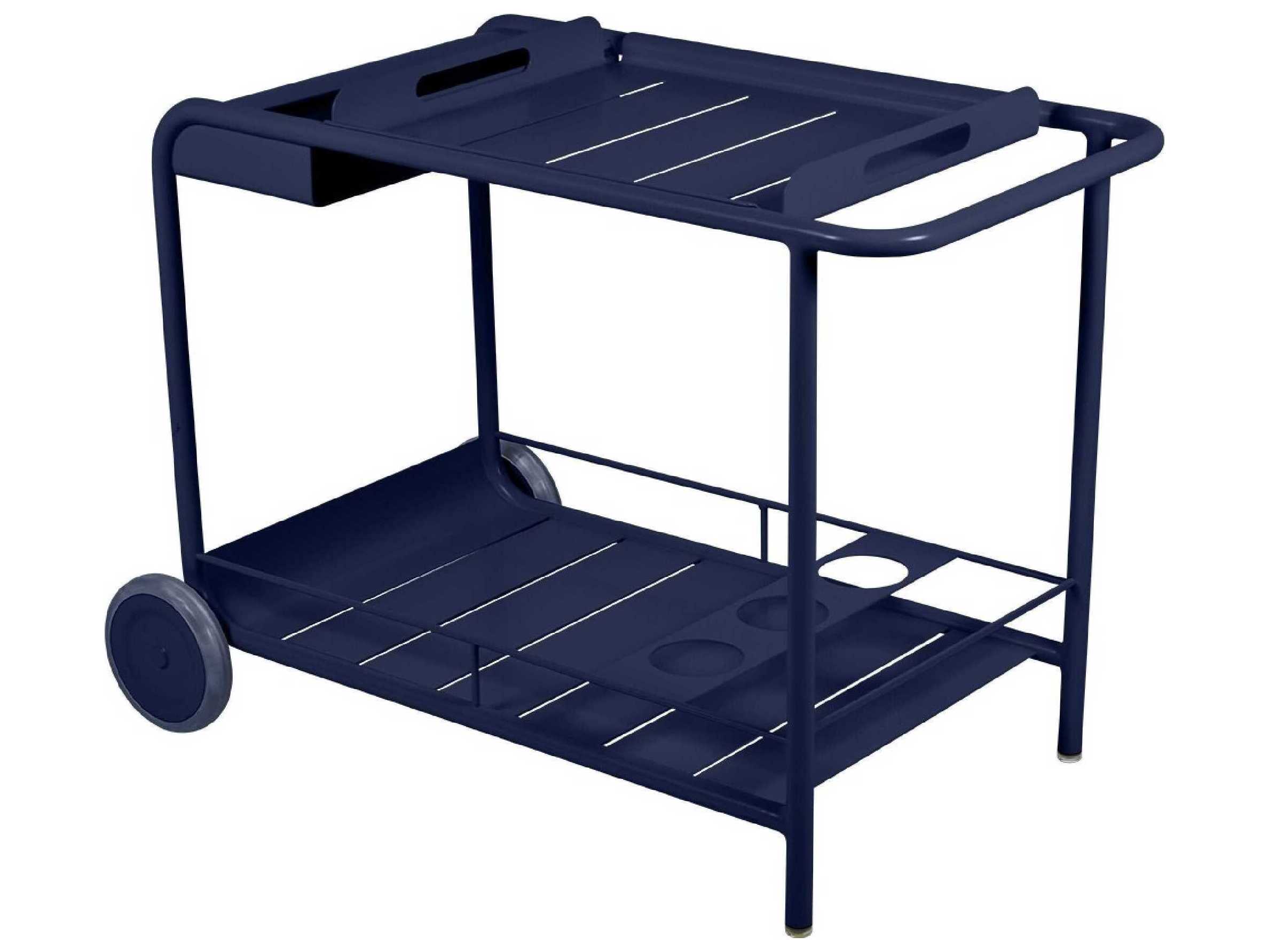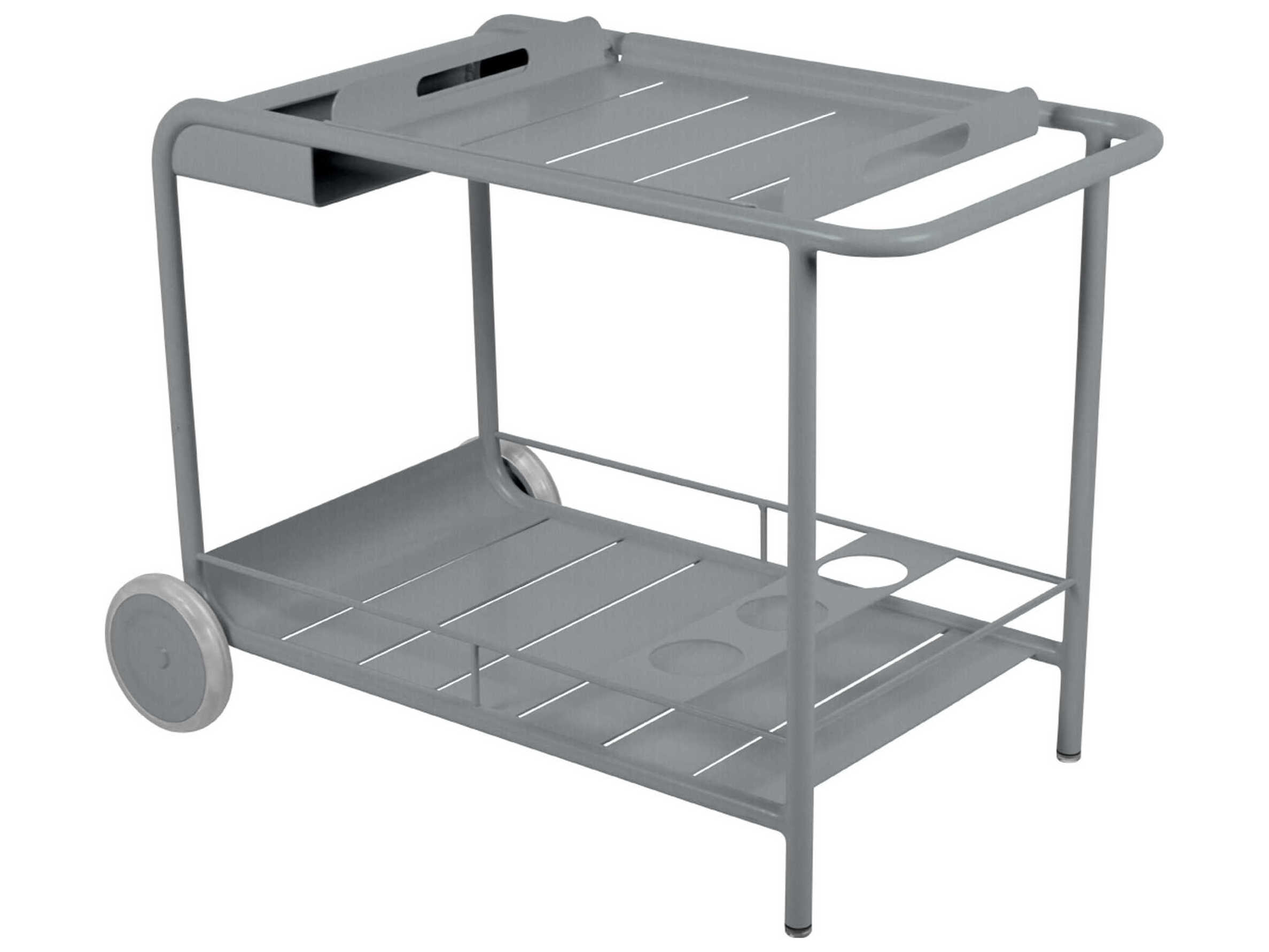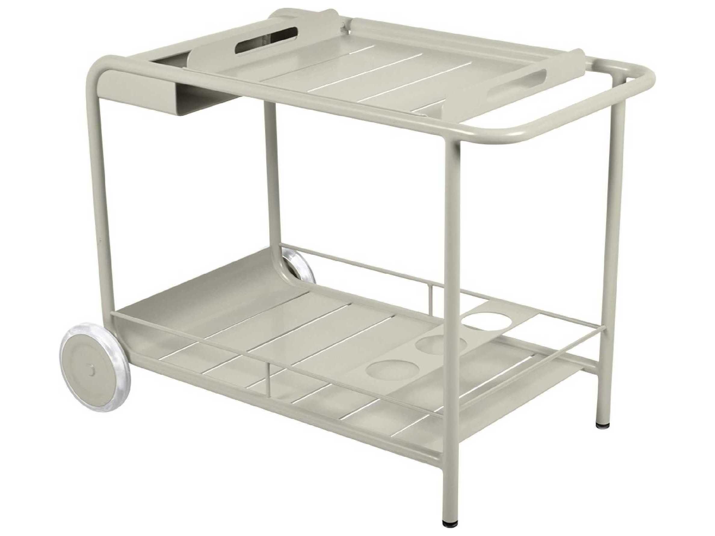 The Luxembourg Bar Cart with wheels features a removable tray top, wheels for easy transportation and a wine rack on the bottom shelf. The cataphoresis finish, a high protection outdoor treatment, makes it perfect for outside use. Use the bar cart inside or out and keep the party going with the removable tray and mobile storage.