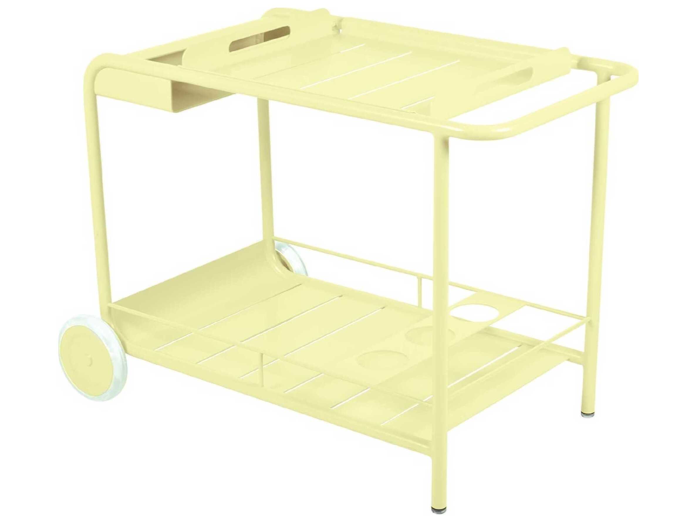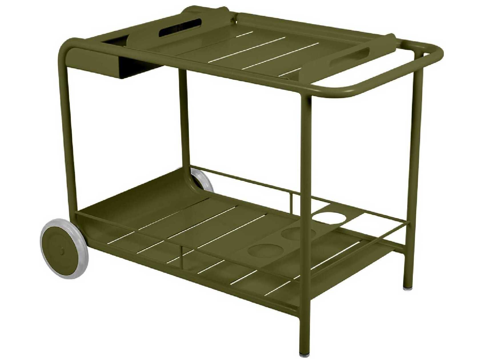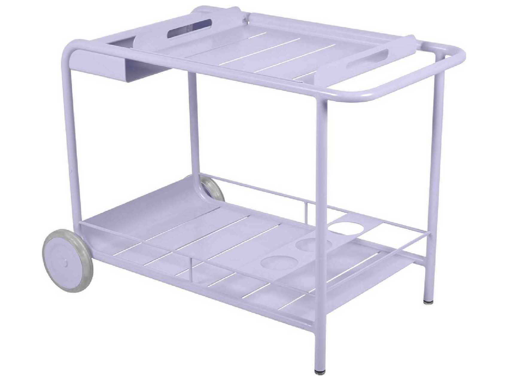 The Luxembourg Bar Cart with wheels features a removable tray top, wheels for easy transportation and a wine rack on the bottom shelf. The cataphoresis finish, a high protection outdoor treatment, makes it perfect for outside use. Use the bar cart inside or out and keep the party going with the removable tray and mobile storage.
