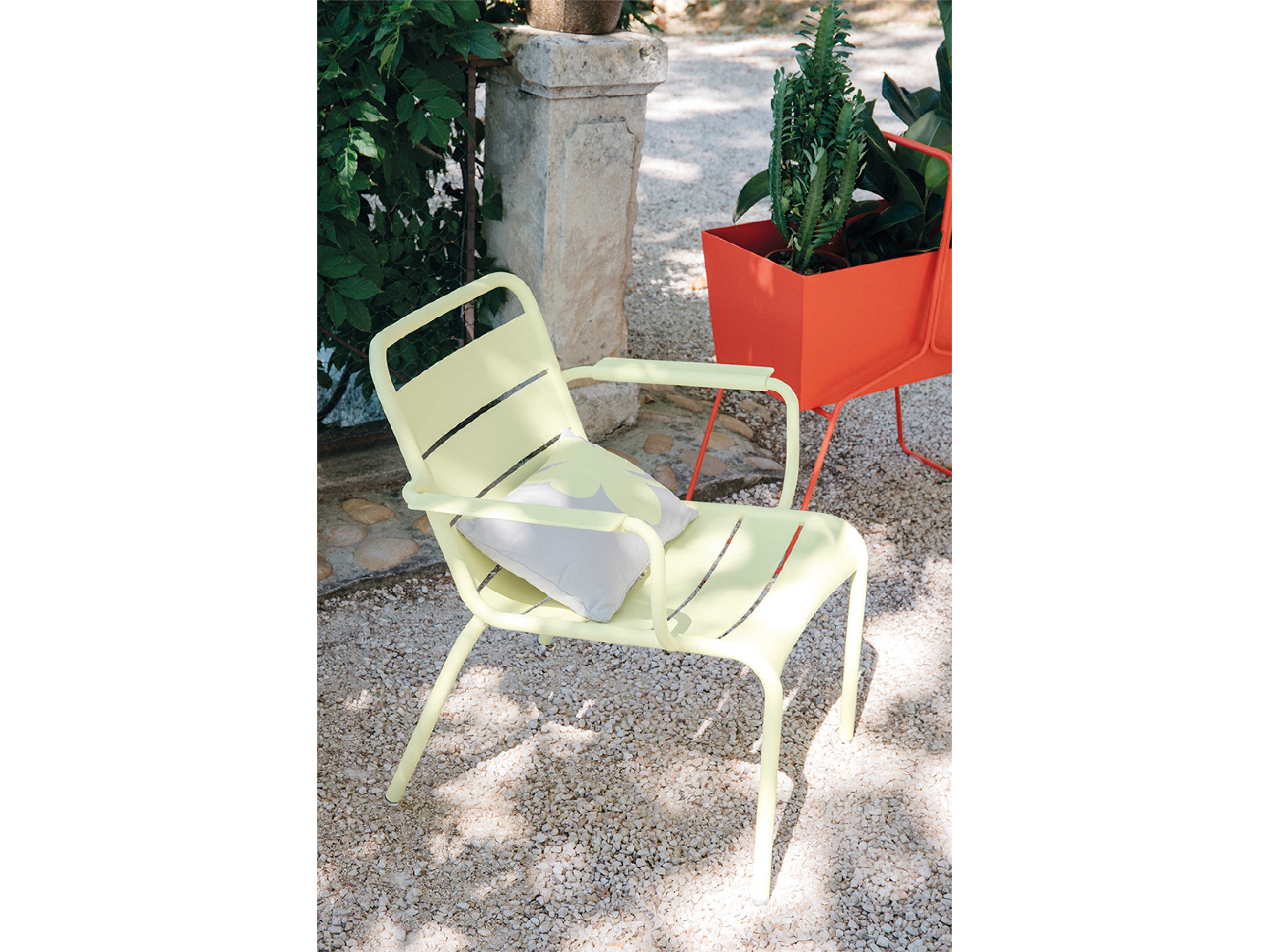 Like the Luxembourg Lounge Chair, the Luxembourg Lounge Armchair features a wider seat than other pieces in the collection. While it doesn't lean as far back as the Low Chair, the back is tilted just enough to combine comfortability with functional versatility. The Lounge Armchair features ergonomic arm rests and is an excellent addition to outdoor living spaces, as its light, aluminum construction allows it to be moved and stacked with ease.
