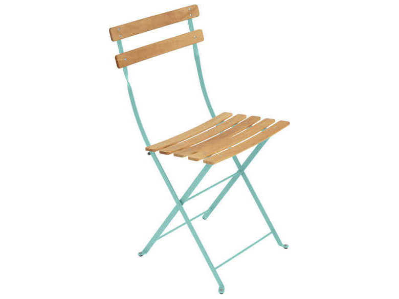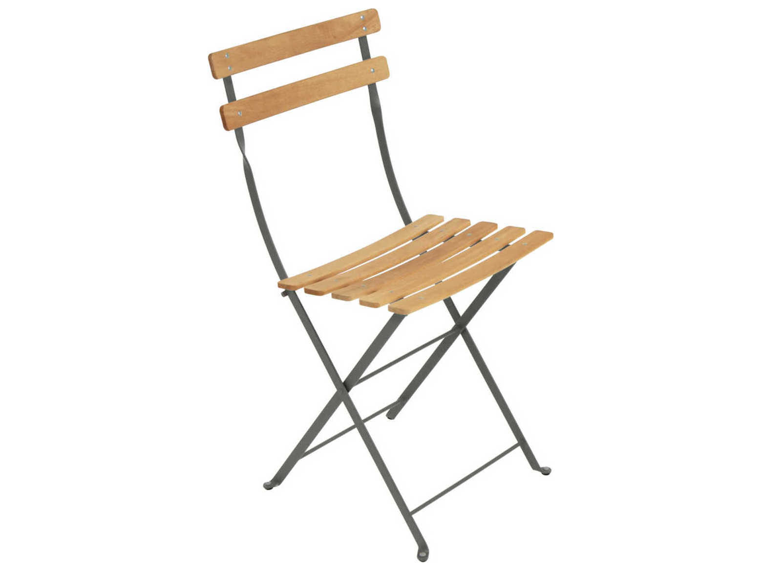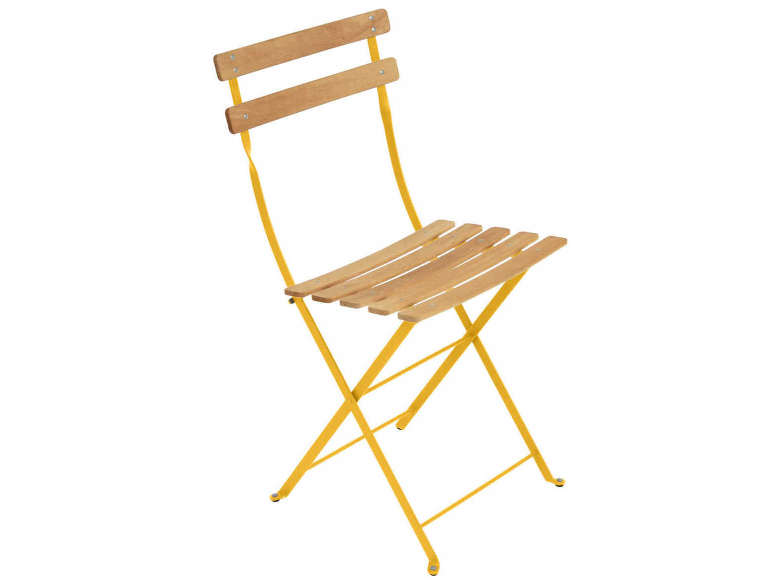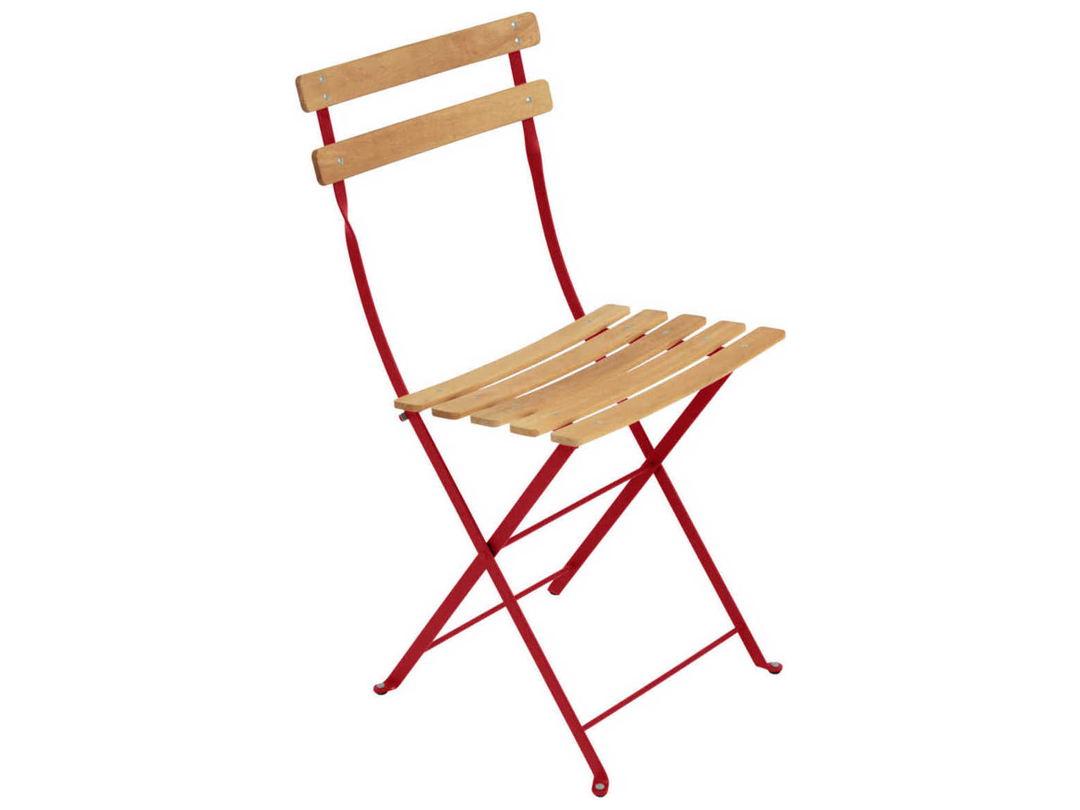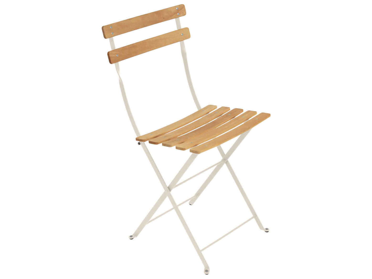 The folding Bistro Naturel chair's frame is made of lacquered steel and the seat has natural, curved beech slats treated with TEXTROL.
