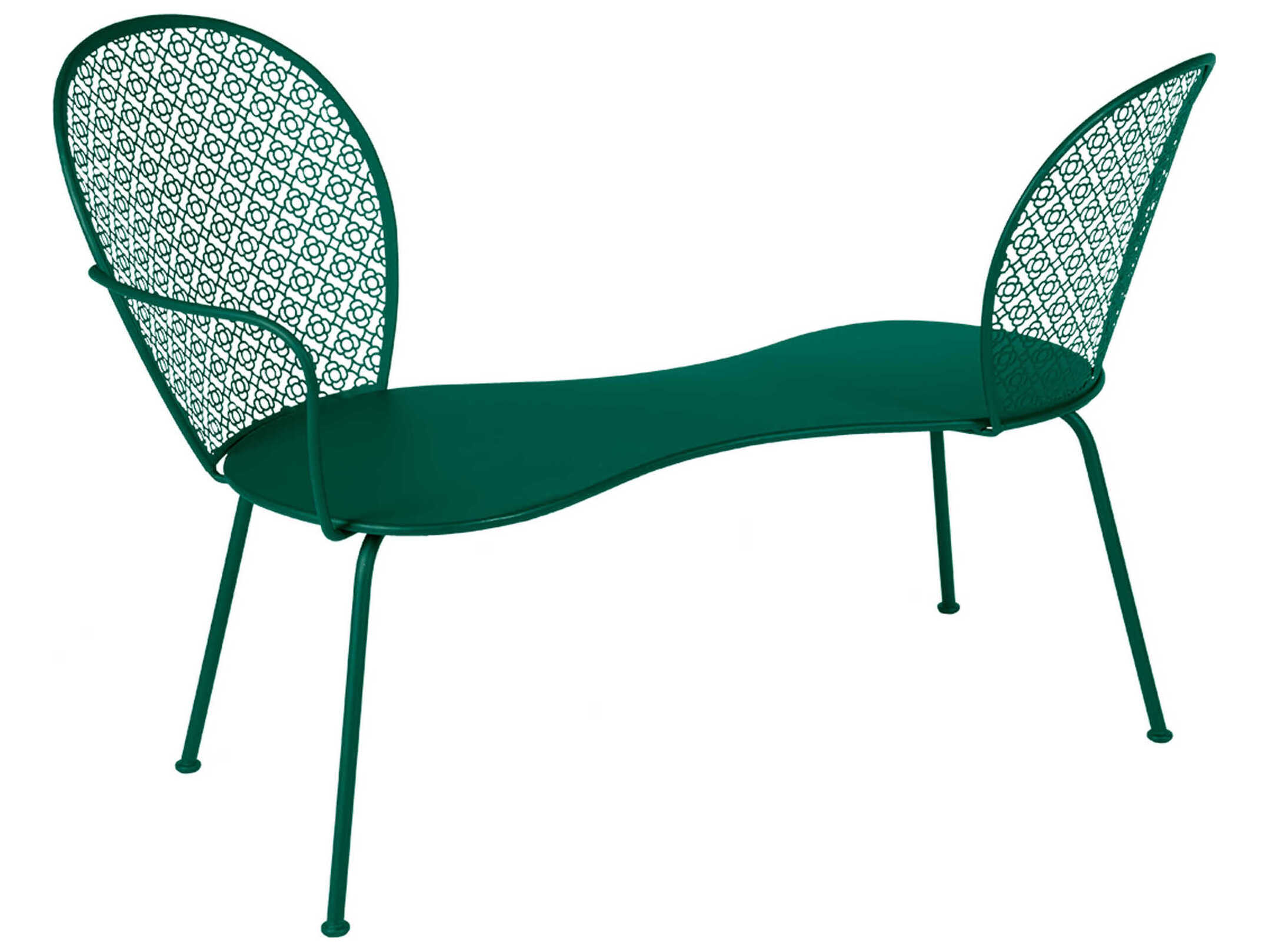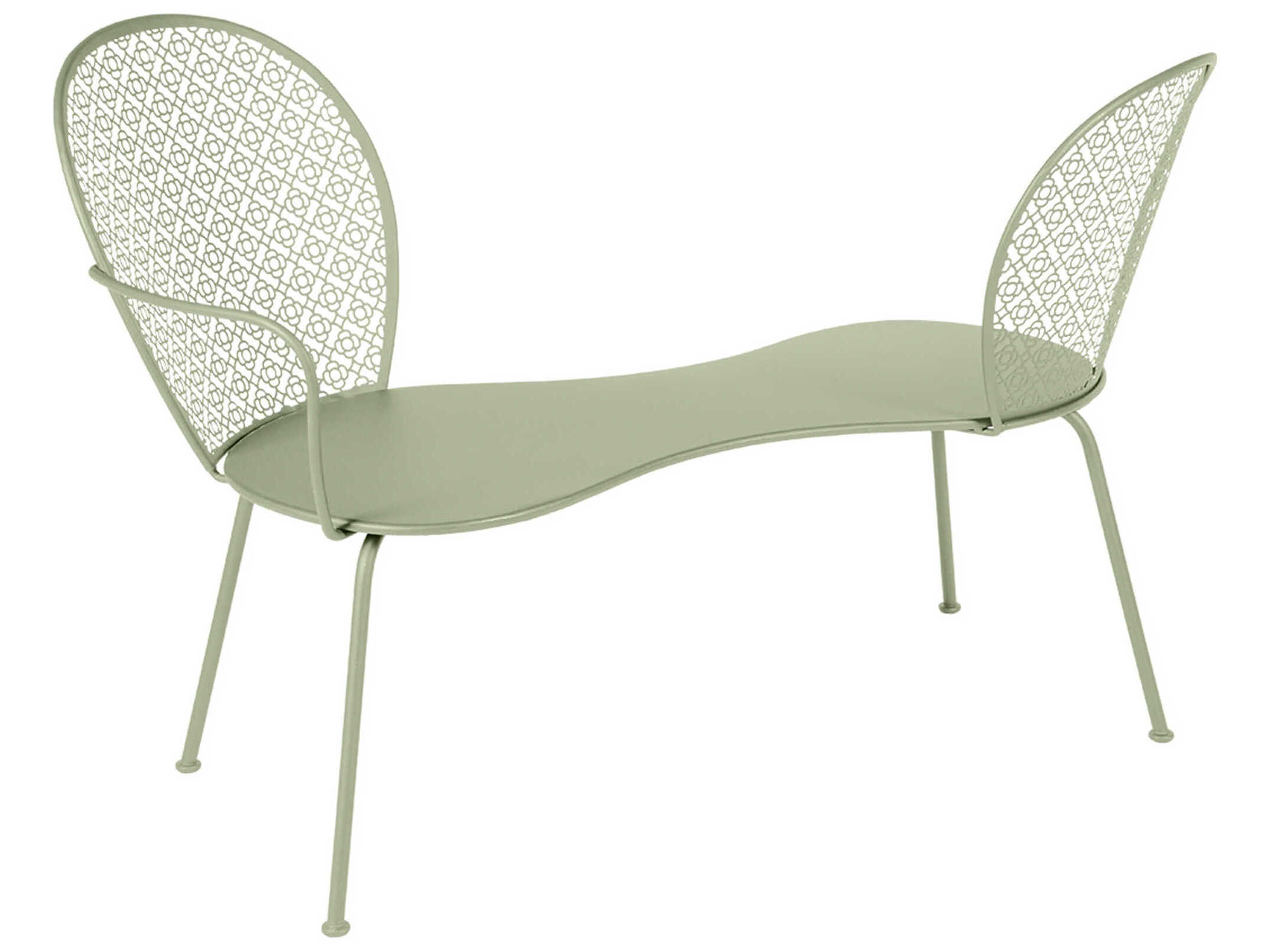 With four slender, straight legs on flared feet to stand firmly on the ground; and rounded angles between the base and the seat, the modern piece is a nod to the furniture style of the 1950s. Its signature backrest, a carefully-crafted latticed pattern of flowers and rhombuses, adds a touch of femininity as found in the French countryside. The Lorette bench lends a special character and softness to outdoor spaces.