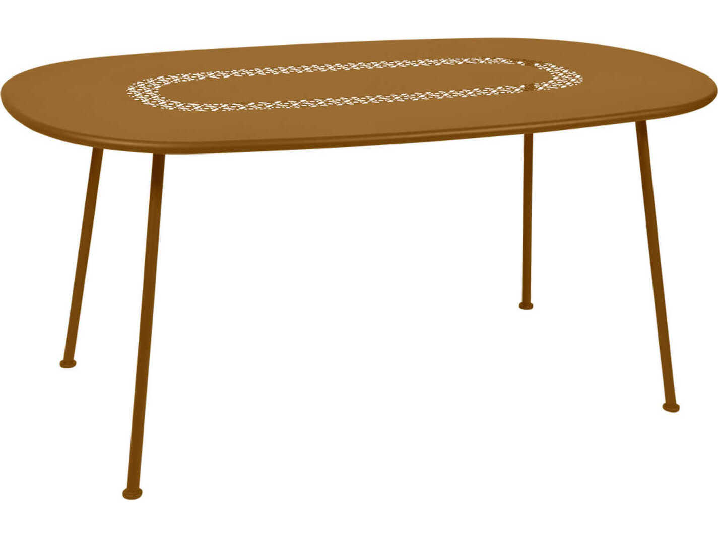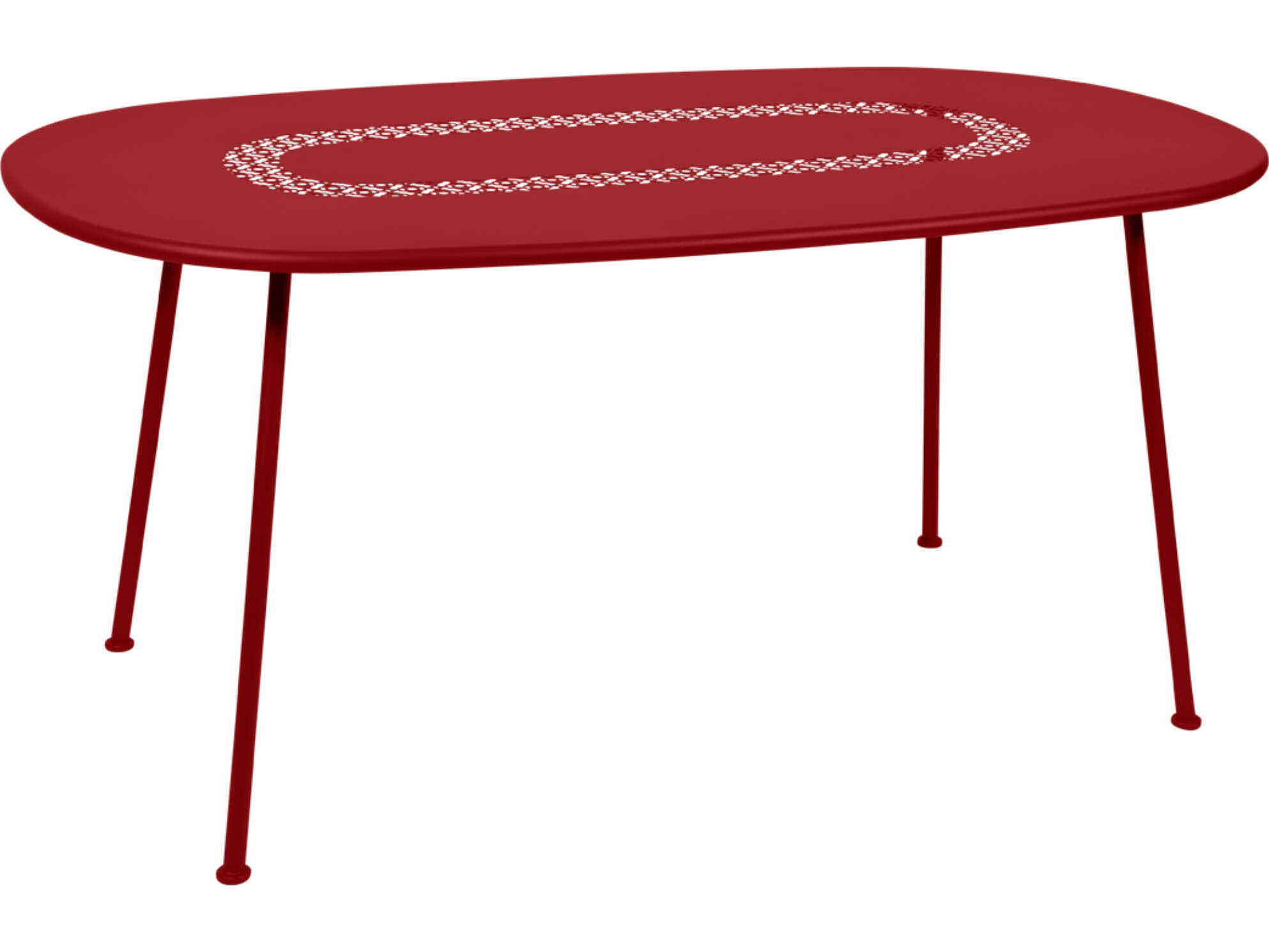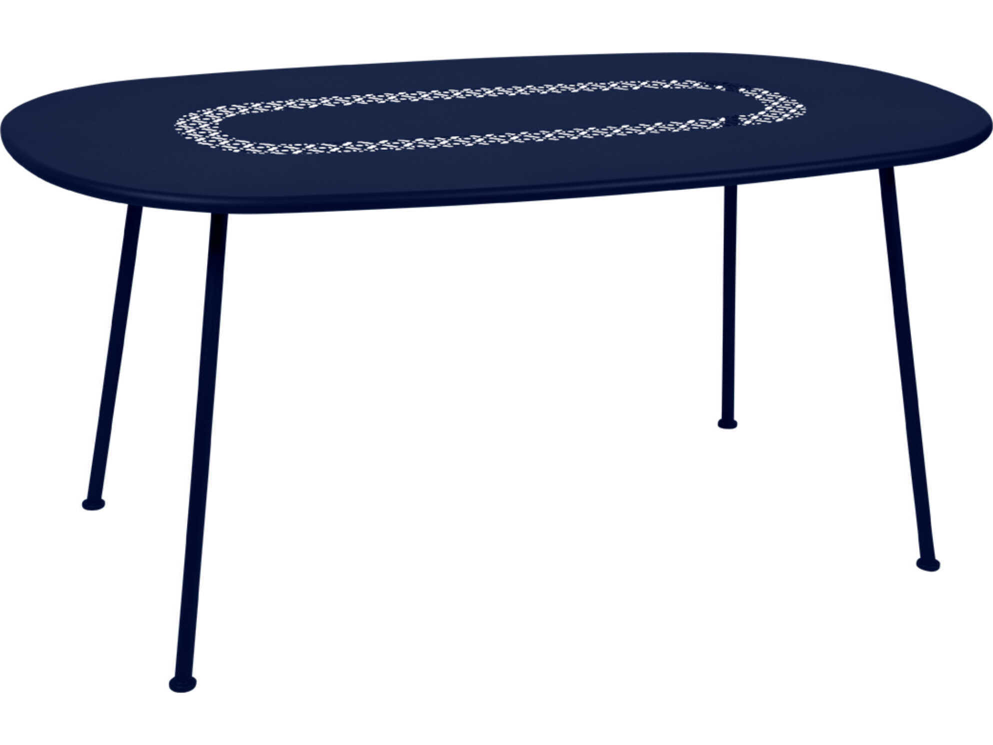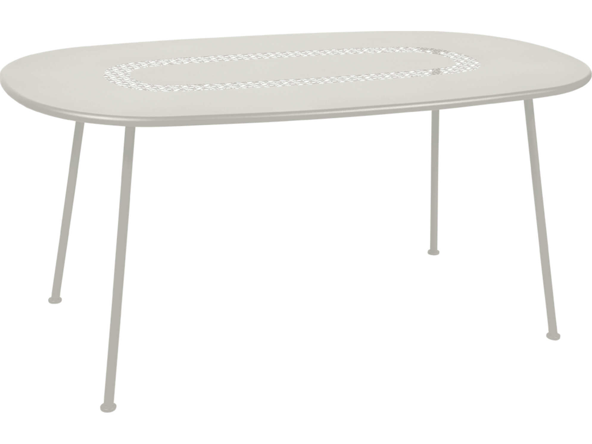 The oval table, with a generous rounded shape is ideal when space is at a premium: it can seat 6 guests who can enjoy a festive meal while being able to see and talk to each one another. While its main original feature is its shape, the Lorette oval table also stands out with its perforated top. The perforations, which are a highlight of this collection, give the table an incredibly chic stylish look. The lattice work pattern can still be seen even when the table is laid, like a table runner. The straight feet do not get in the way of guests' legs. They are flared slanted to stand firmly on the grass, and the use of steel means that this beautiful piece of furniture will stand the test of time.