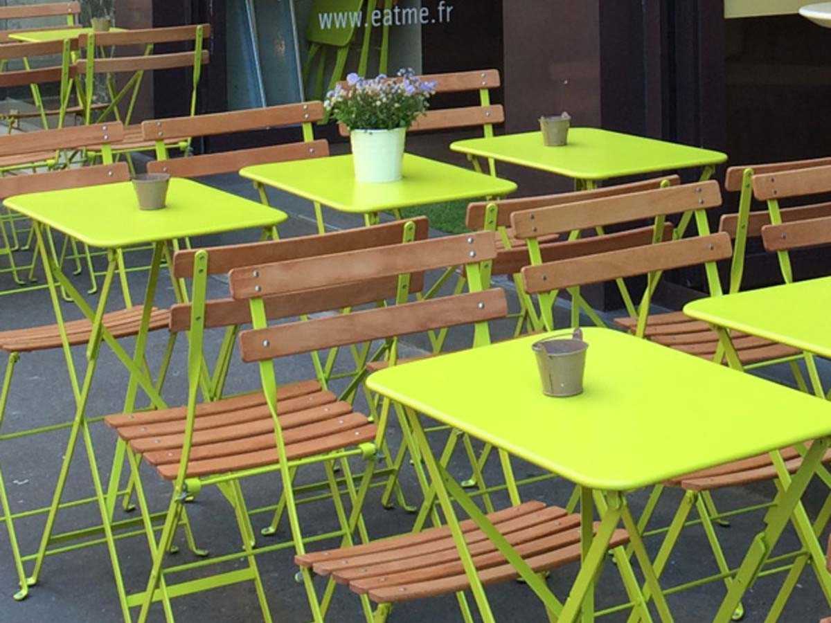 This tiny 15 x 22" rectangular folding Bistro table is made of lacquered steel. Bistro table seats two people for drinks on the patio. Group these patio tables together to create custom-sized seating spaces.