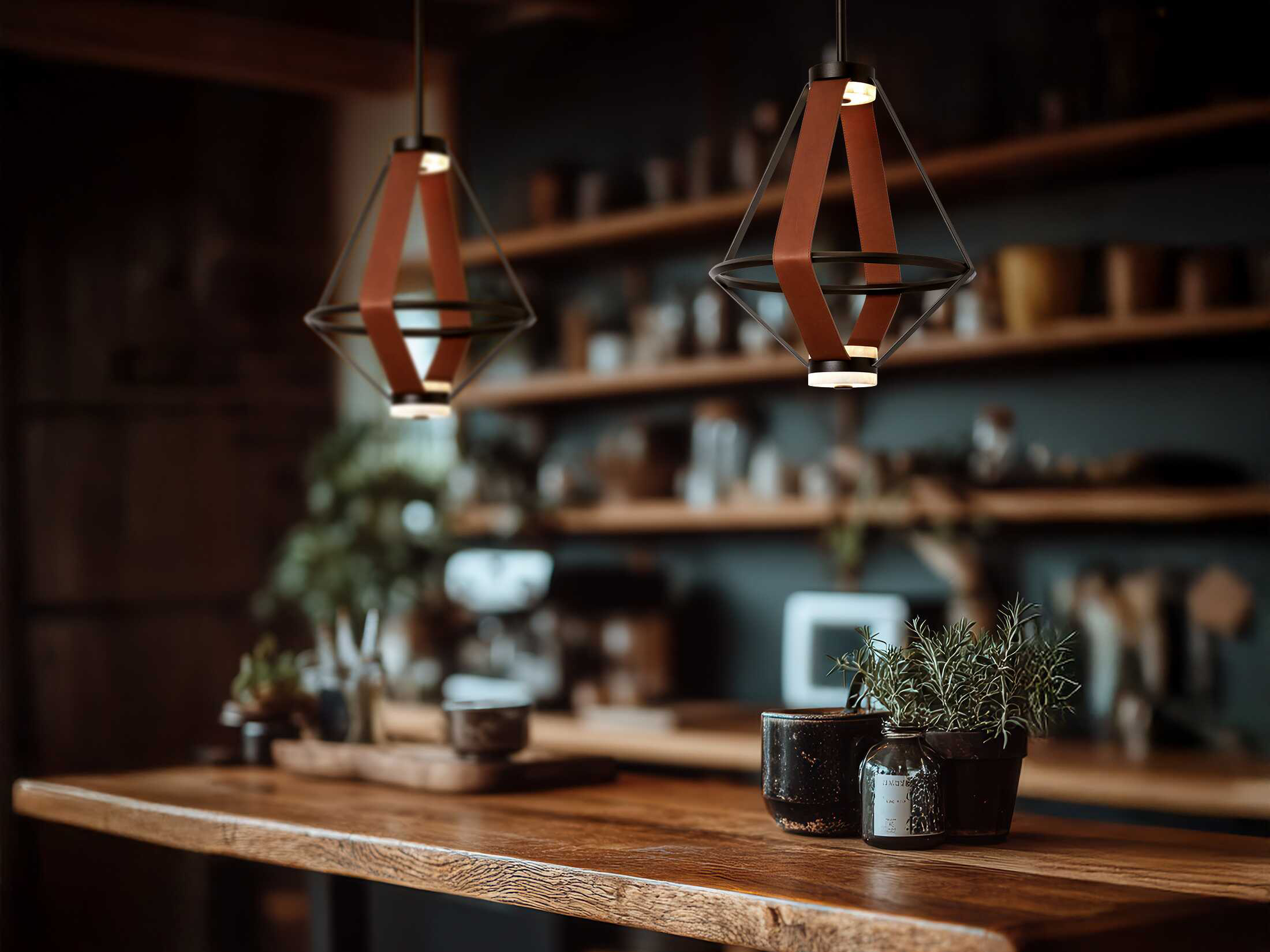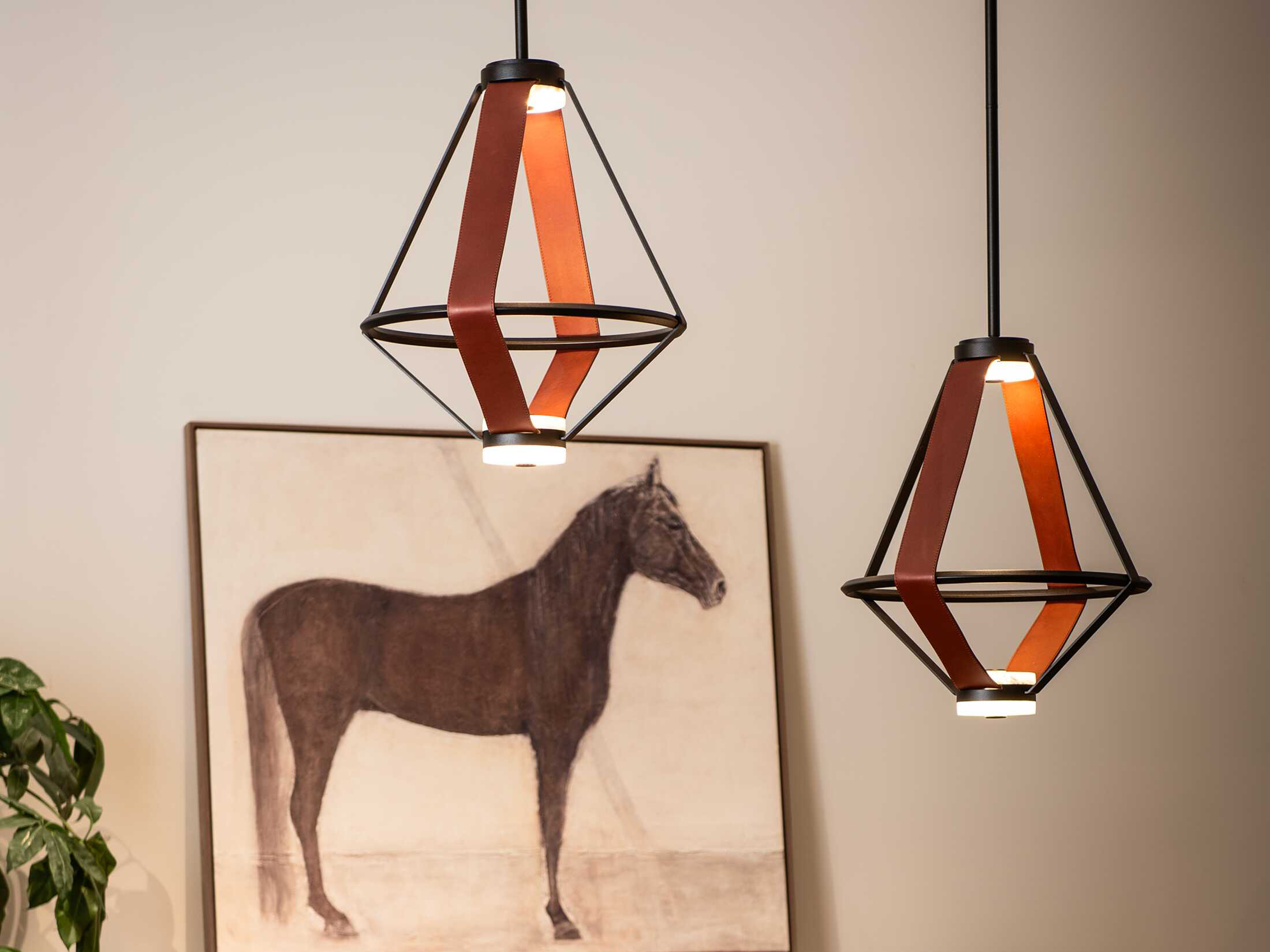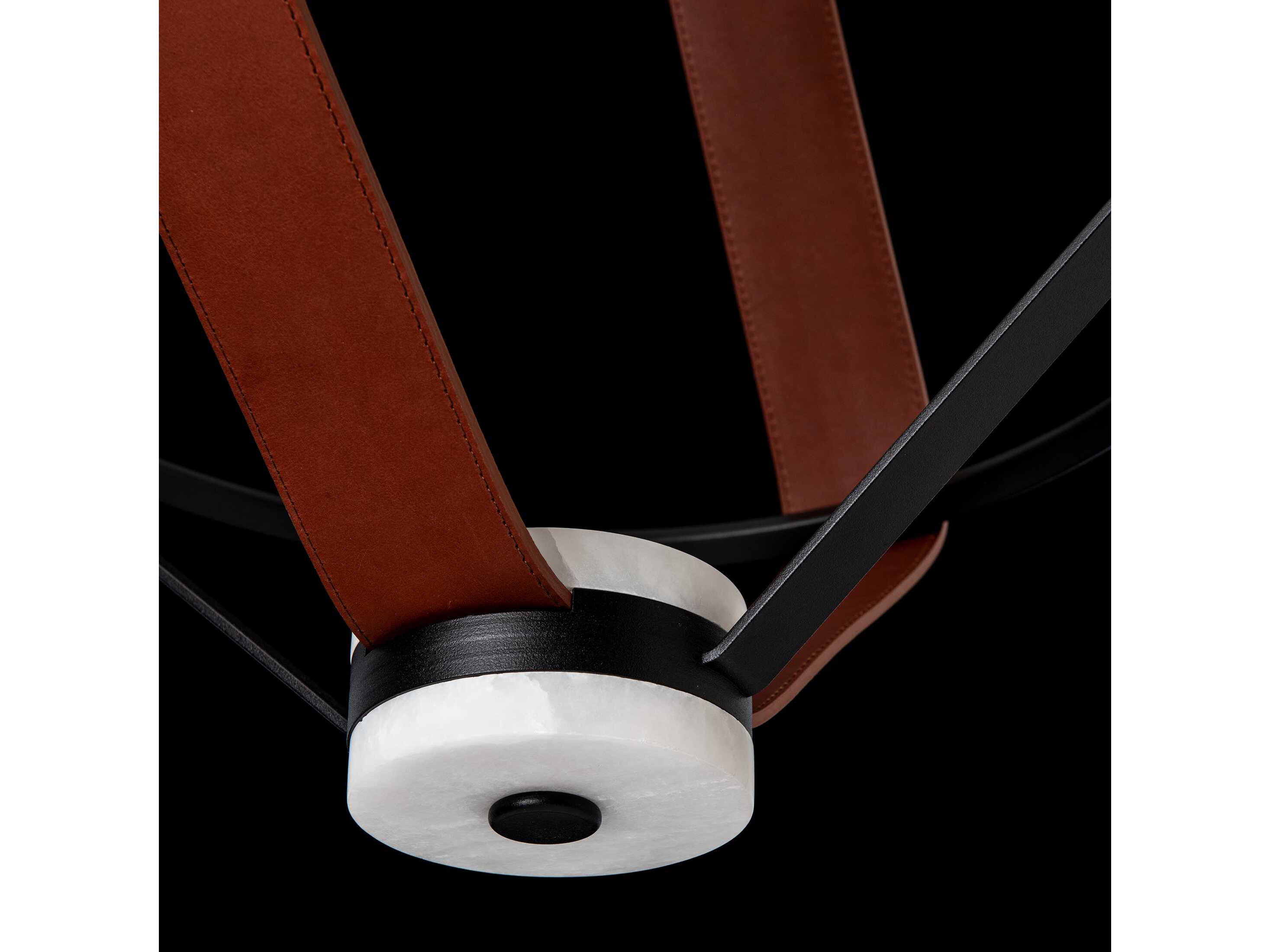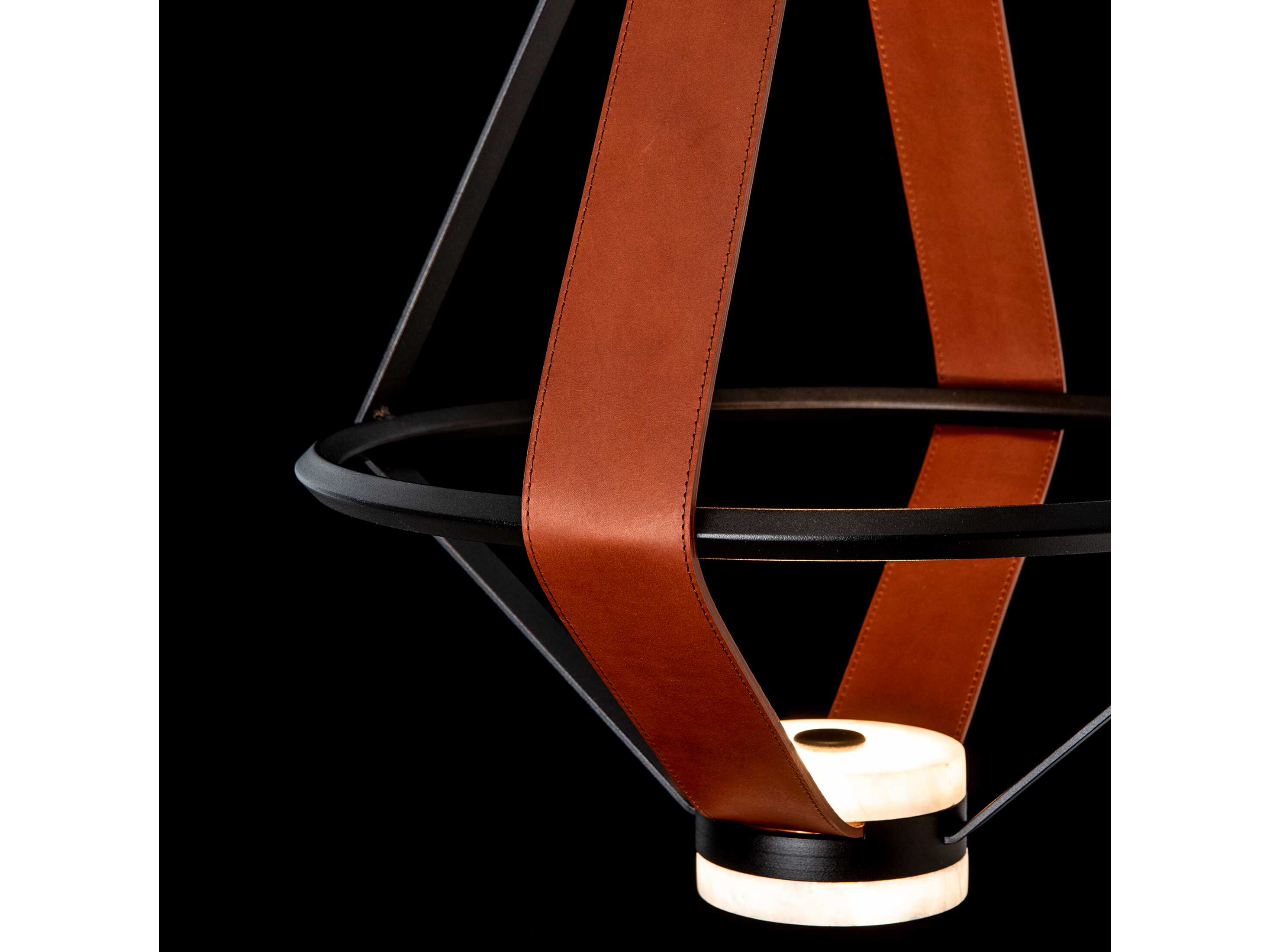 This mixed materials pendant is a focal piece in any space. With artisanally-crafted wide leather strapping, 3 natural alabaster stone "puck" shaped LED diffusers, and a beautiful bevelled-edge inner ring, this large Aspen Lantern is open and airy as it draws your attention. Its geometric shape is completed by the simple metal "straps" at counterpoint with the leather.