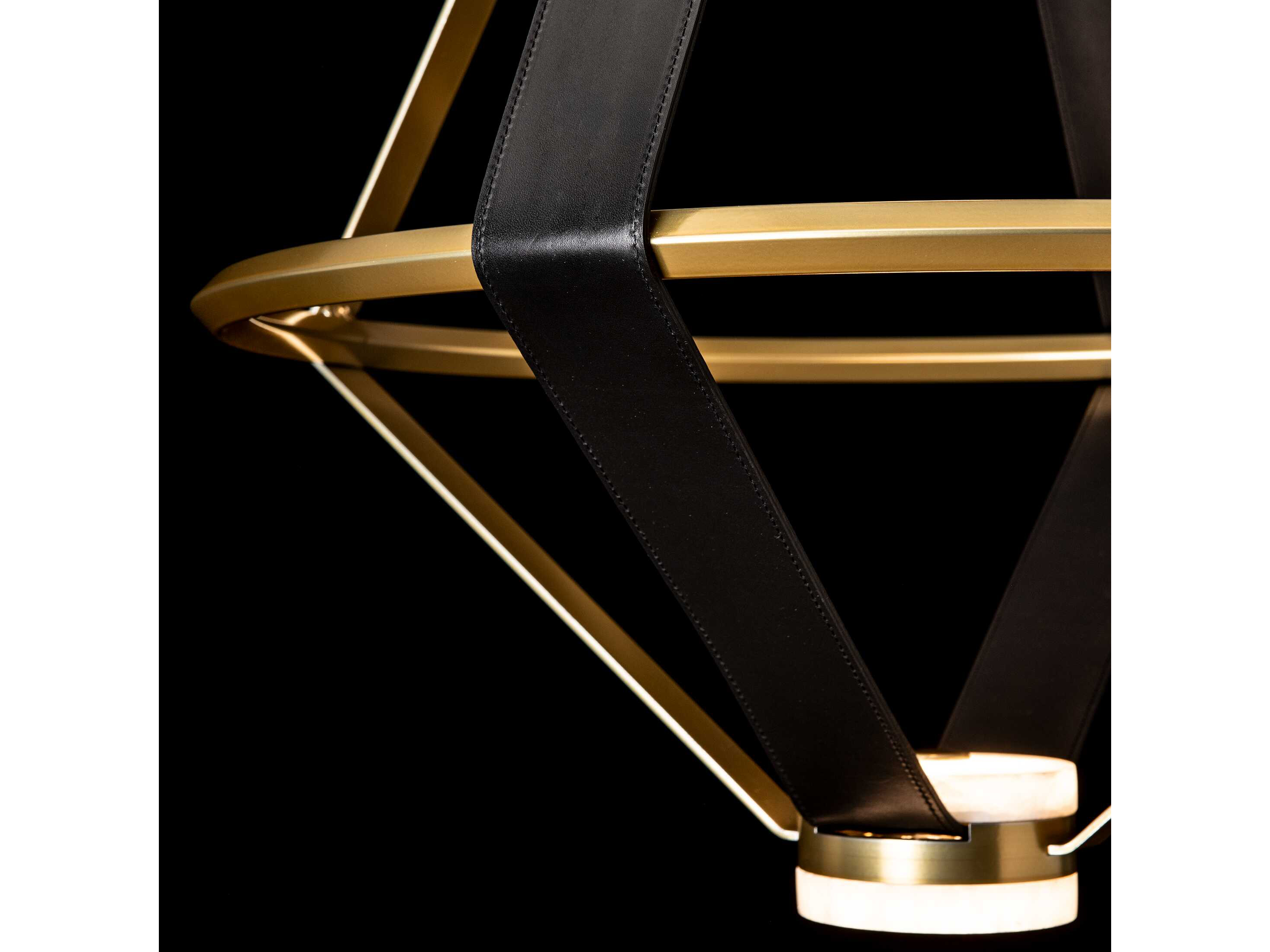 This mixed materials pendant is a focal piece in any space. With artisanally-crafted wide leather strapping, 3 natural alabaster stone "puck" shaped LED diffusers, and a beautiful bevelled-edge inner ring, this large Aspen Lantern is open and airy as it draws your attention. Its geometric shape is completed by the simple metal "straps" at counterpoint with the leather.