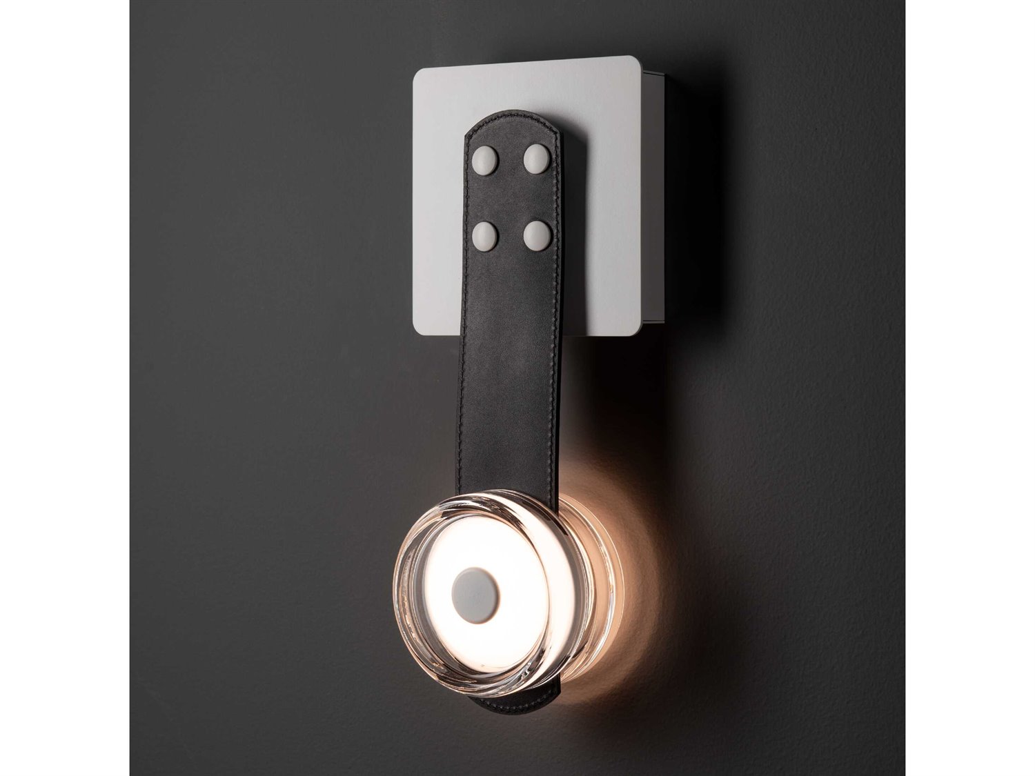 - Modular LED wall sconce with leather strap and alabaster details. Includes one alabaster LED module, a leather strap and a square steel wall mount. Alabaster is a natural material and comes in a wide variety of color and marks. No two pieces are the same.