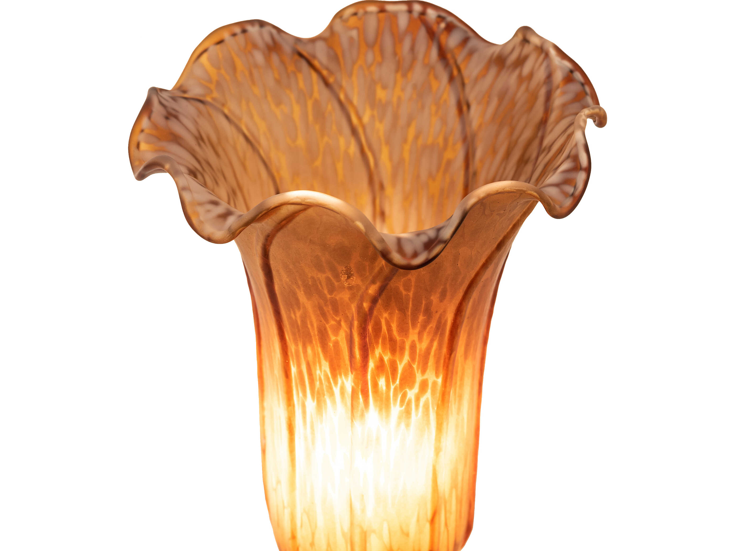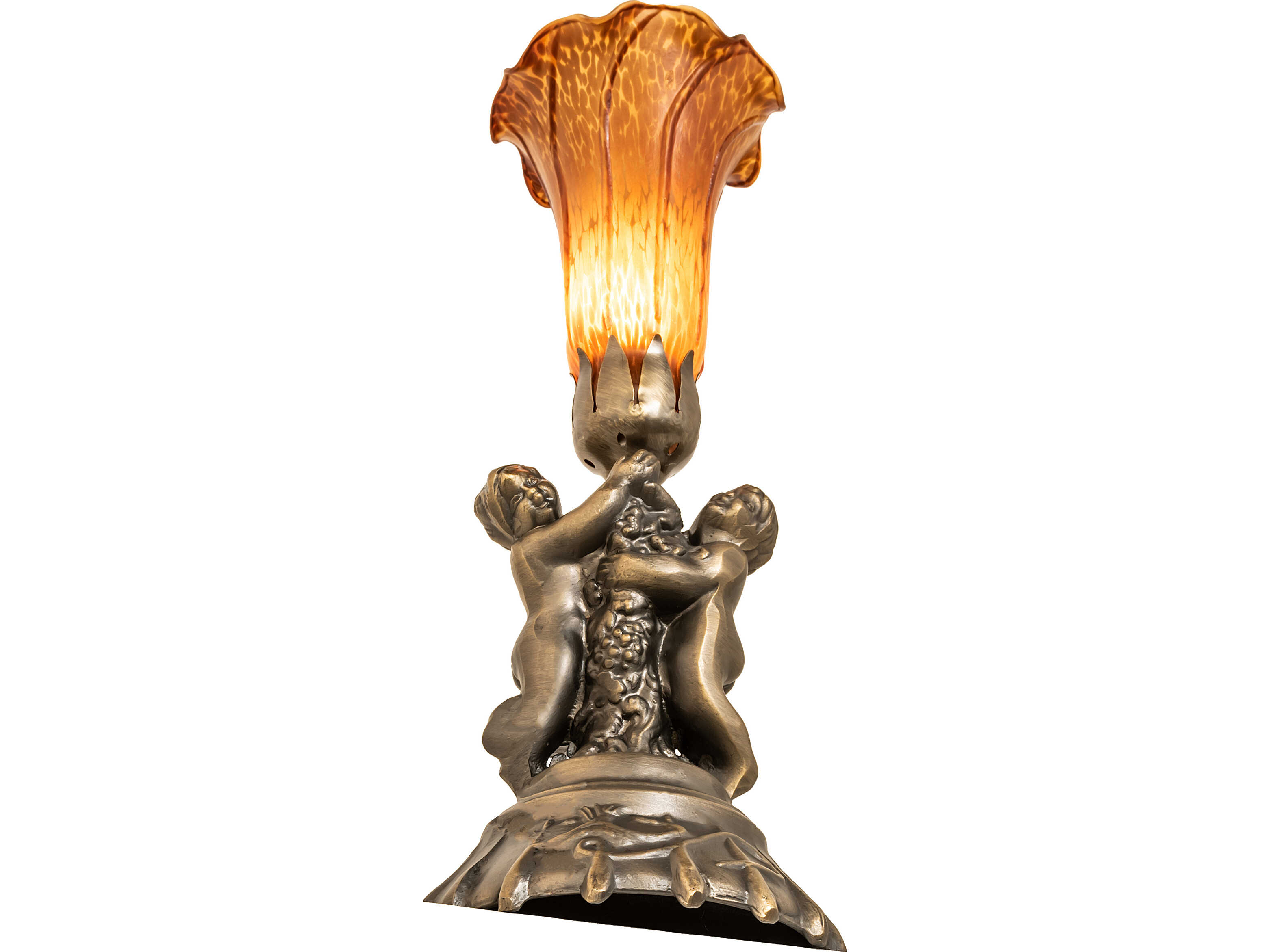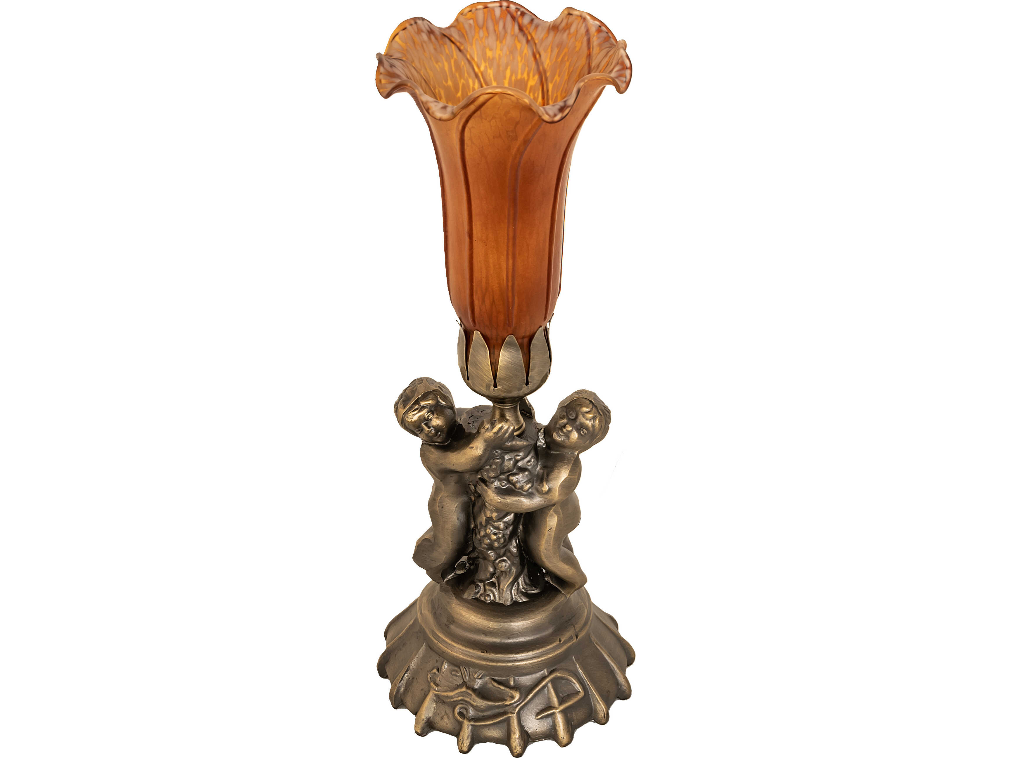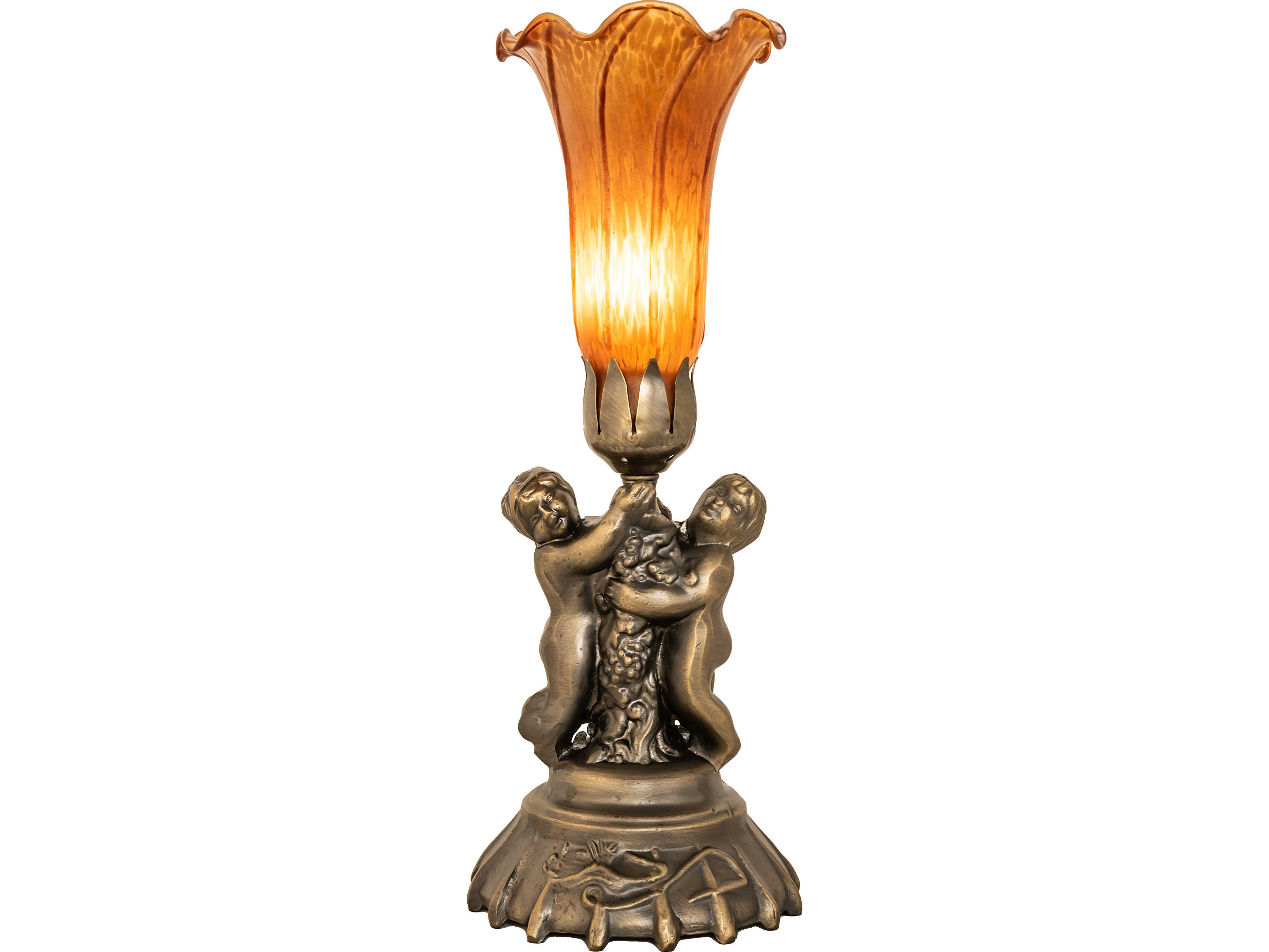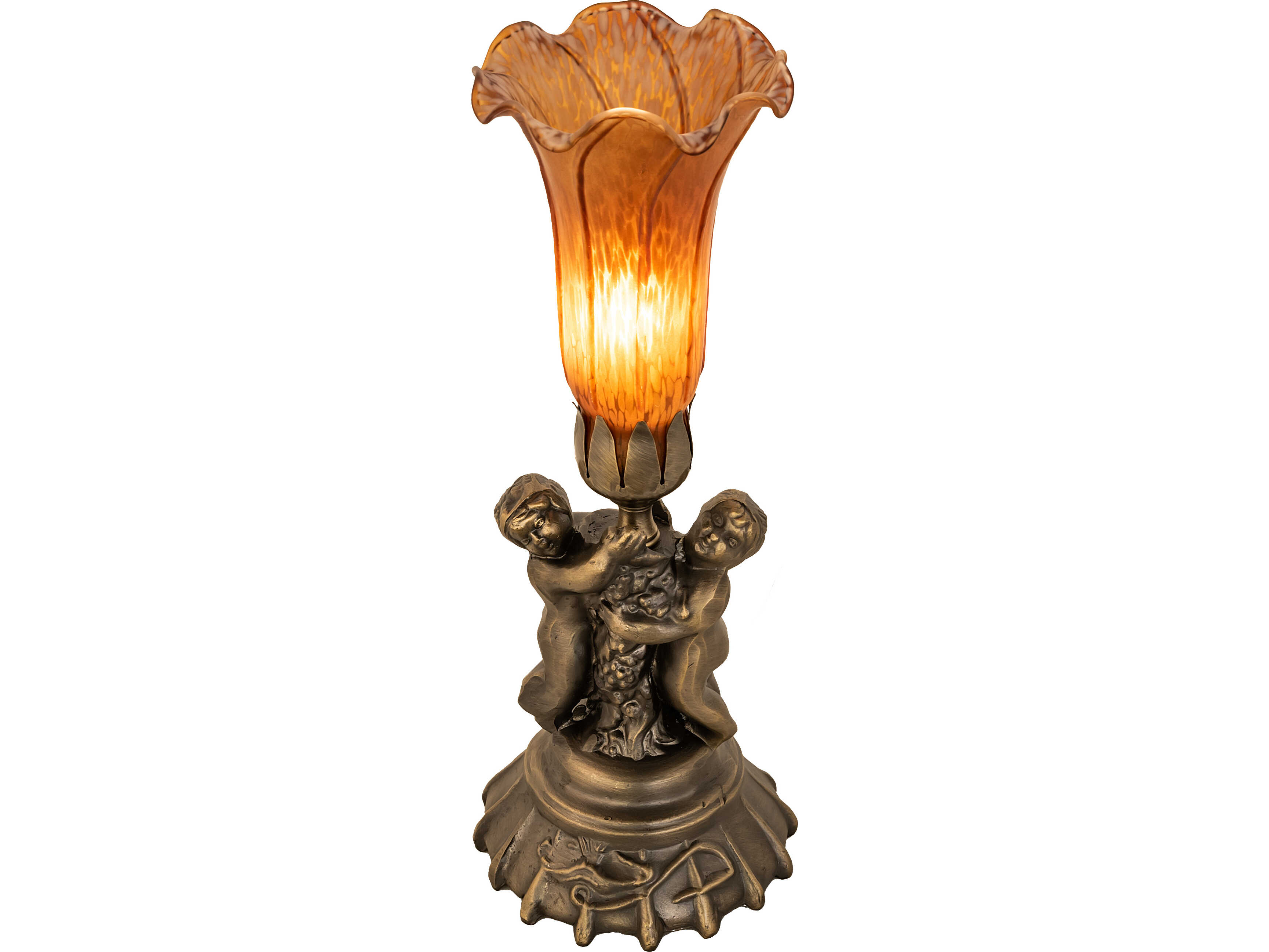 Inspired by the famous Tiffany design from the early 1900s. This mini lamp features a stunning shade mouth blown of fine Amber art glass. The Pond Lily shade is embraced by an elegant cast base featuring two cherubs finished by hand in Antique Brass. The Pond Lily Table Lamp is featured in our American designed; handcrafted Favrile Glass Collection. UL and cUL listed for dry locations. Each shade is a unique work of art with color variations based on natural ingredients inherent in the glass. Contact us if color matching is critical when ordering multiple items.