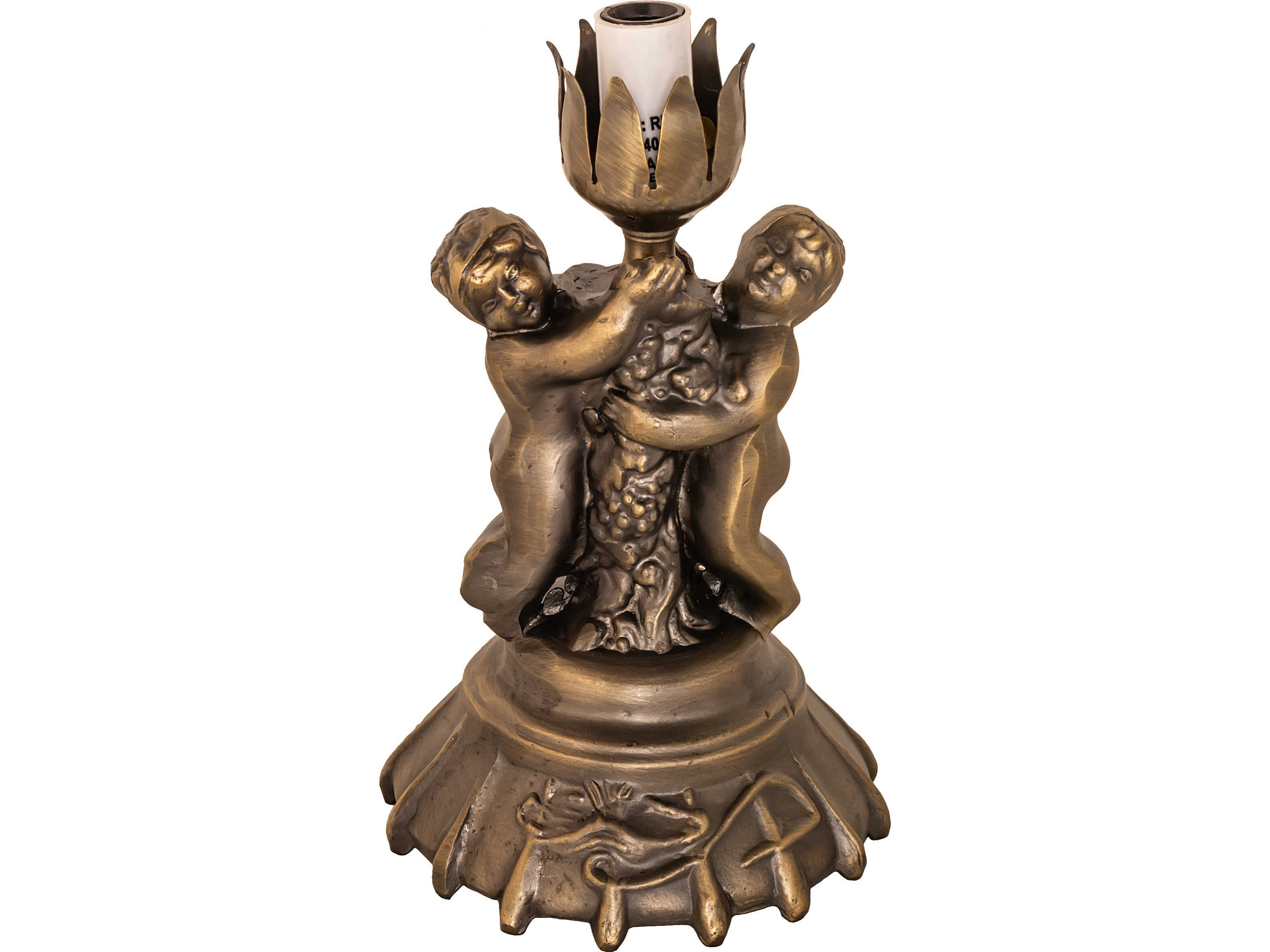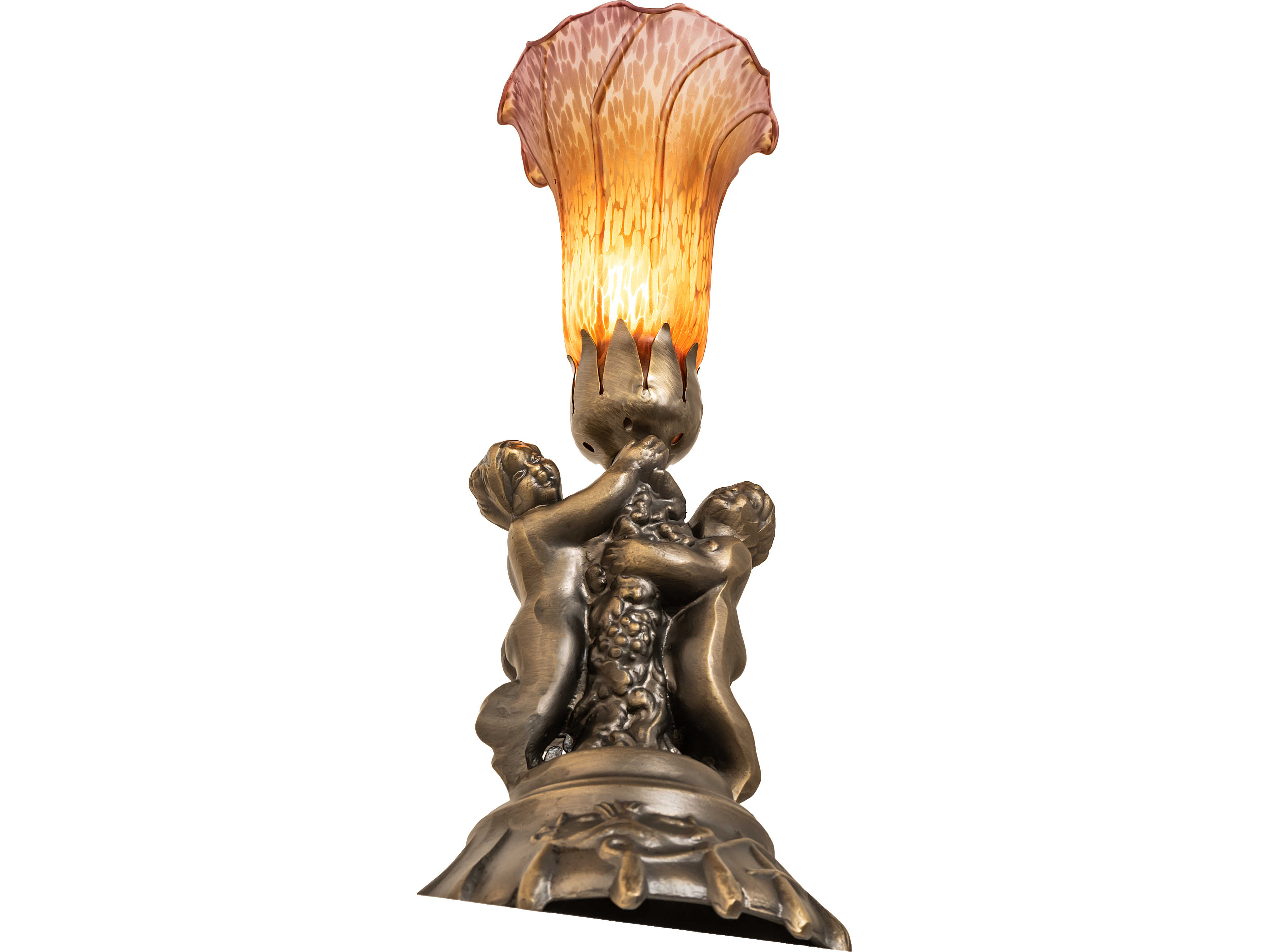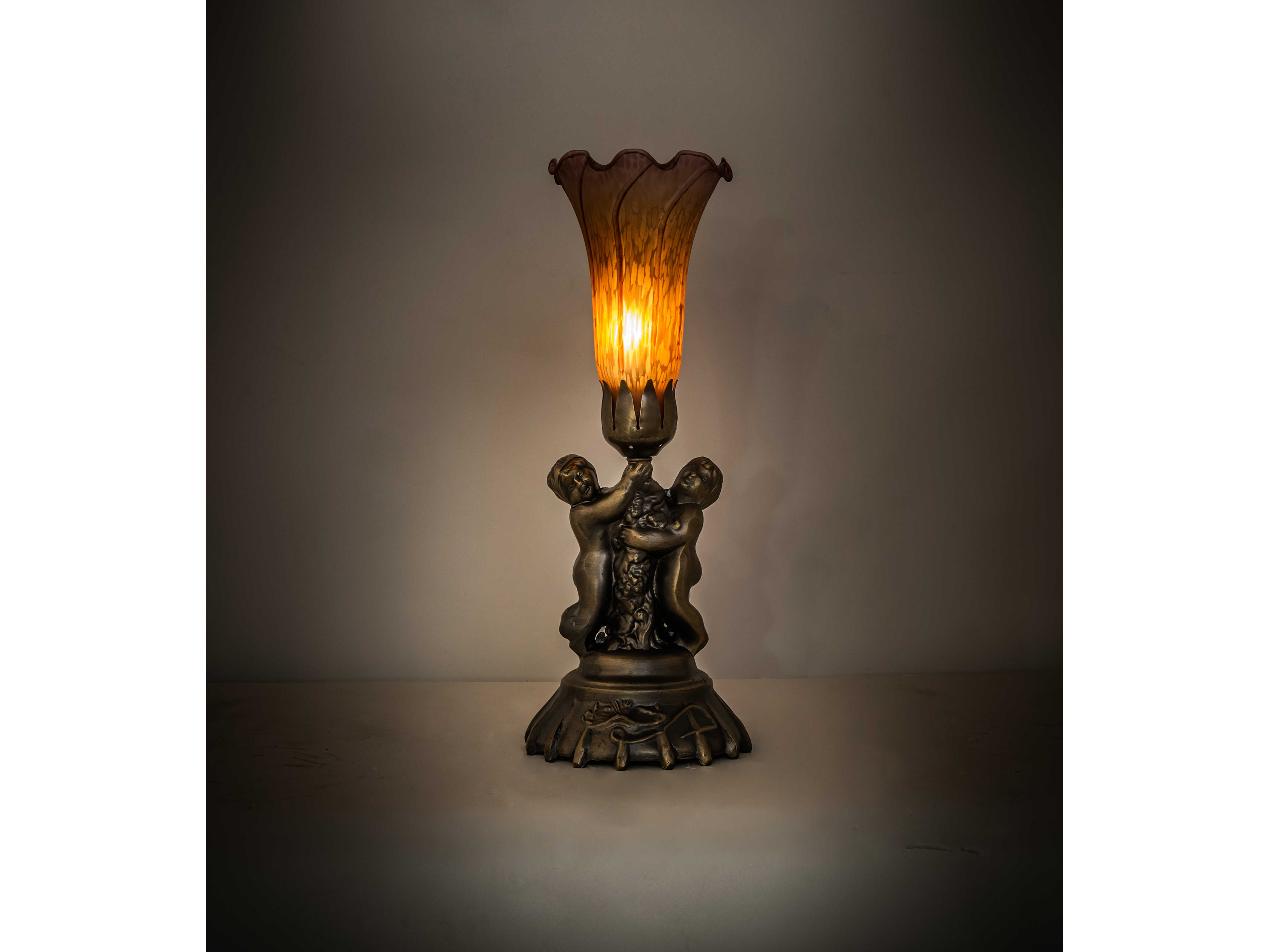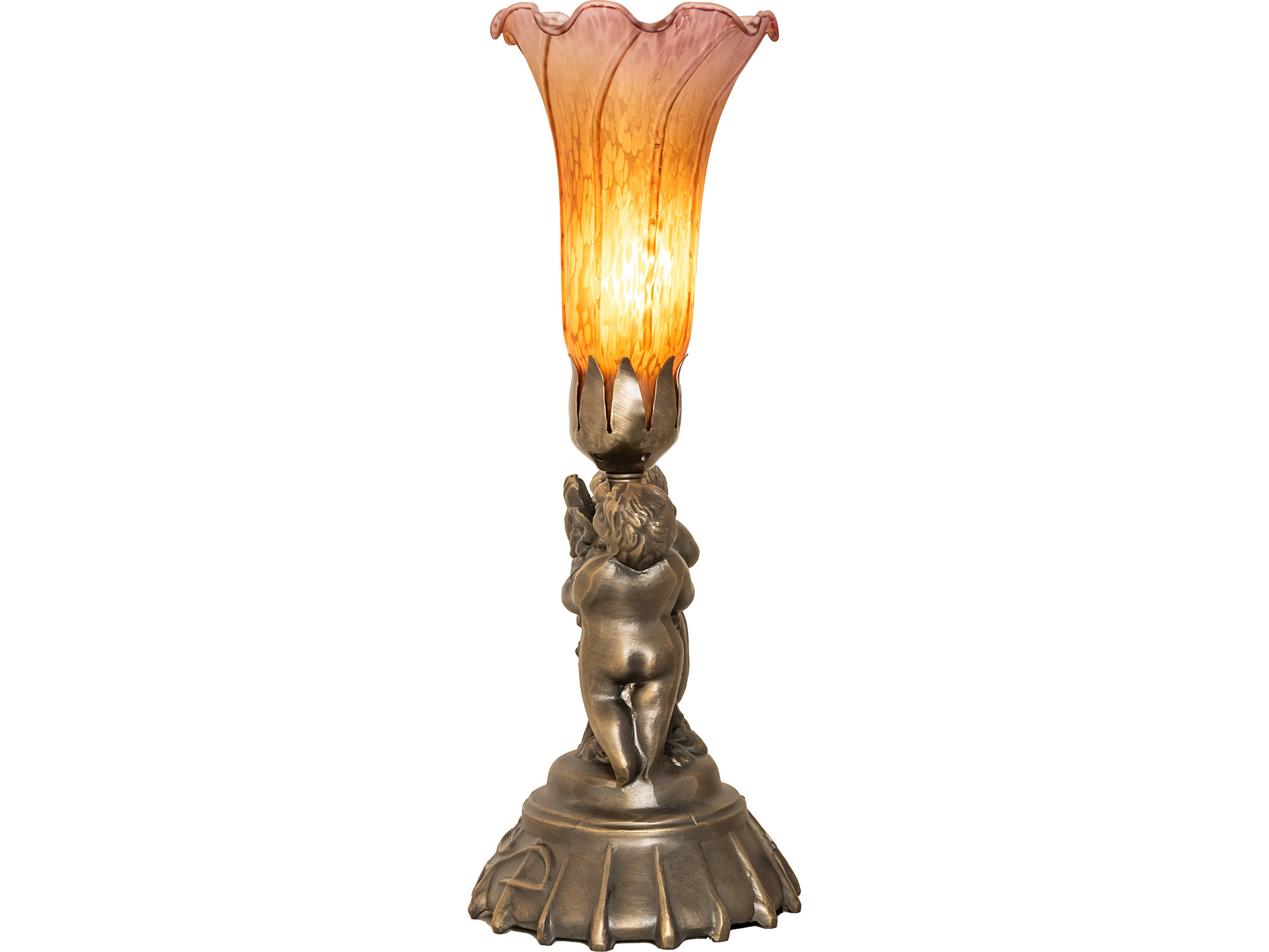 Inspired by the famous Tiffany design from the early 1900s. This mini lamp features a stunning shade that is mouth blown of Amber and Purple art glass. The Pond Lily shade is embraced by an elegant cast base featuring two cherubs finished by hand in Antique Brass. The Pond Lily Mini Lamp is featured in our American designed; handcrafted Favrile Glass Collection. UL and cUL listed for dry locations. Each shade is a unique work of art with color variations based on natural ingredients inherent in the glass. Contact us if color matching is critical when ordering multiple items.