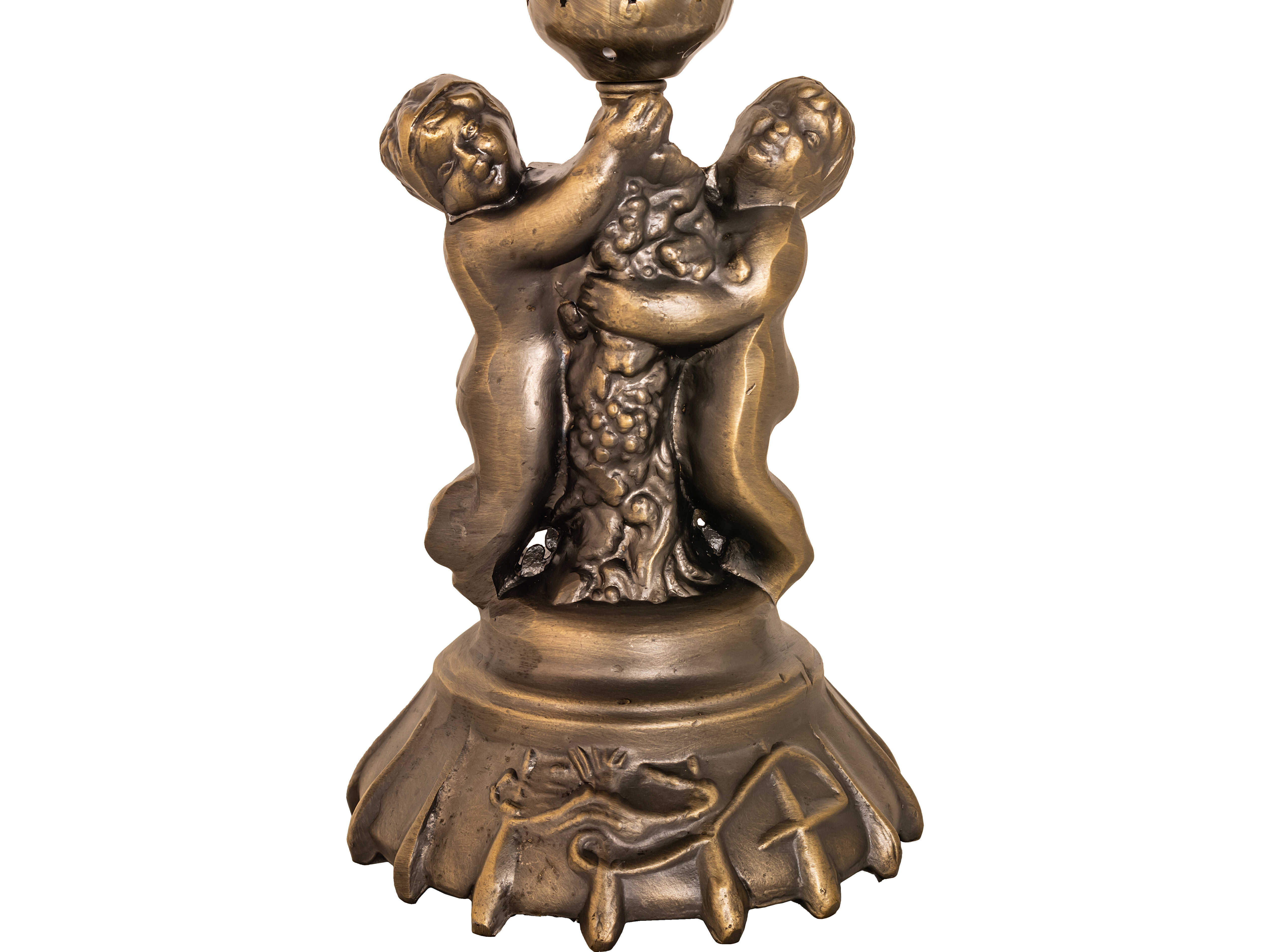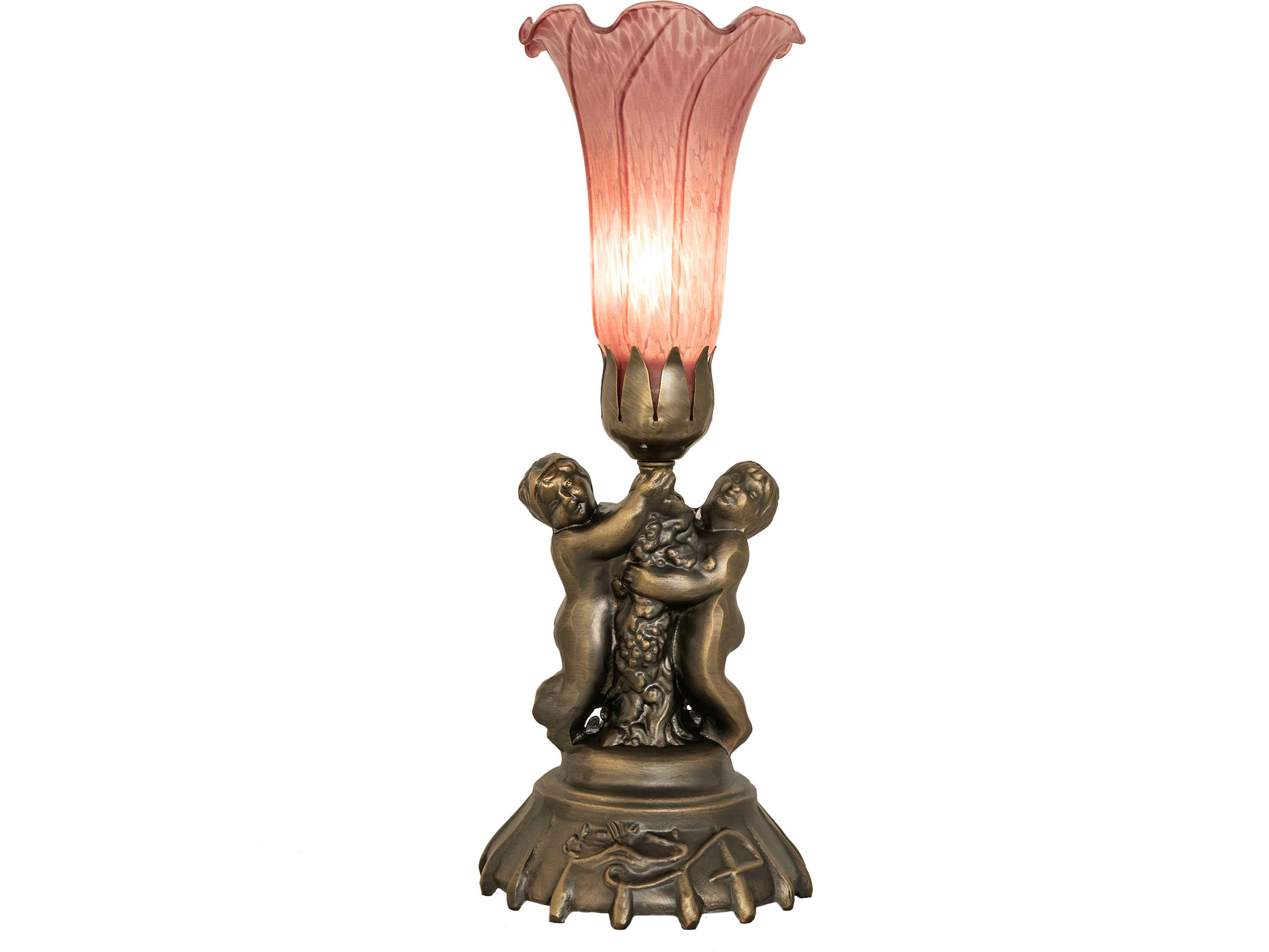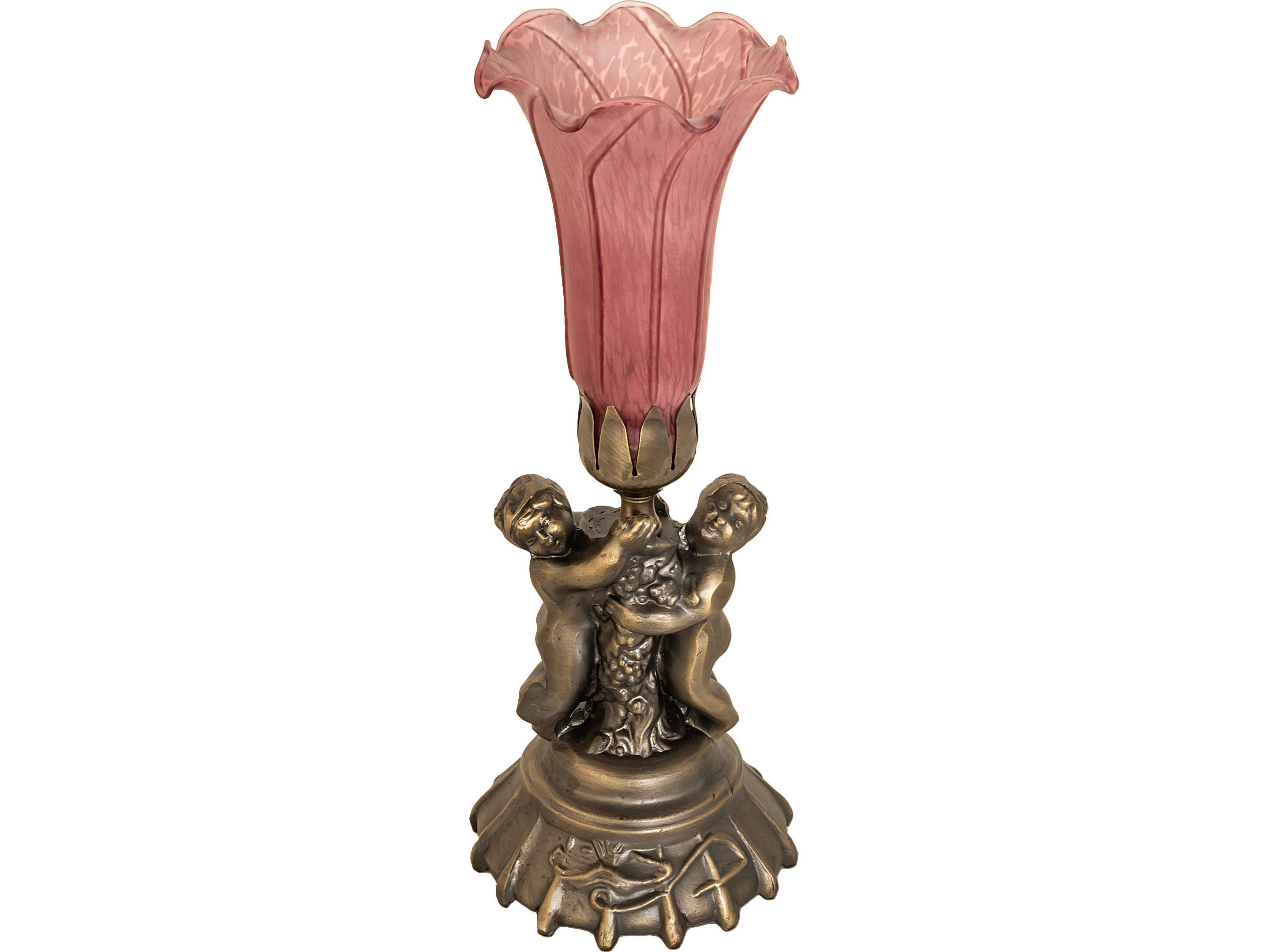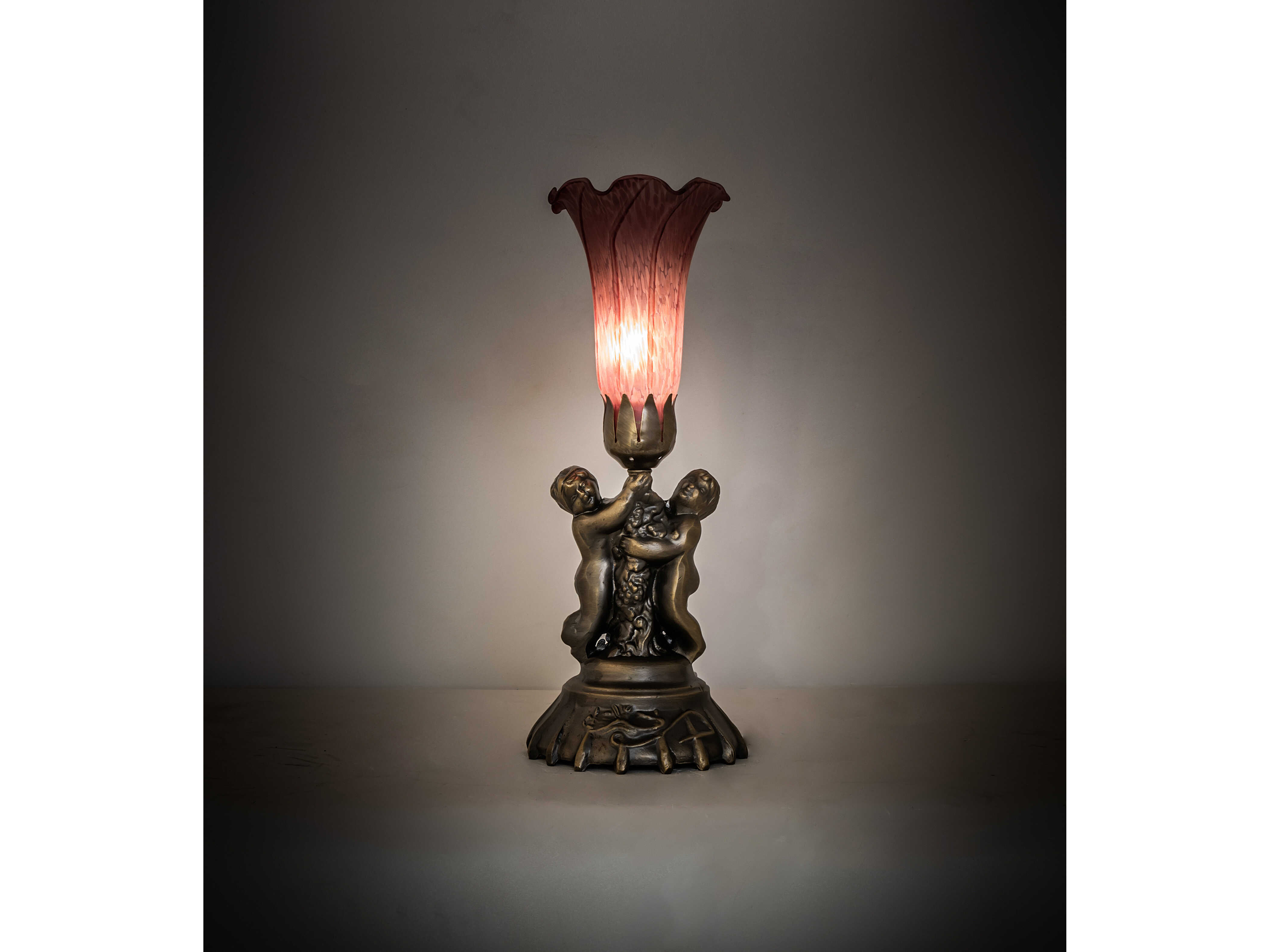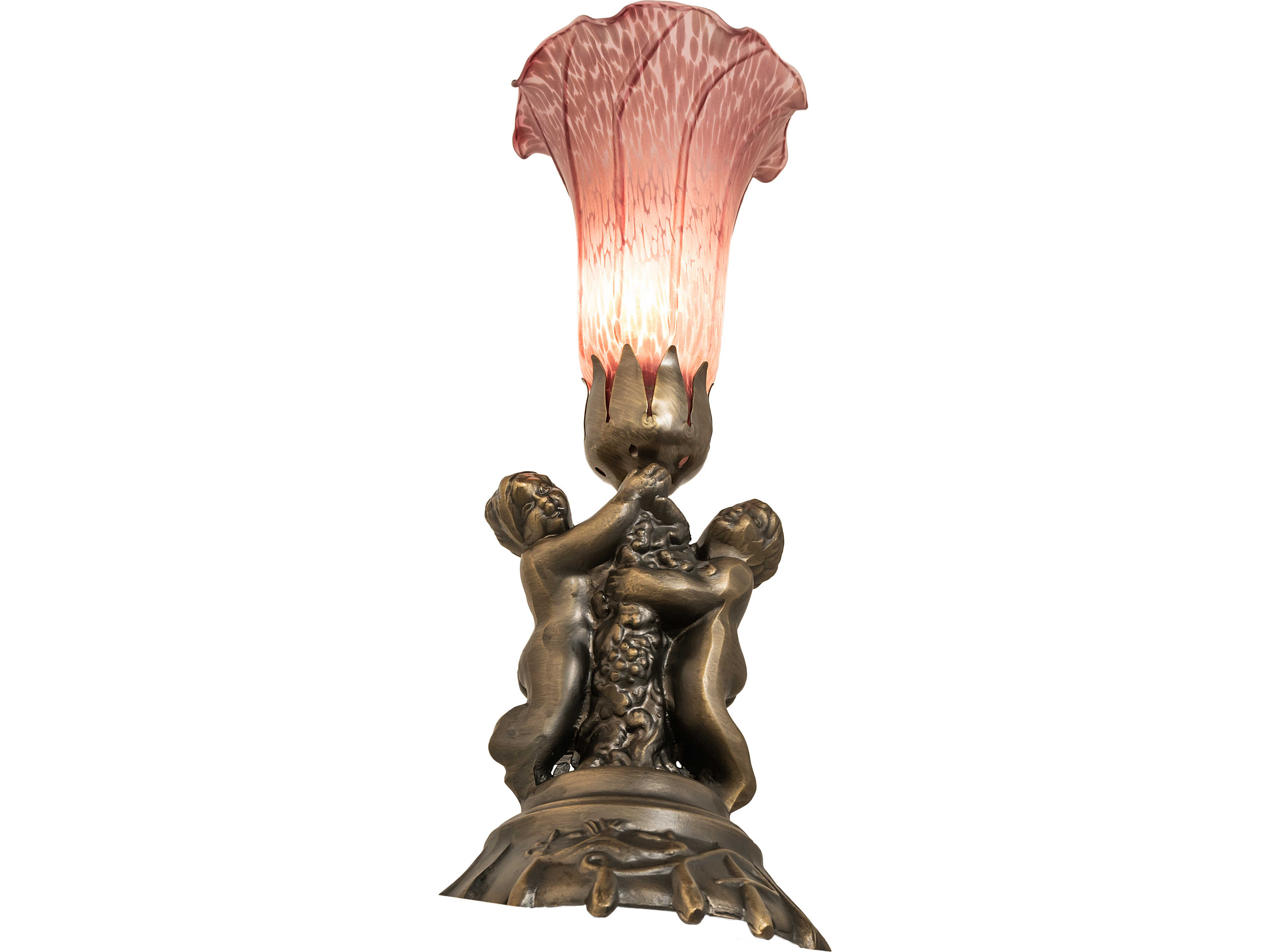 Inspired by the famous Tiffany design from the early 1900s. This mini lamp features a stunning shade that is mouth blown of Lavender art glass. The Pond Lily shade is embraced by an elegant cast base featuring two cherubs finished by hand in Antique Brass The Pond Lily Mini Lamp is featured in our American designed; handcrafted Favrile Glass Collection. UL and cUL listed for dry locations. Each shade is a unique work of art with color variations based on natural ingredients inherent in the glass. Contact us if color matching is critical when ordering multiple items.