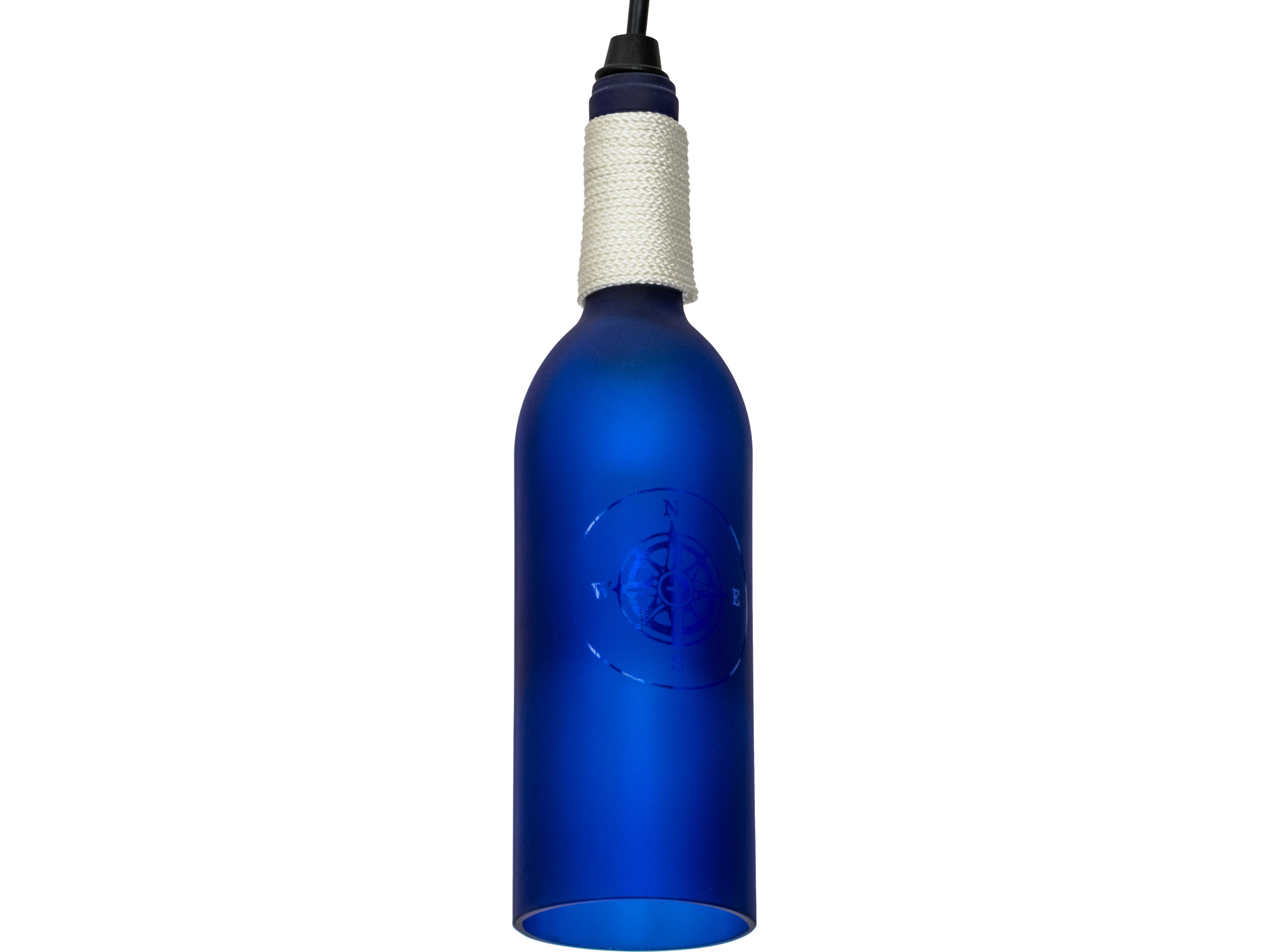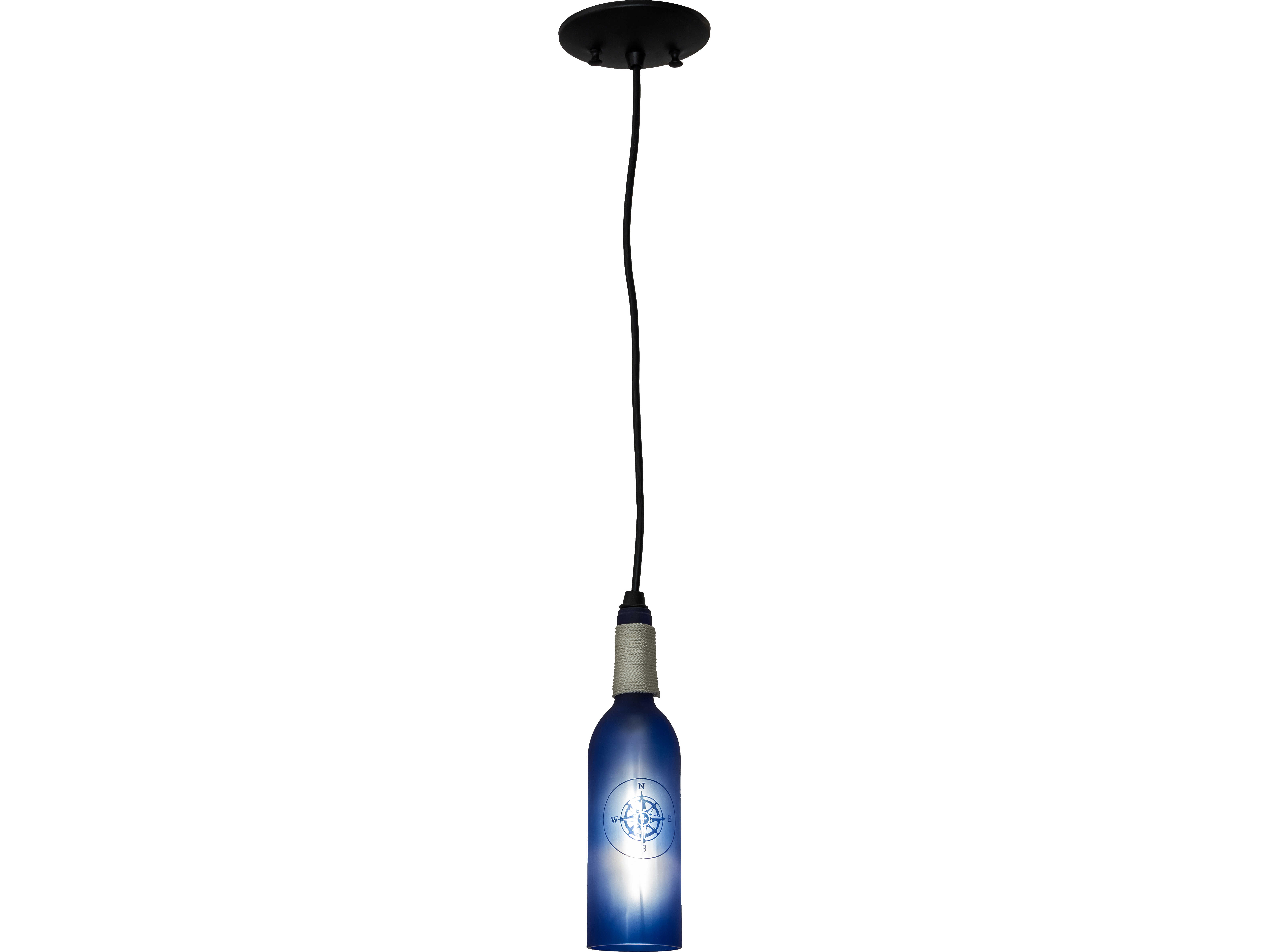 Connoisseurs will appreciate the detail and flavor of this customized; nautical-designed Wine Bottle Pendant. Hand-wrapped nautical rope accents this Blue Frosted Glass wine bottle; which has been softly etched with a stunning Compass lighting design. Liven up a restaurant; club; or home with a light fixture that does so much more than deliver light; it adds personality and pizzazz. This wine bottle is embraced by a solid metal frame hand-finished in Textured Black. Place the mini pendant individually or in multiples across a bar; island; or counter for a stunning design statement. The overall height ranges from 16 to 71 inches; as the cord can be adjusted in the field to meet your exact lighting requirements. This rich-looking Coastal Compass Wine Bottle Mini Pendant is included in our American-made; American-designed; handcrafted Wine Bottle Lighting Collection. The fixture is manufactured in Yorkville; New York. UL and cUL listed for dry and damp locations. Take your finest bottle of wine; and Meyda will transform it into an everlasting personalized fixture of light. Contact us for more information on custom wine bottle lighting fixtures and lamps. You can also create custom lighting with beer bottles; mason jars; milk bottles; and other glass containers and vessels by contacting us!