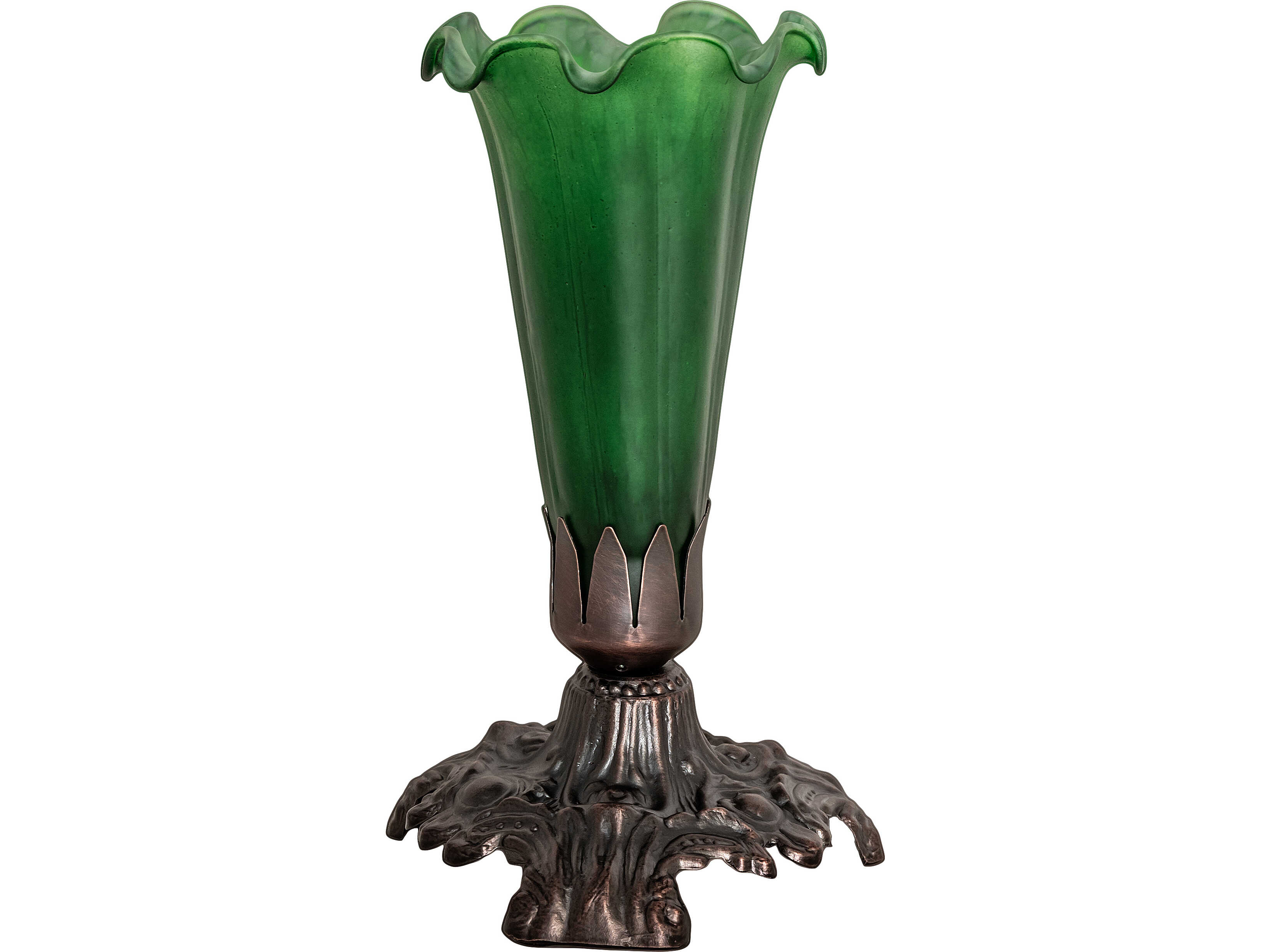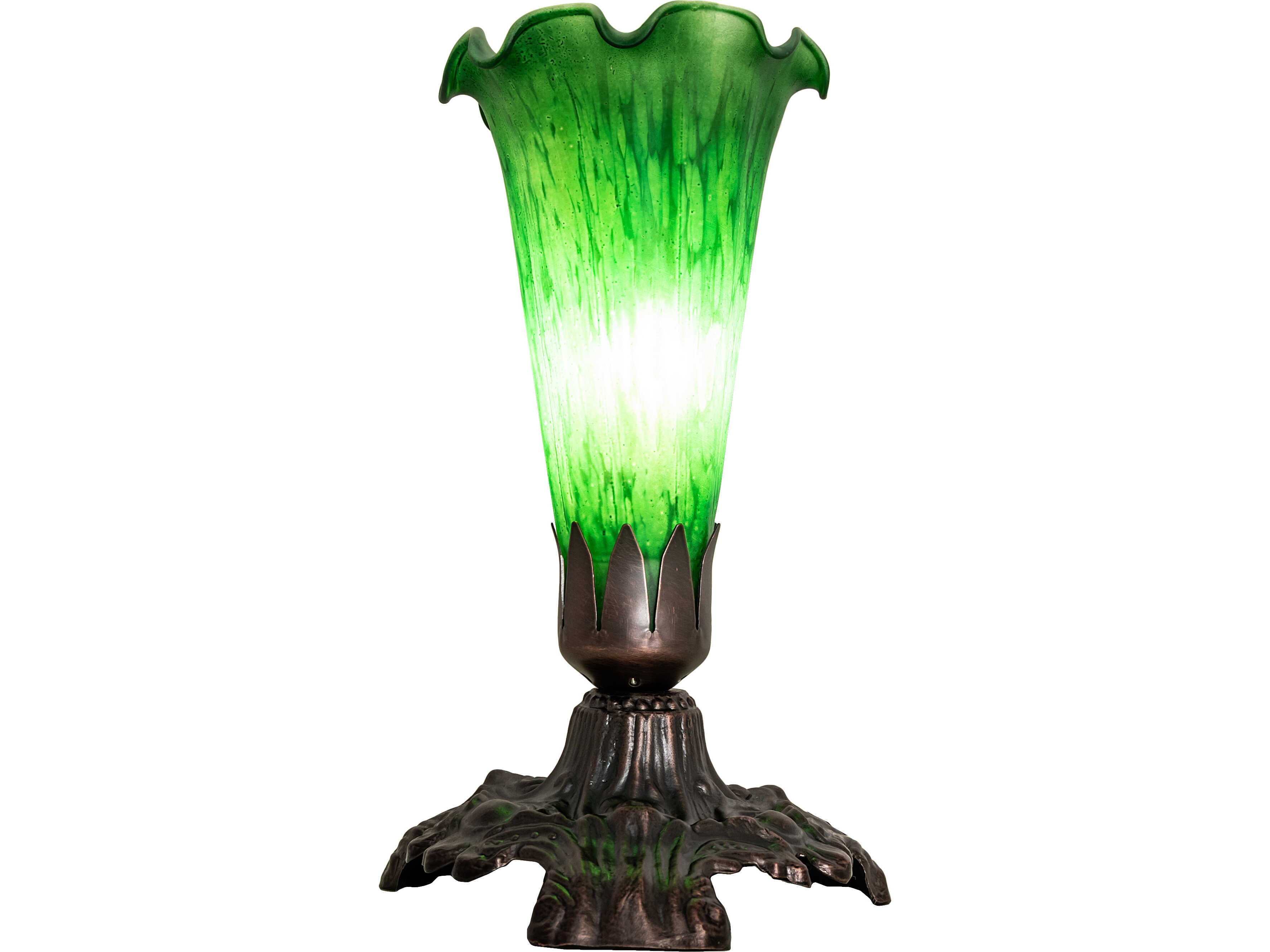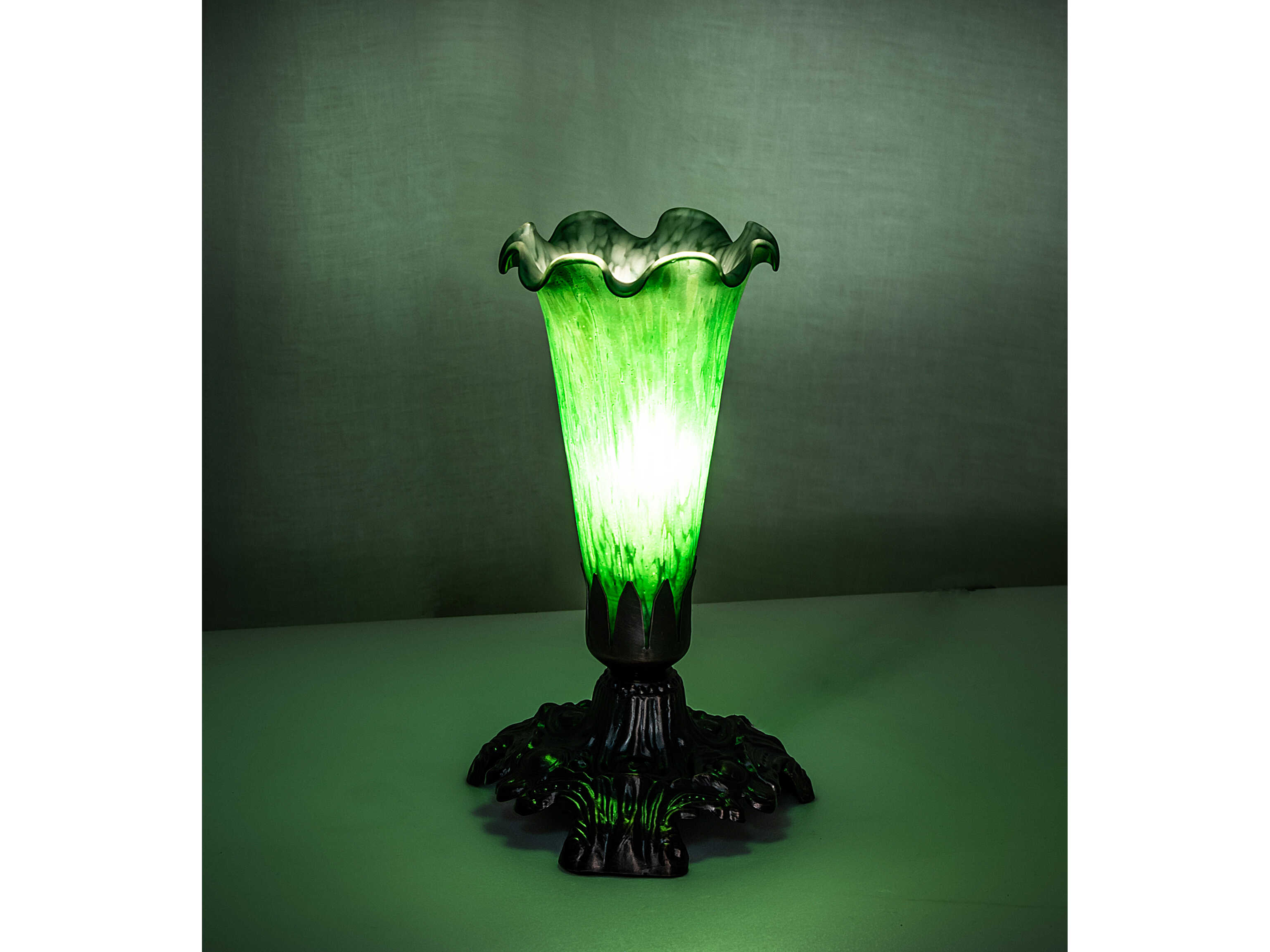 Re-creating Tiffany's famous Favrile design from the early 1900's... This mini lamp offers an attractive; delicate design featuring a shade that is mouth blown of fine Green art glass. The Lily shade is seated in an elegant Victorian cast metal base finished by hand in Mahogany Bronze. The Pond Lily Victorian Mini Lamp is included in our American designed; handcrafted Favrile Lighting Collection. UL and cUL Listed for dry locations. Each shade is a unique work of art with color variations based on natural ingredients inherent in the glass. Contact us if color matching is critical when ordering multiple items.
