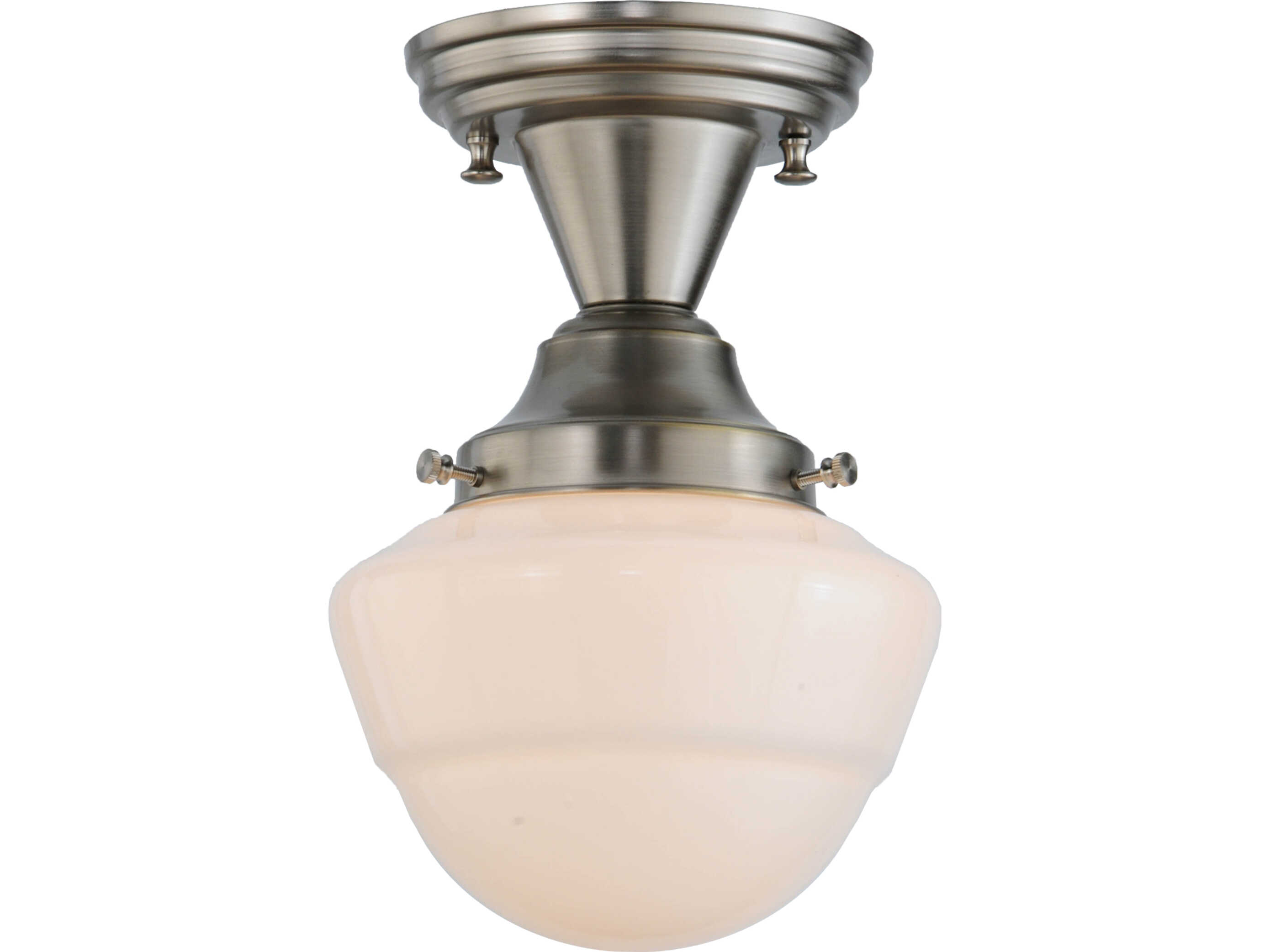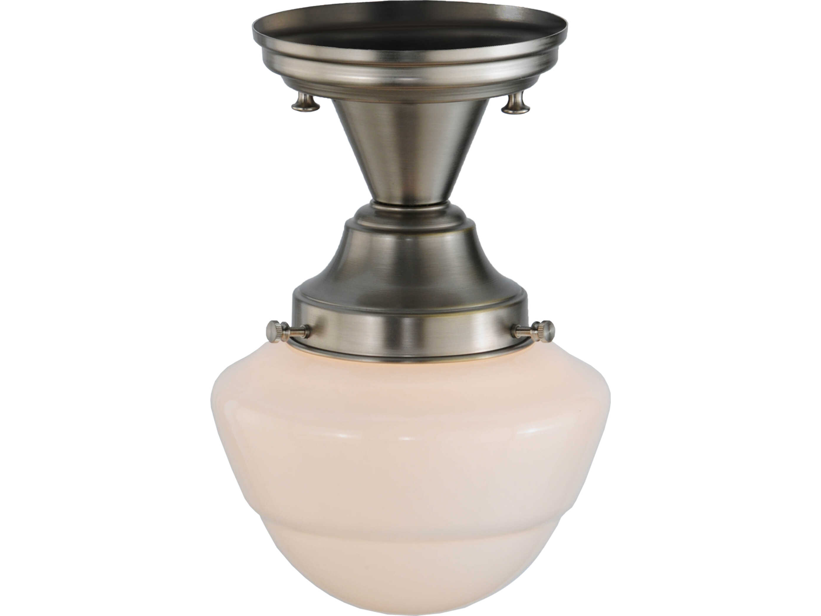 The Revival Schoolhouse glass reflects an authentic classic design. A perfectly formed shade is handcrafted of White Opal Schoolhouse Glass with rich artisanship and style. Originally used in private residences; schools; galleries and libraries; this Schoolhouse electrical reproduction will illuminate a broad range of interiors today. The Brass ceiling fixture is enhanced with a Brushed Nickel finish and provides beautiful ambient lighting. The Revival Schoolhouse Semi-Flushmount is included in our American-designed; handcrafted Schoolhouse Lighting Collection. UL and cUL listed for dry and damp locations.