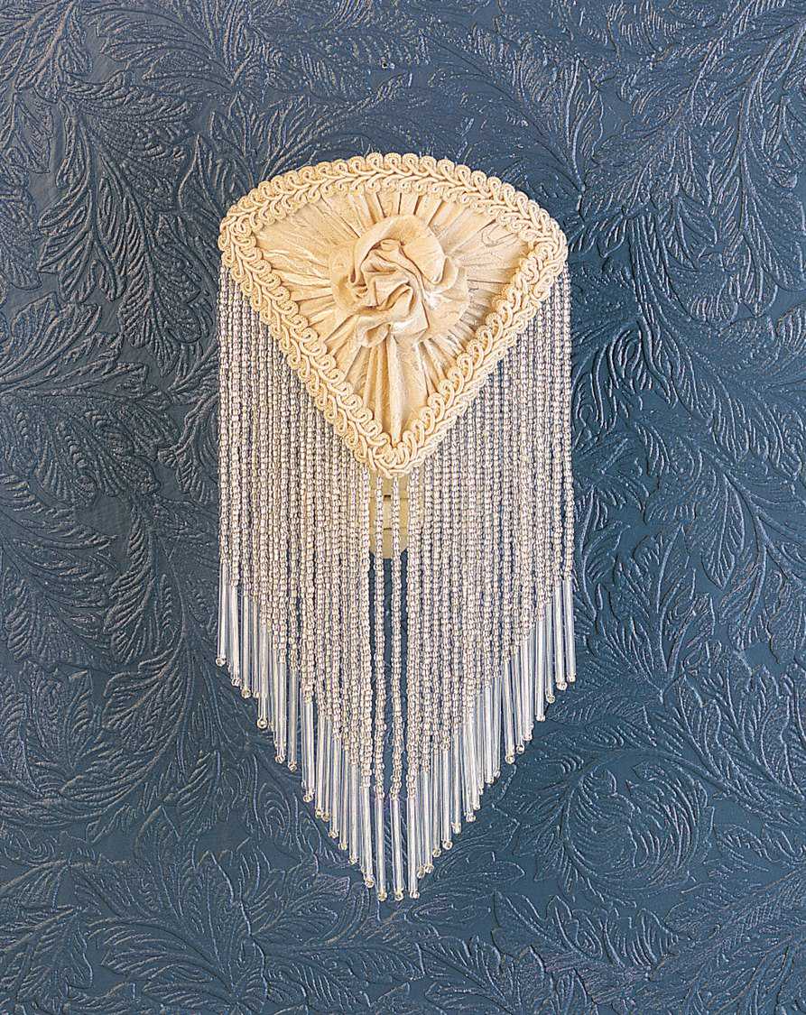 Soft Ivory floral patterned fabric; edged in long strands of real glass beads is knotted across a gracefully curving form. This Victorian inspired night light adds a touch of elegance to your darkest night.