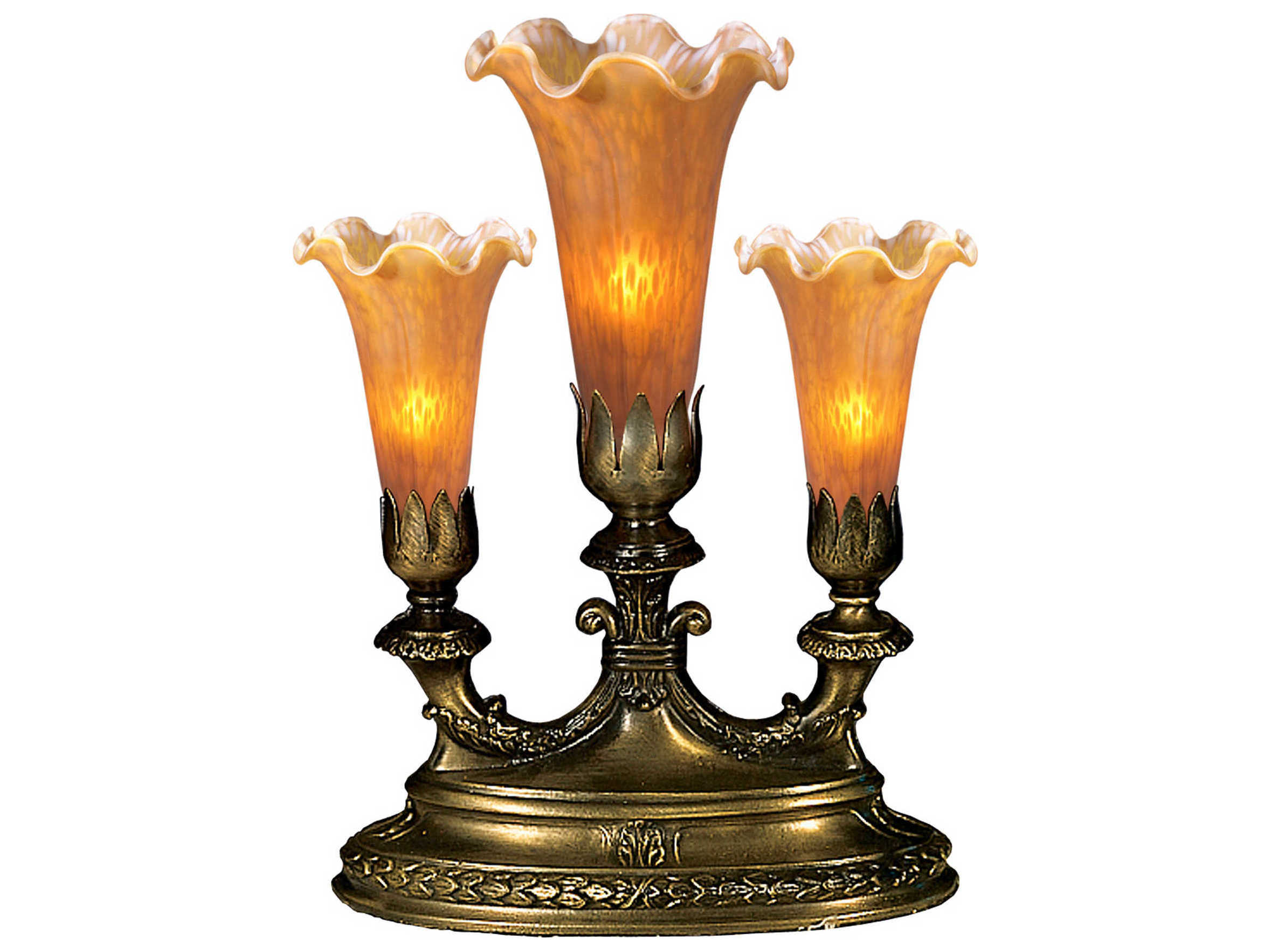 One of the most popular Louis Comfort Tiffany styled lamps on the market today; recreating his famous Favrile design from the early 1900's. This mottled rich Amber shaded Three Light Mantelabra offers an attractive; delicate design featuring shades mouth blown of fine art glass. Lily shades are seated in an elegant base finished by hand in Mahogany Bronze.