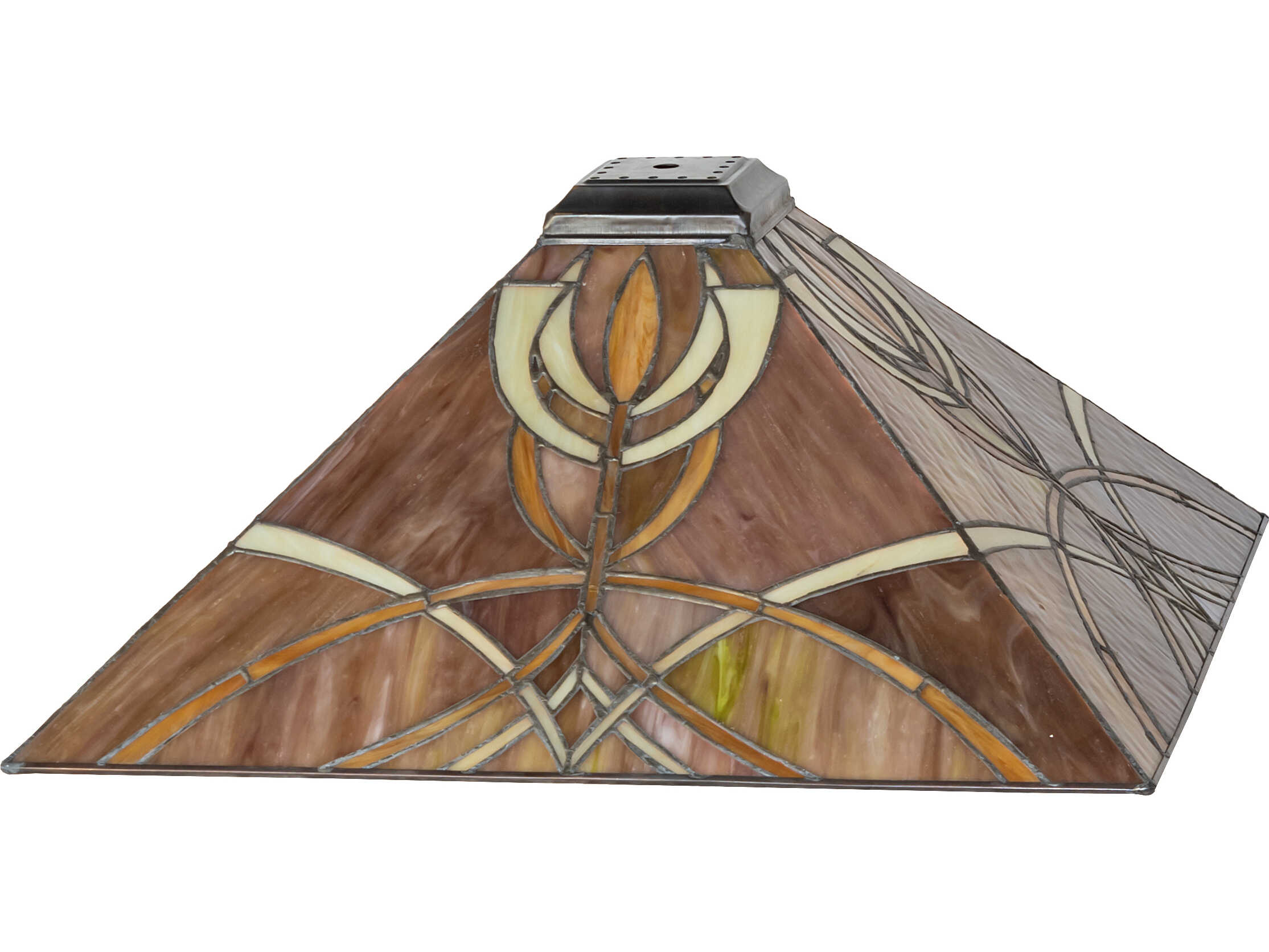 This Meyda Tiffany original is inspired by the art and architecture of Charles Rennie Mackintosh and the Glasgow school of art. Amber-Mauve and Gold stained glass make up the intricate patterned shade.
