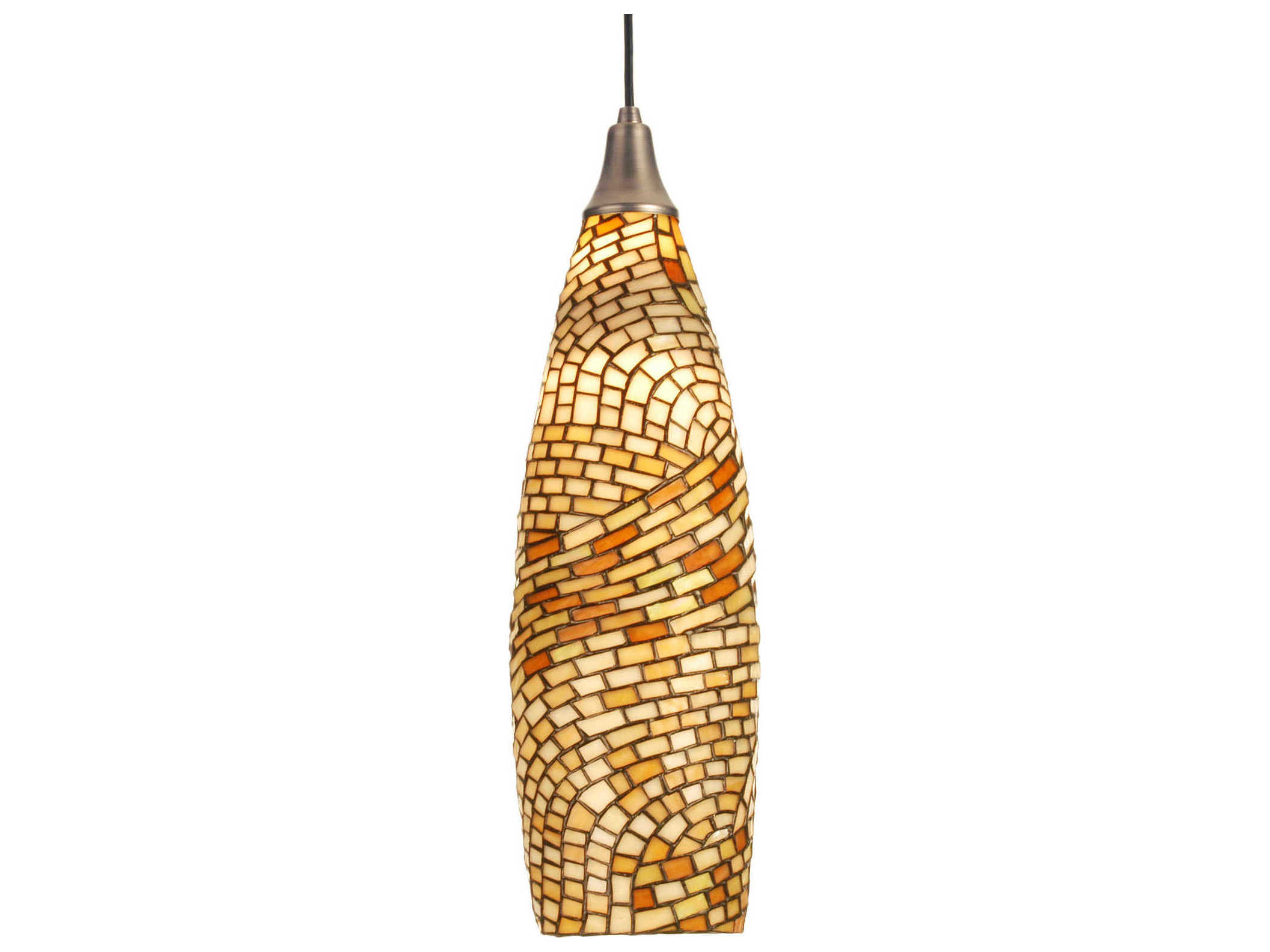 This contemporary Tiffany style shade is handcrafted by the same copper foil construction method invented by the master himself; but the elongated teardrop shape of the shade is far from traditional. This unique shade is a Meyda original design made of square shapes spiraling around the shade in Beige and Honey colored stained art glass.