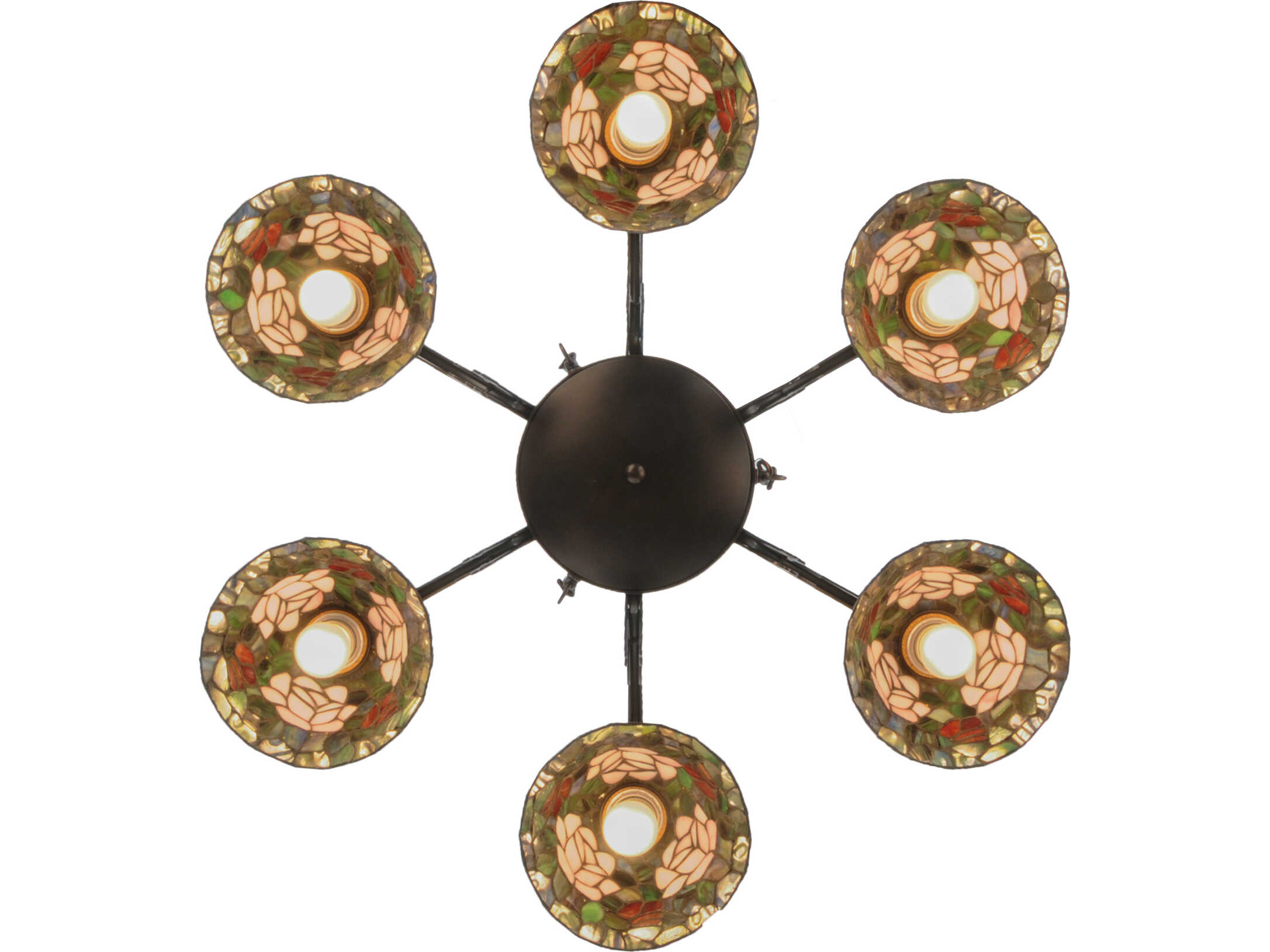 The most beloved of all flowers; the rose; is beautifully represented in this Meyda reproduction of a Tiffany Studio classic. Petal Pink; Romantic Red and Plum Passion art glass roses ramble on a maze of Garden Green leaves. These delicate domed stained glass shades are paired with a graceful; hand finished Mahogany Bronze six light chandelier fixture.