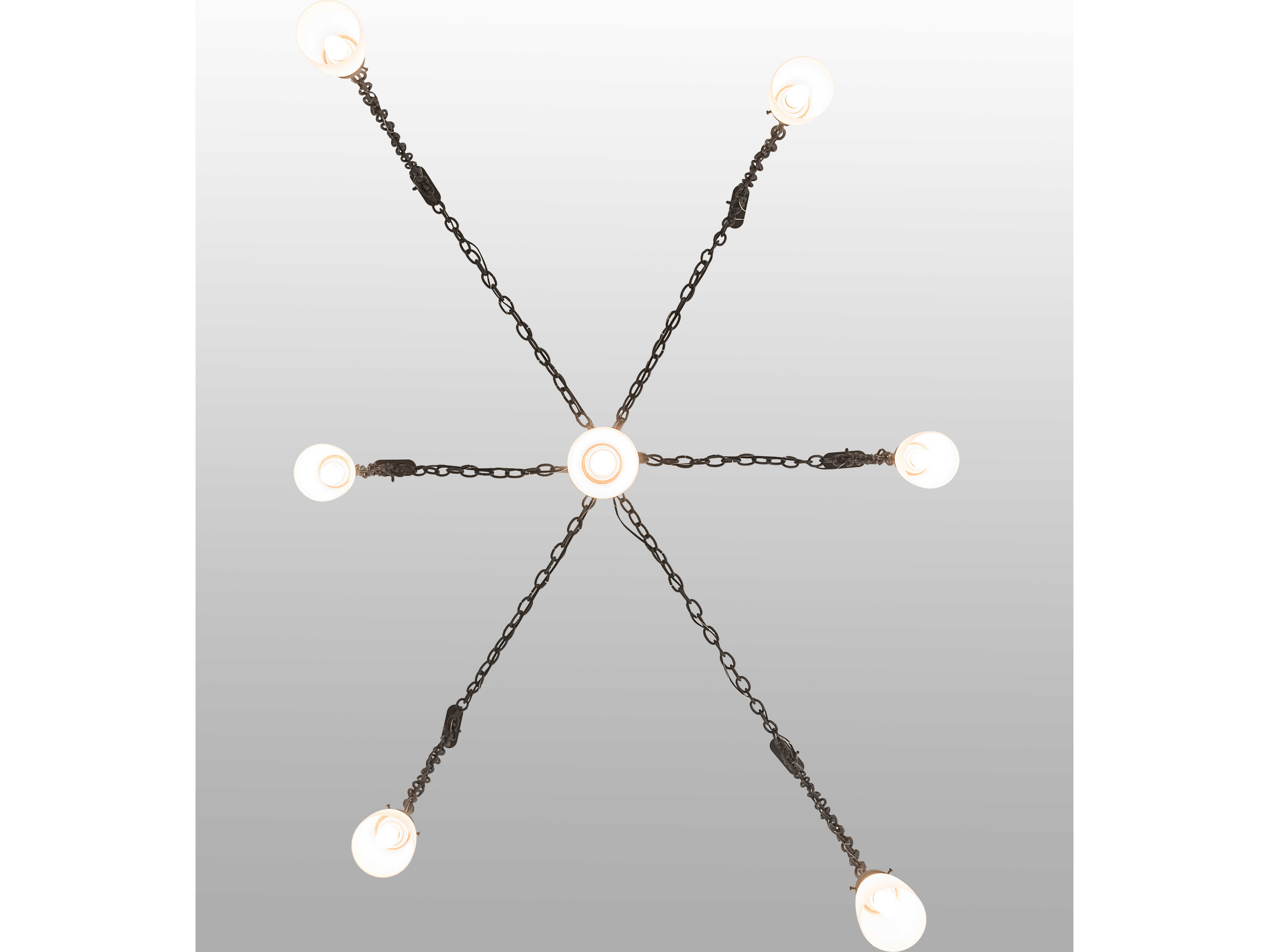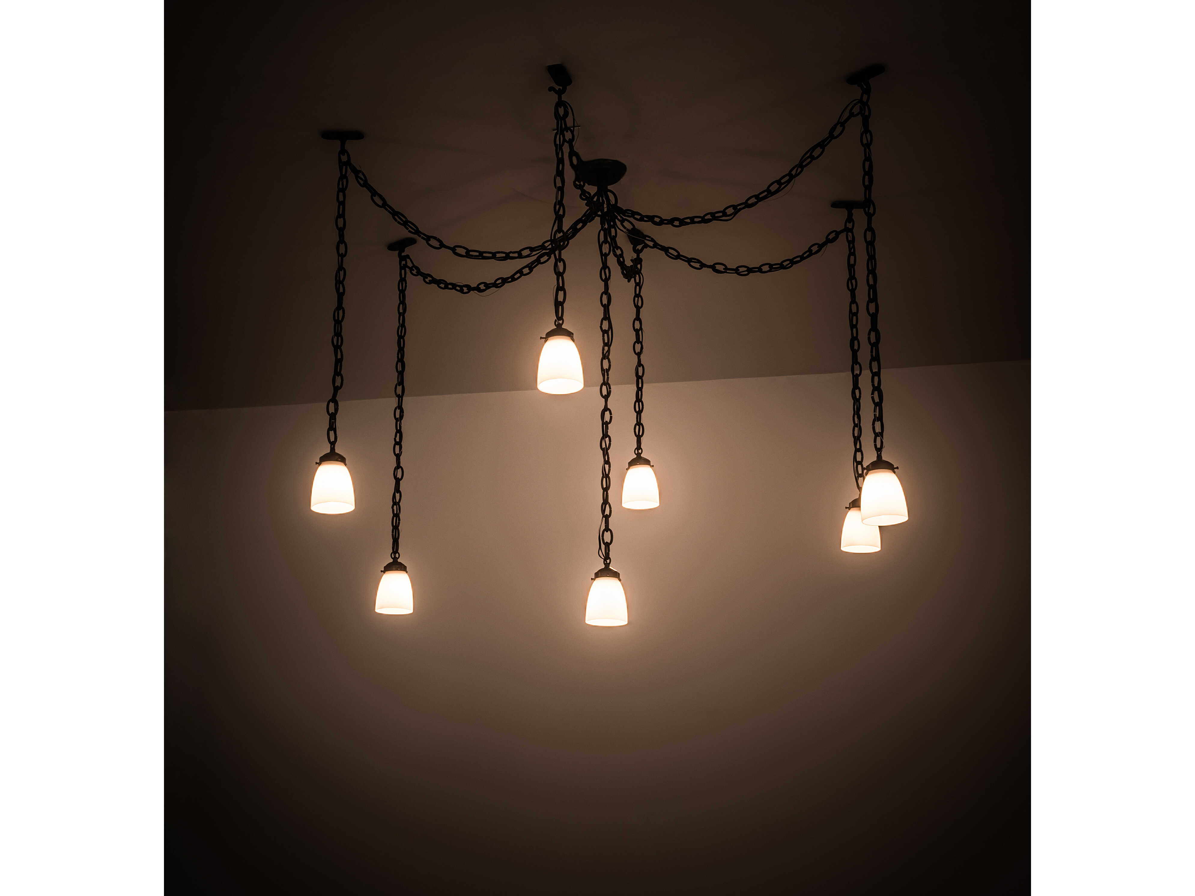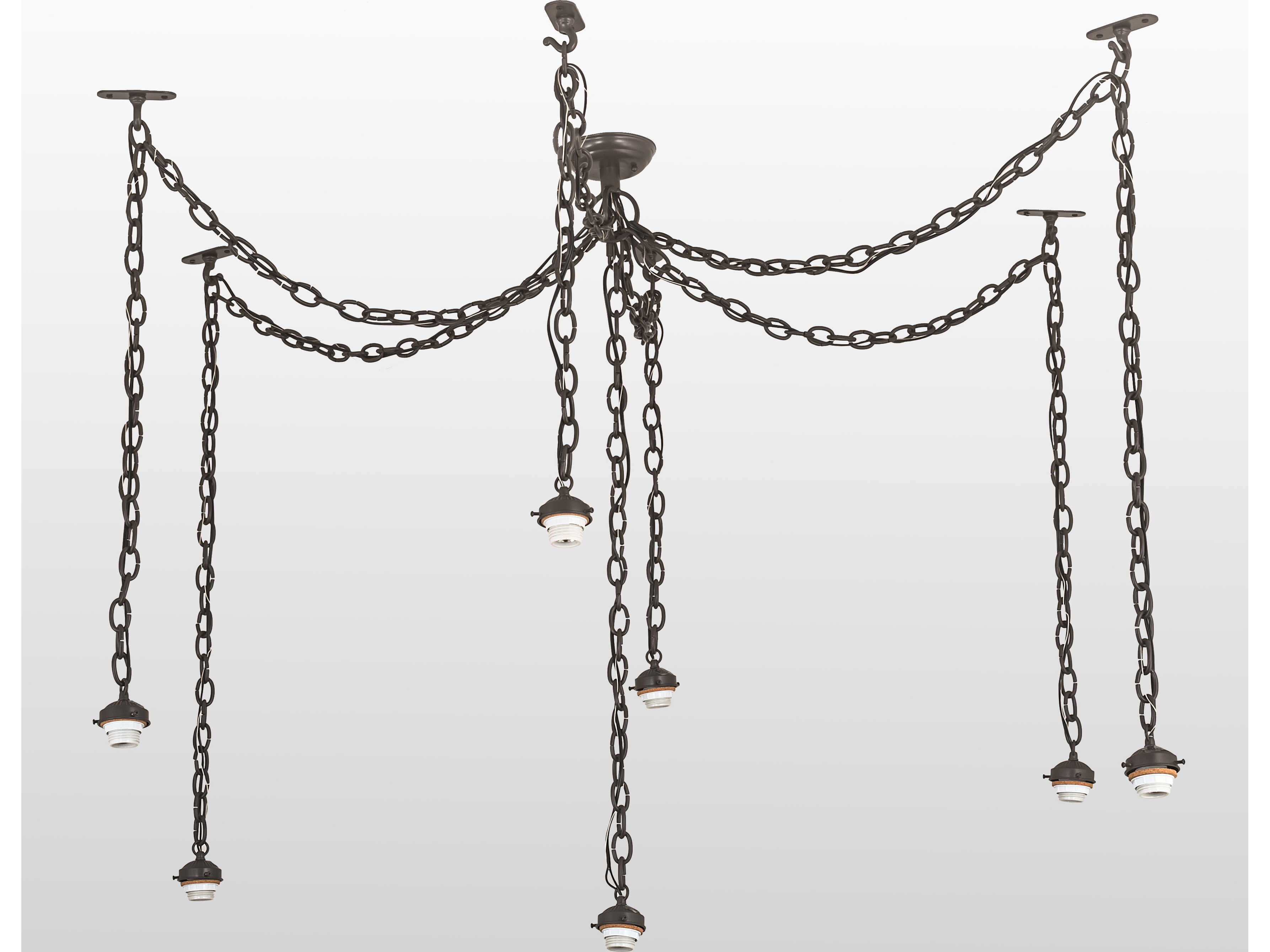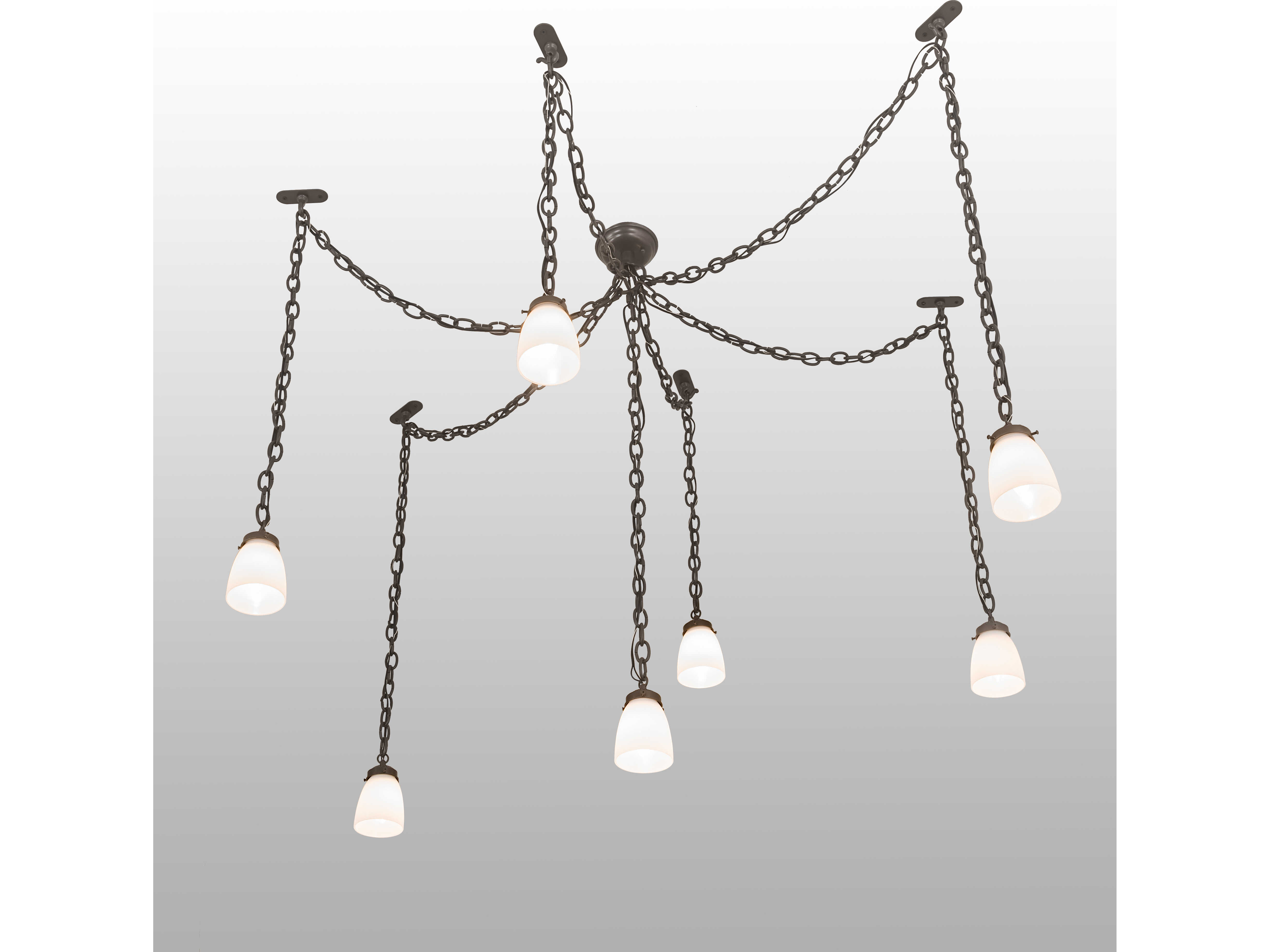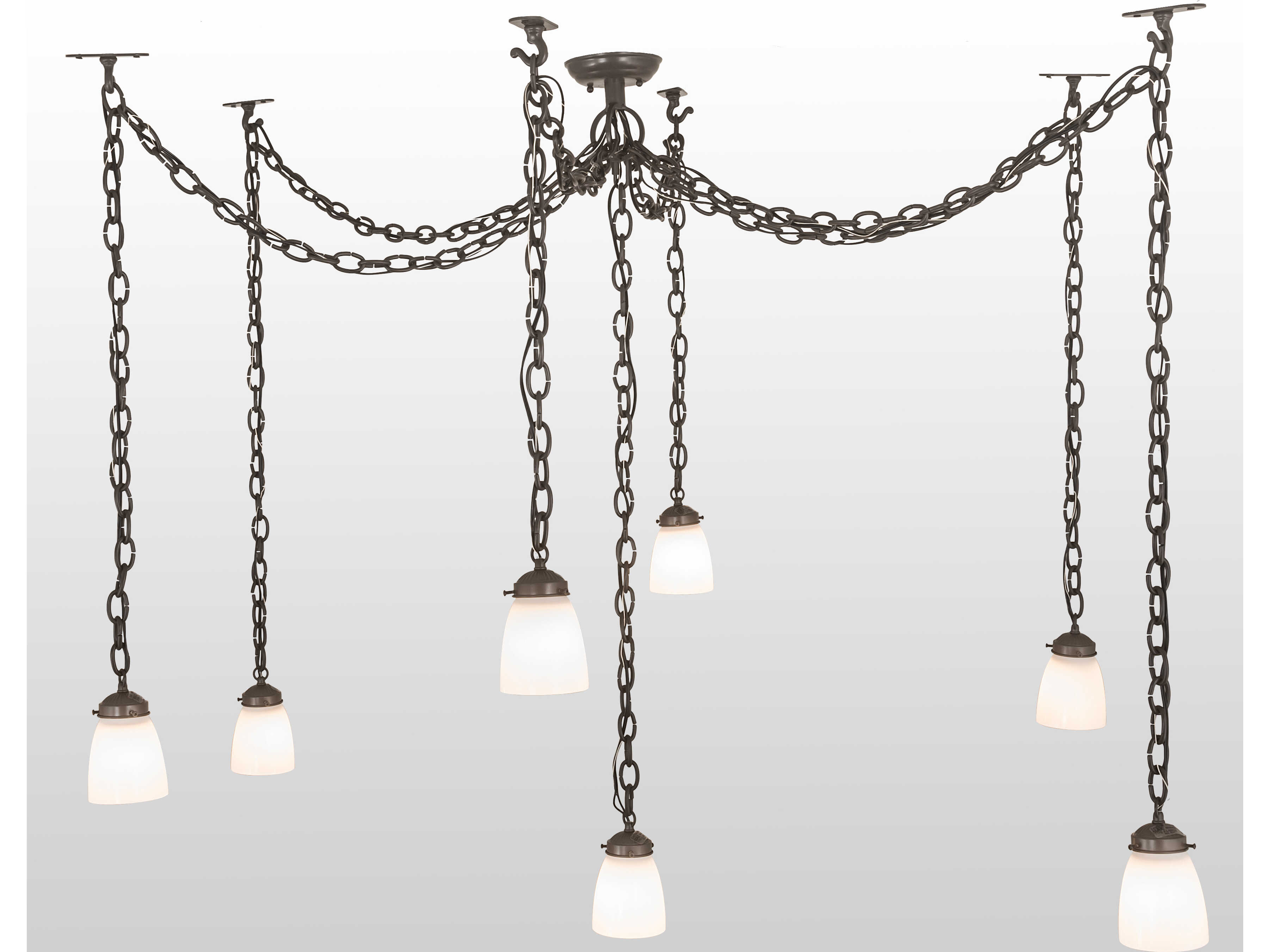 The elegant Castilian Pendant will grace any residential; hospitality or commercial space. Seven White Opalescent Glass shades are draped from chains above. The frame and hardware are finished in Timeless Bronze. The overall height and the overall width varies as the chain length can be easily adjusted in the field to accommodate your specific lighting application. Handmade in our 180;000 square foot manufacturing facility in Yorkville; NY. Available in custom sizes; finishes and styles. Dimmable energy efficient lamping options are offered. UL and cUL listed for dry and damp locations.