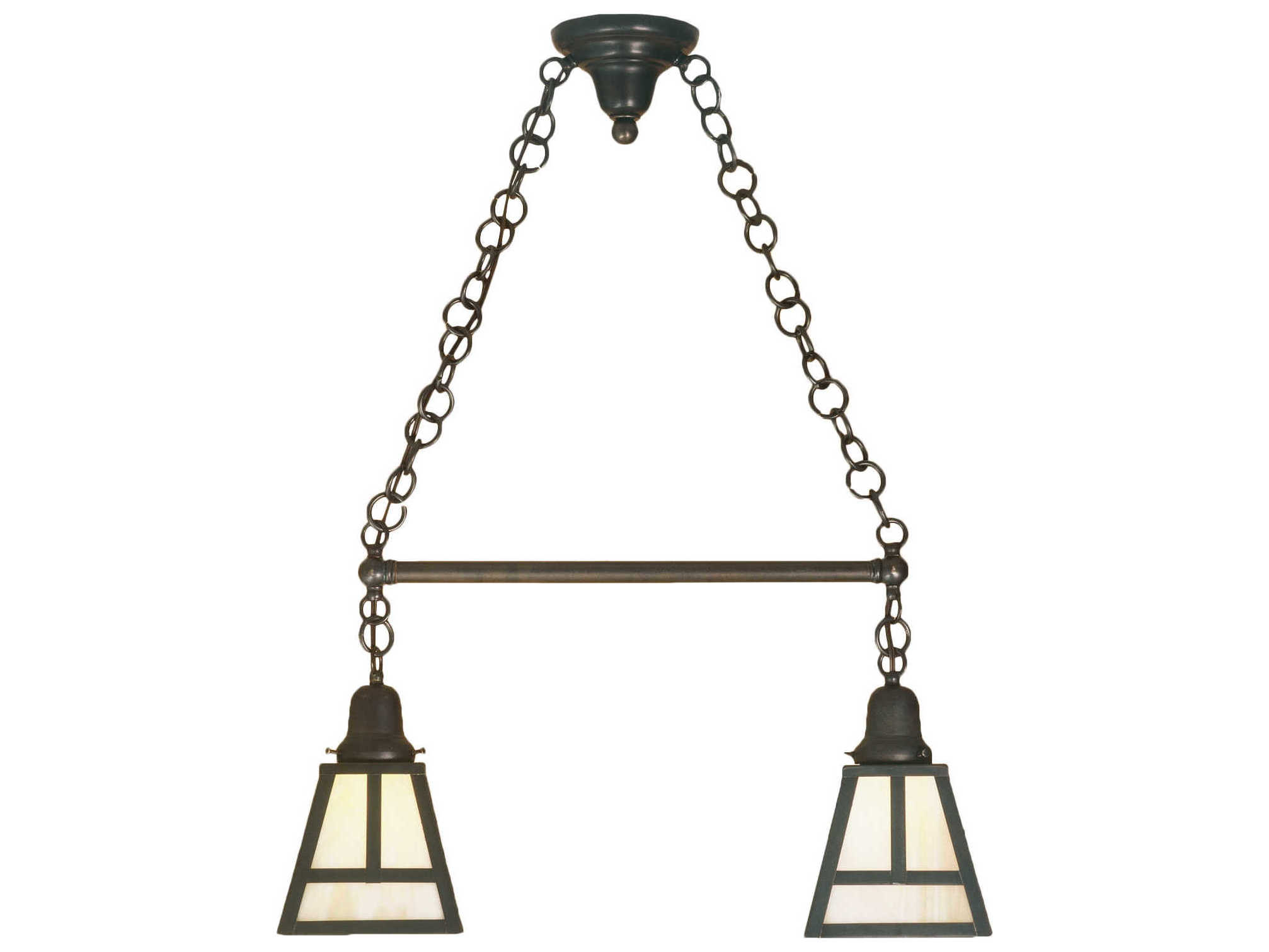 This handsome Craftsman styled Pendant is inspired by the Arts and Crafts movement. This fixture features 2 Beige Iridescent art glass shades with a striking Mission straight line design and complemented with Solid Brass hardware and decorative accents highlighted in a Craftsman Brown finish. The fixture is perfect for a broad range of interior lighting applications including illuminating islands; counters; and tables. The pendant is handcrafted by highly skilled artisans in our 180;000 square foot manufacturing facility in Yorkville; New York. Custom sizes; styles; colors and dimmable energy efficient lamping options are available. The 26-inch long fixture is UL and cUL listed for dry and damp locations.