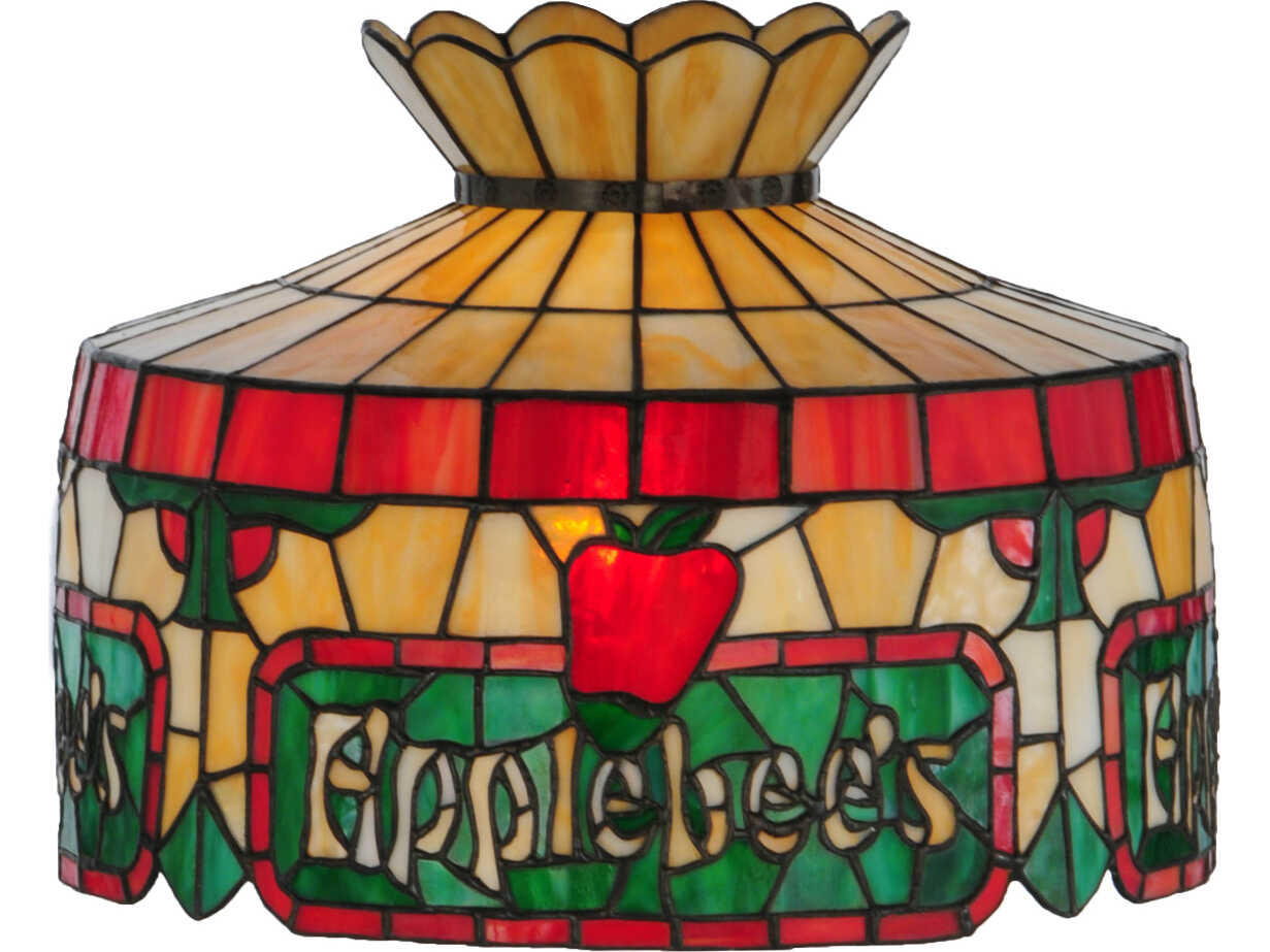 A stunning Applebee's logo with Red apple on Green motifs are highlighted on a Beige background with a Red border. The beautiful stained glass shade is created using the famous Meyda Tiffany copperfoil construction technique. Pair with a base to create a lamp or match with hardware to build ceiling fixtures. The Personalized Applebee's Shade is featured in our American designed; handcrafted Applebee's Lighting Collection. Our national account lighting program enables companies to incorporate any corporate logo onto a lamp or fixture shade in the style and size of their choice. Quality and lead time control is our specialty and the Meyda facility includes a full team of engineers and nearly every manufacturing process under one roof.
