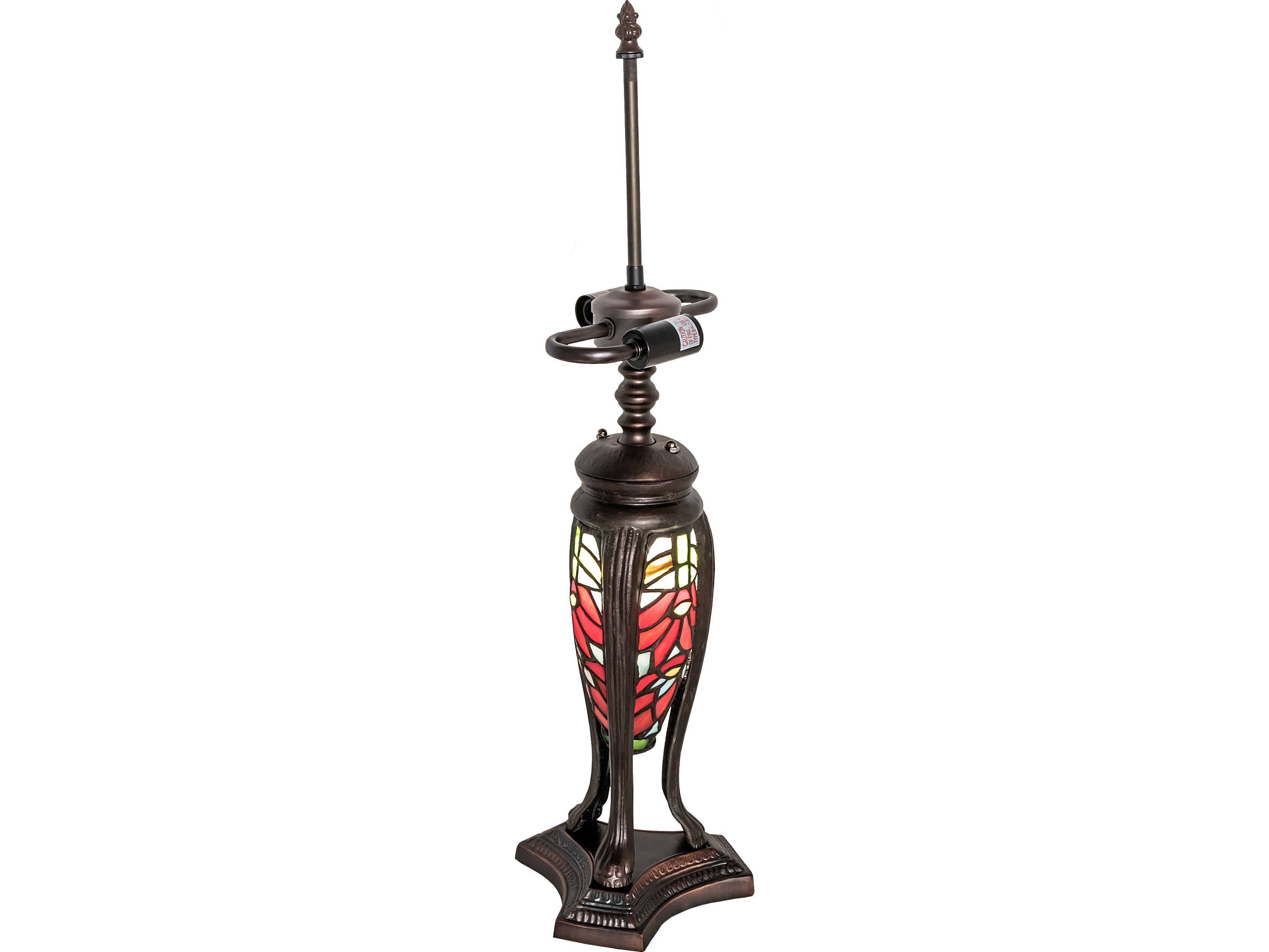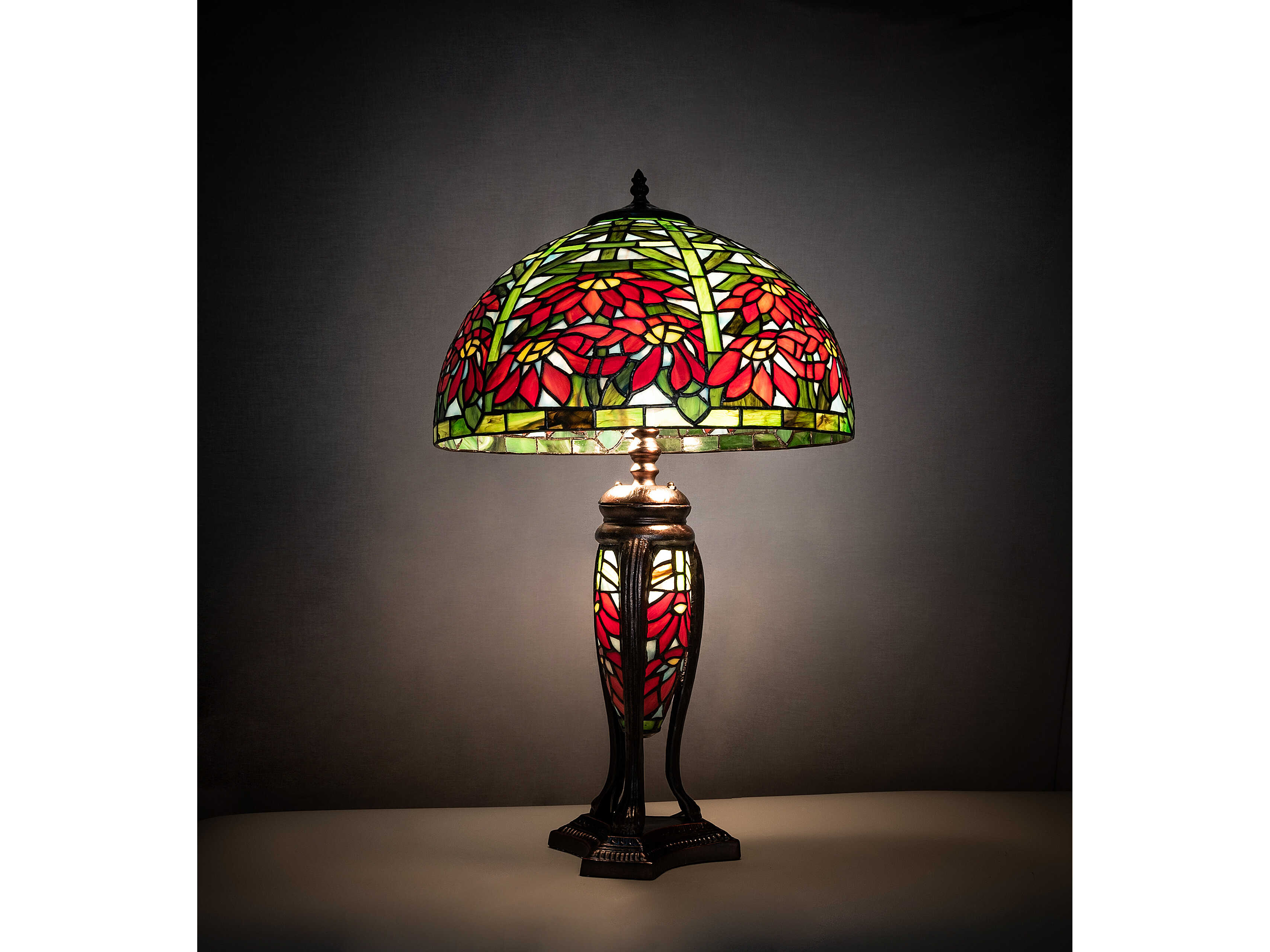 Russet Poinsettia flowers against Bay Green leaves and background grace this Tiffany Studio reproduction stained glass shade. The warm neutral tones in this floral arrangement make this table lamp; which has a matching stained glass base finished in Mahogany Bronze; a suitable accompaniment for any room and any season. The base illuminates as well. The Poinsettia Table Lamp is featured in our American designed; handcrafted Stained Glass Lighting Collection. UL and cUL listed for dry locations. Each shade is a unique work of art with color variations based on natural ingredients inherent in the glass. Contact us if color matching is critical when ordering multiple items.