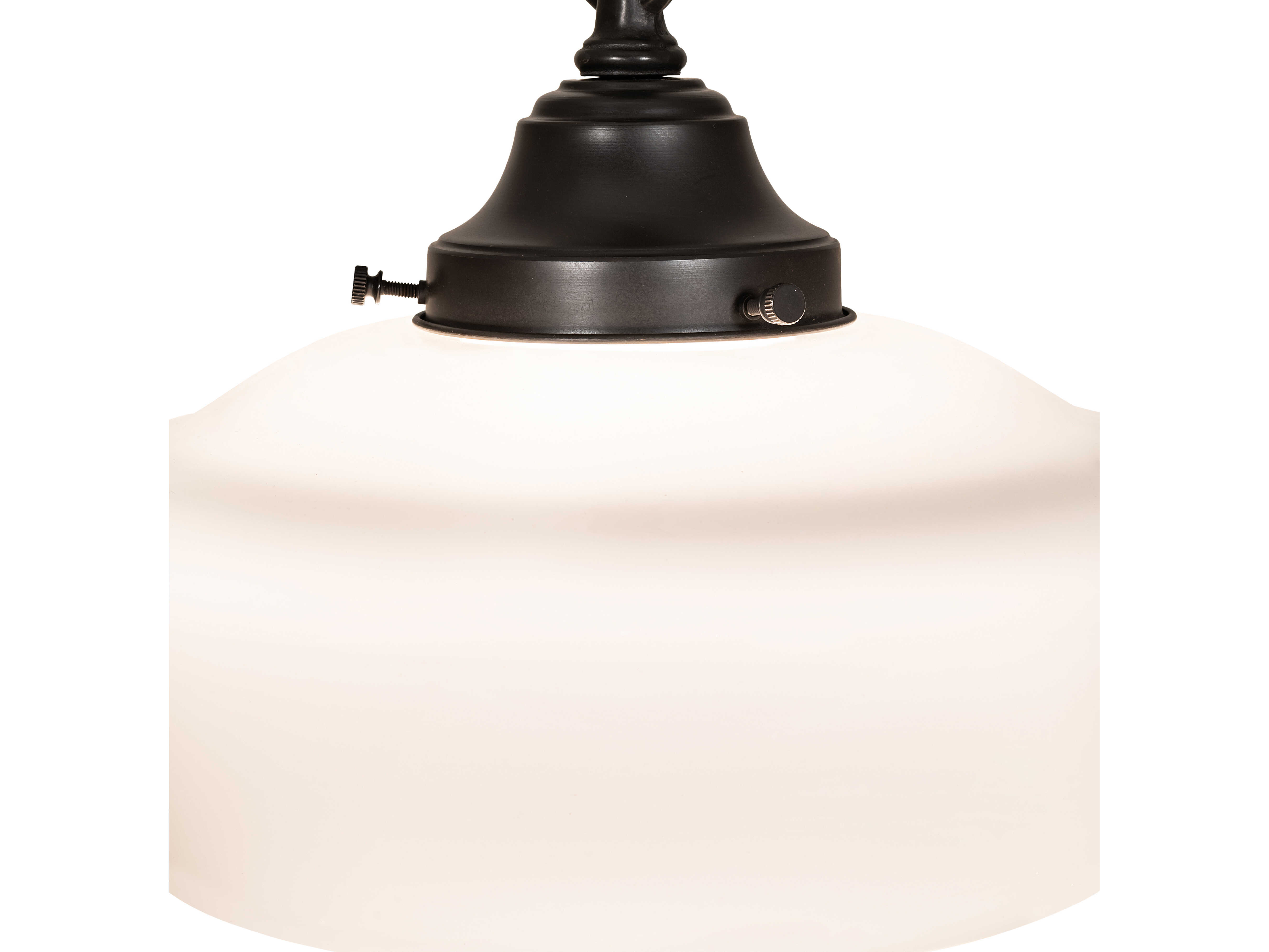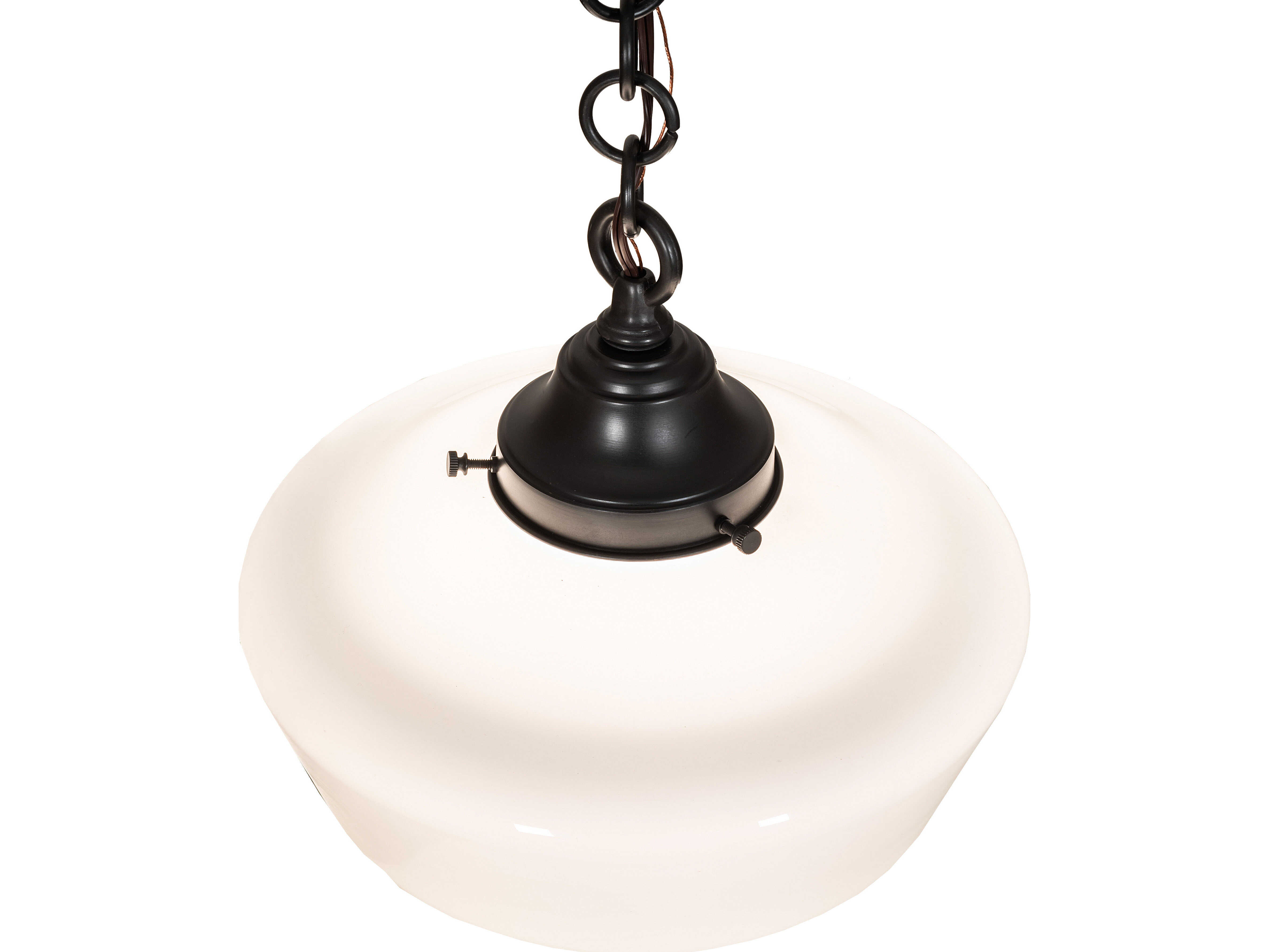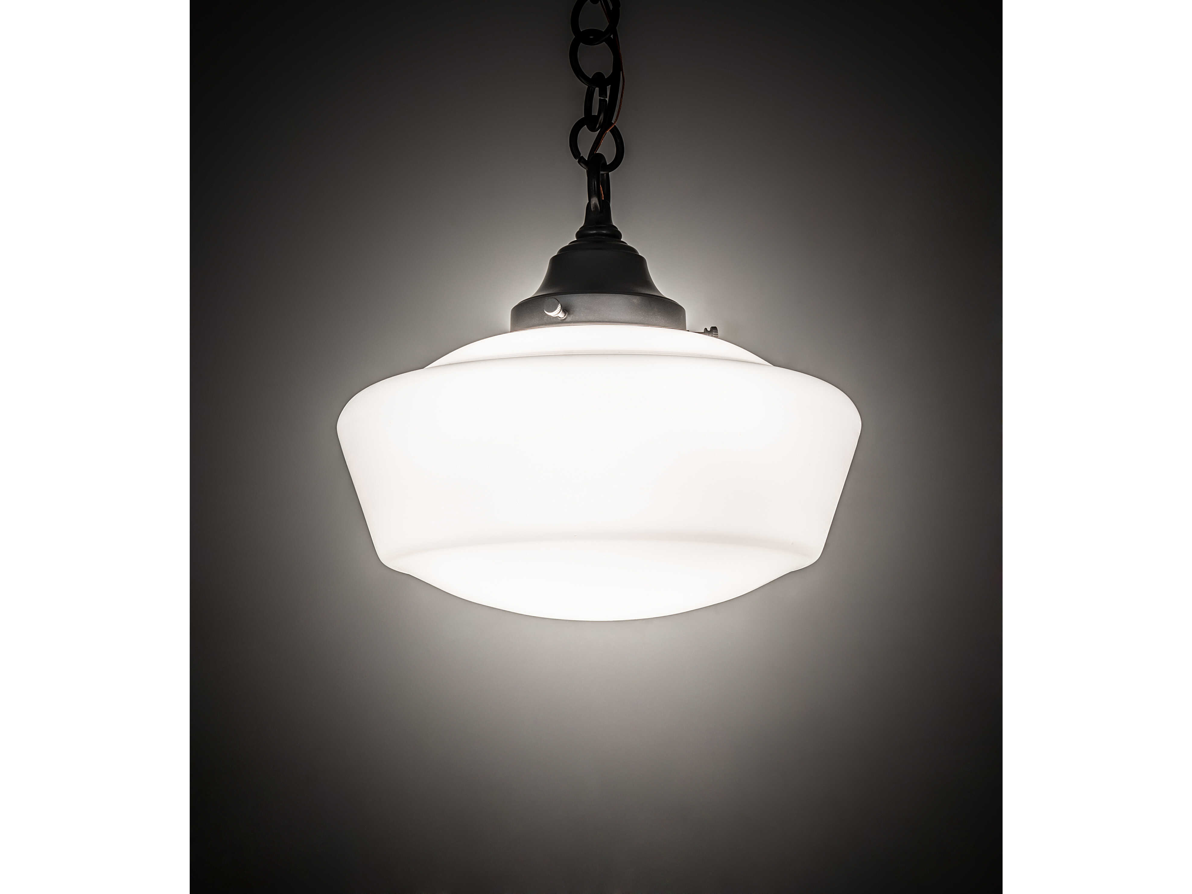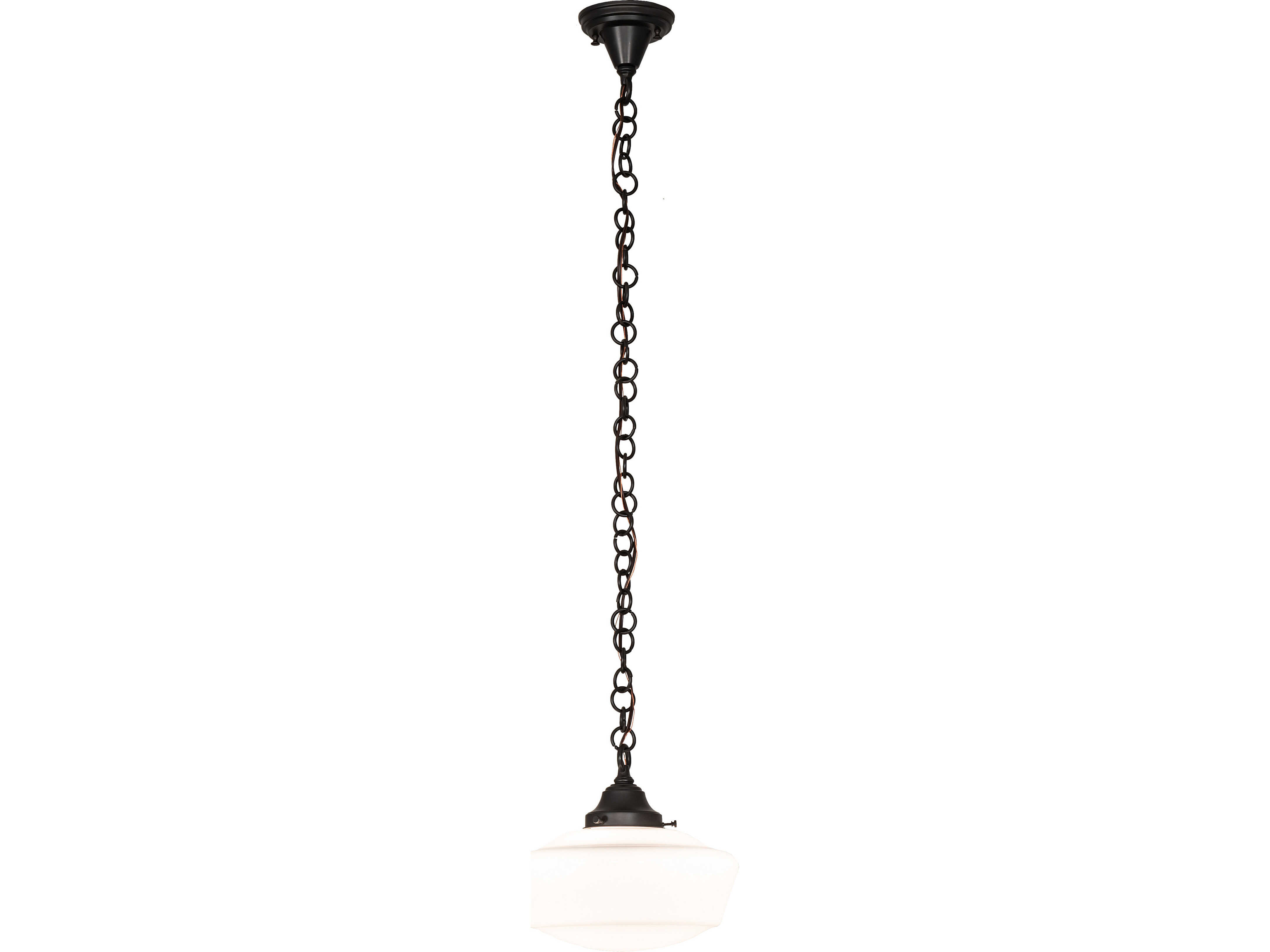 The Revival Schoolhouse glass reflects an authentic classic design. A perfectly formed shade is handcrafted of White Opal Schoolhouse Glass with rich artisanship and style. Originally used in private residences; schools; galleries and libraries; this Schoolhouse electrical reproduction pendant will illuminate a broad range of interiors today. The Brass constructed pendant is enhanced with a Craftsman Brown finish. The overall height ranges from 17 to 52 inches as the chain length can be adjusted in the field. Handcrafted by highly skilled artisans in our 180;000 square manufacturing facility in Yorkville; New York. Diffuser colors; metal finishes and fixture sizes can be customized. UL and cUL listed for dry and damp locations.