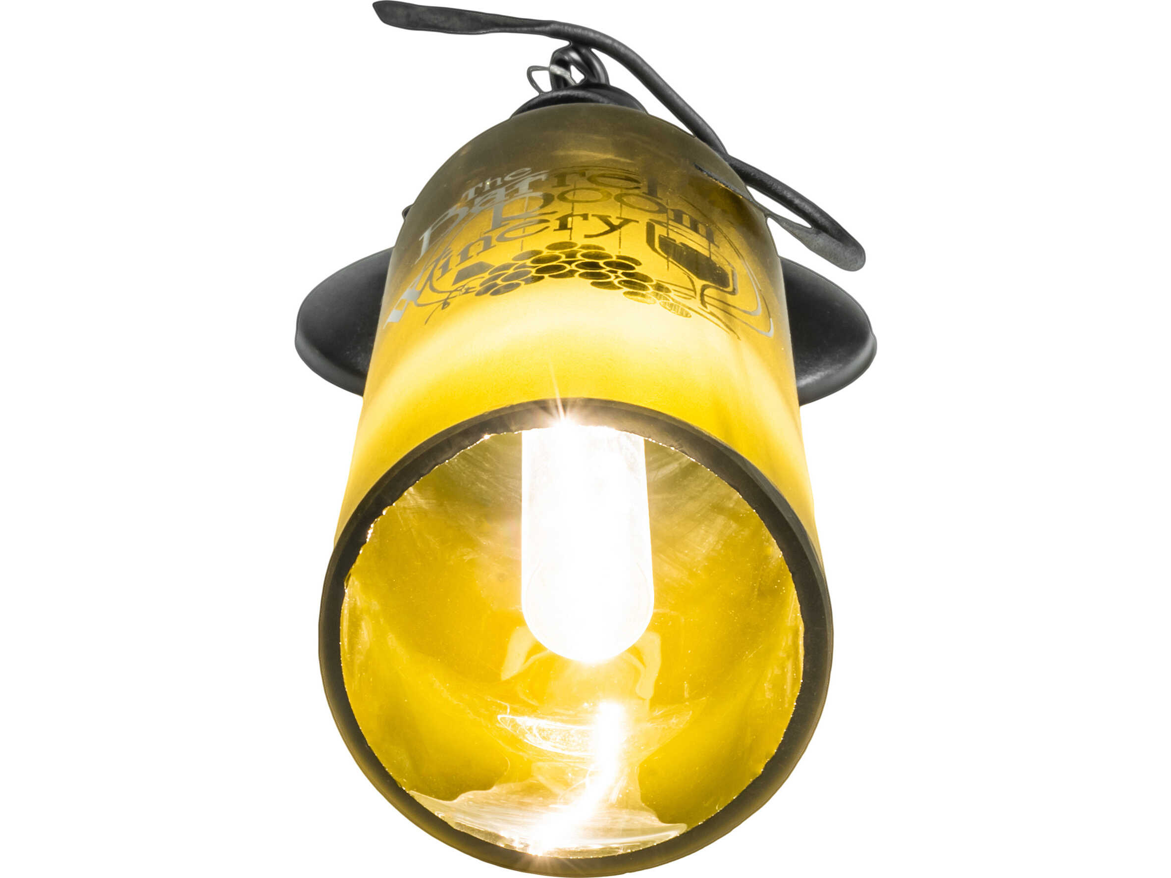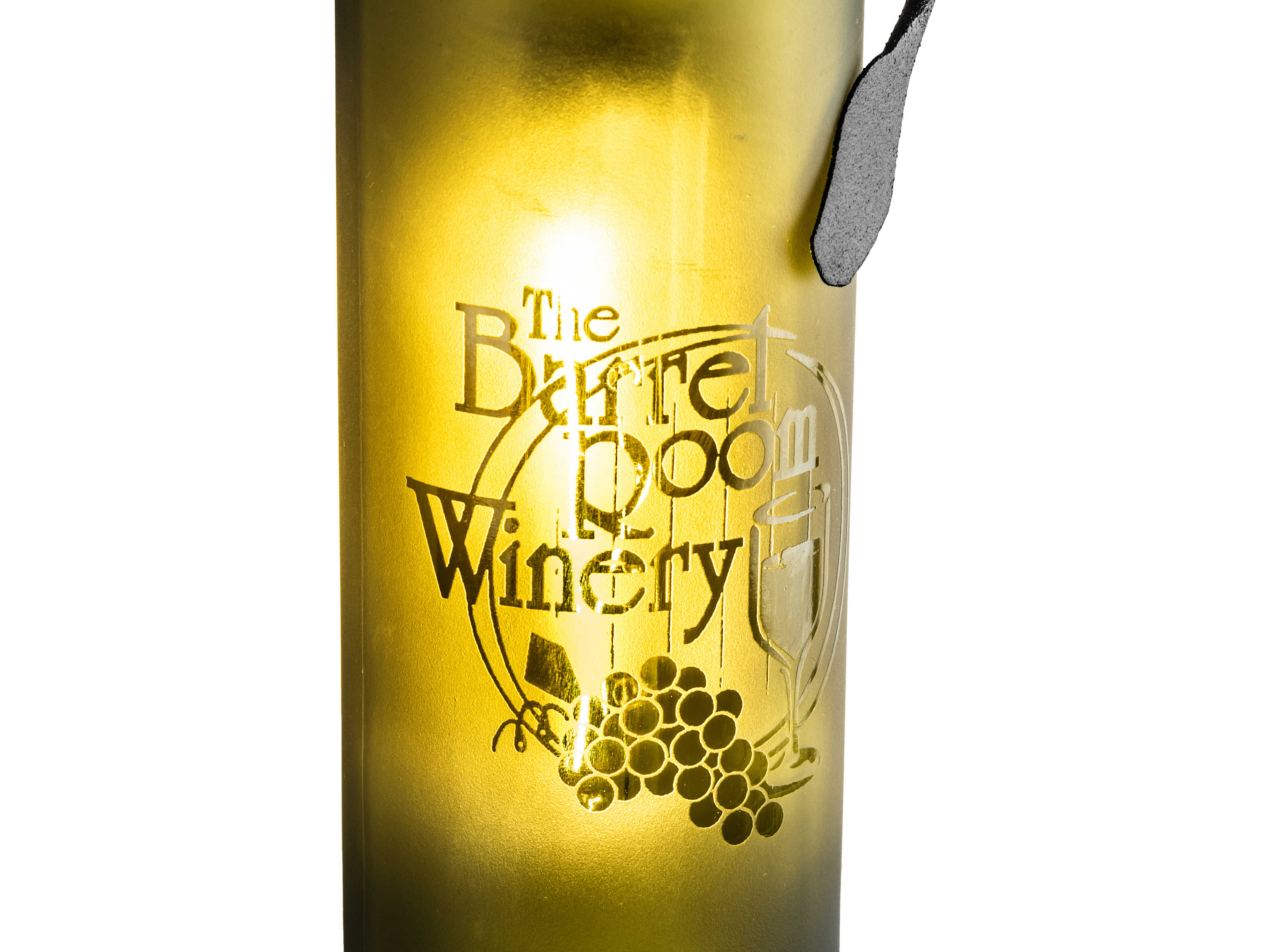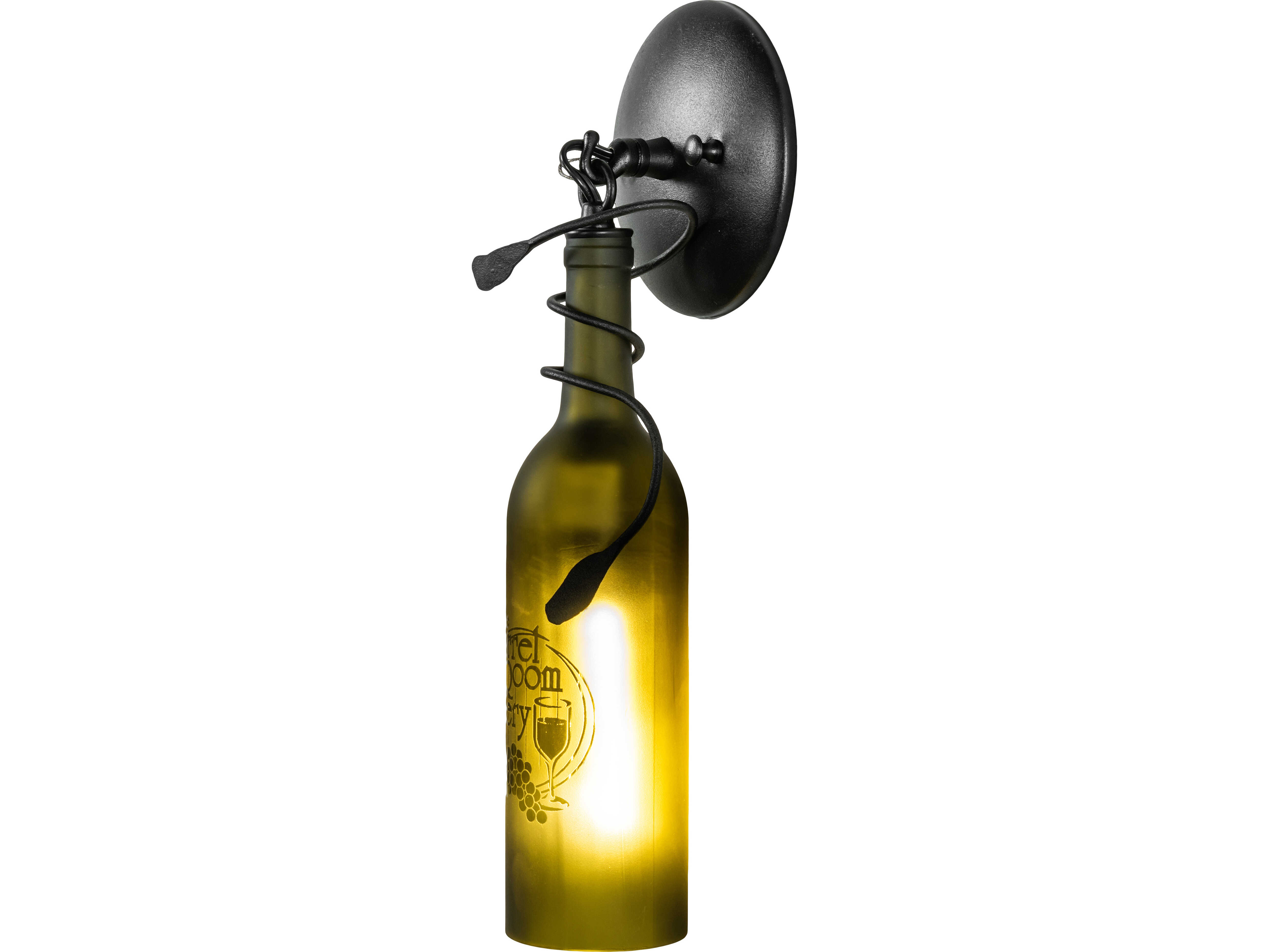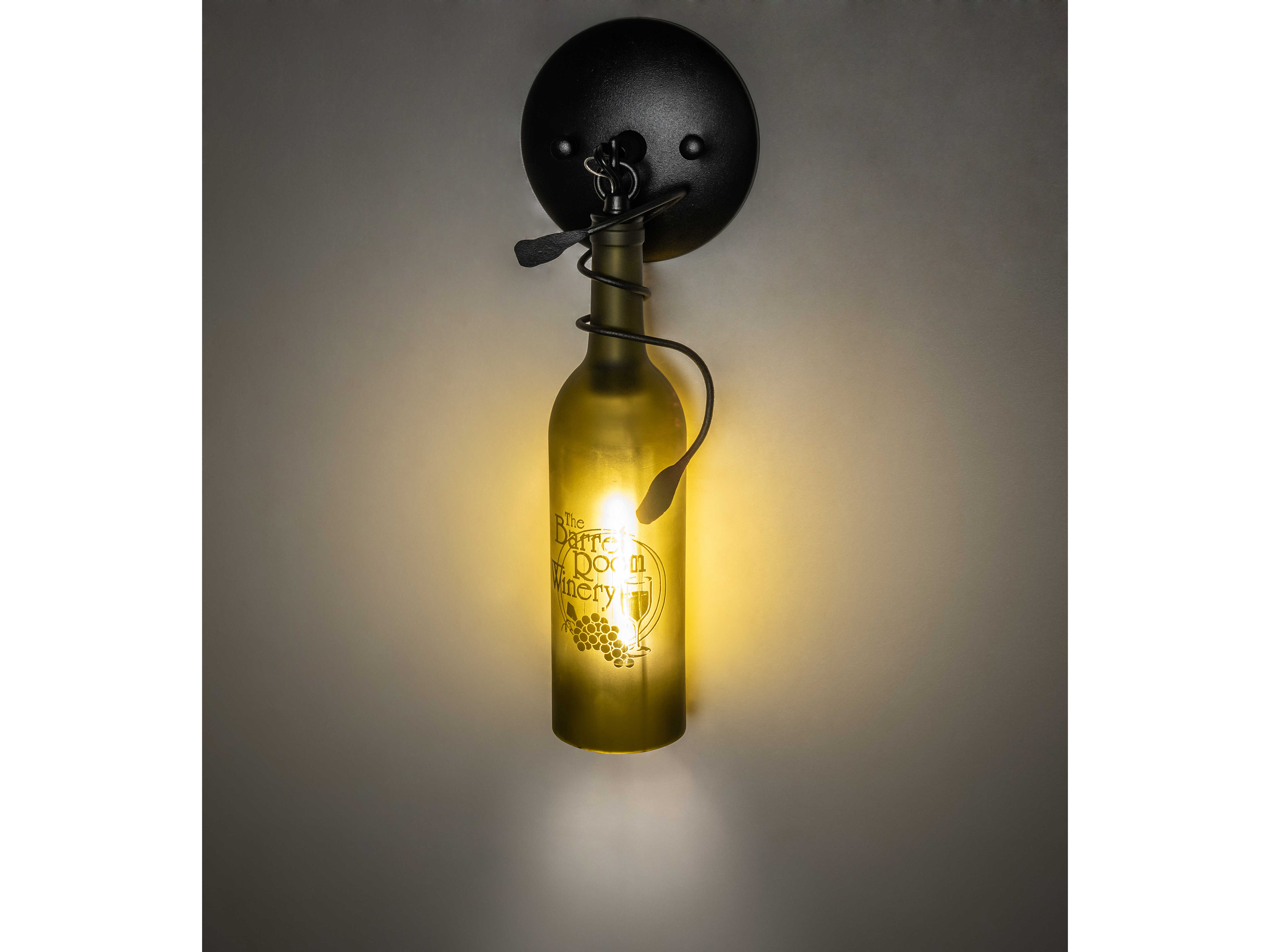 Hand-etched with The Barrel Room Winery Room; this personalized Wine Bottle Wall Sconce does so much more than deliver light; it adds personality and pizzazz. A Green bottle features the hand-etched logo and grape design and is embraced with vine-like accents and hardware featured in a Textured Black finish. This rich-looking Tuscan Vineyard Personalized Wine Bottle Wall Sconce is included in our American-made; American-designed; handcrafted Wine Bottle Lighting Collection. The fixture is manufactured in Yorkville; New York. UL and cUL listed for dry and damp locations. Take your finest bottle of wine; and Meyda will transform it into an everlasting personalized fixture of light. Contact us for more information on personalized and custom wine bottle lighting fixtures and lamps. The fixture can be custom-designed with your name; company logo; or any other message. You can also create custom lighting with beer bottles; mason jars; milk bottles; and other glass containers and vessels by contacting us!