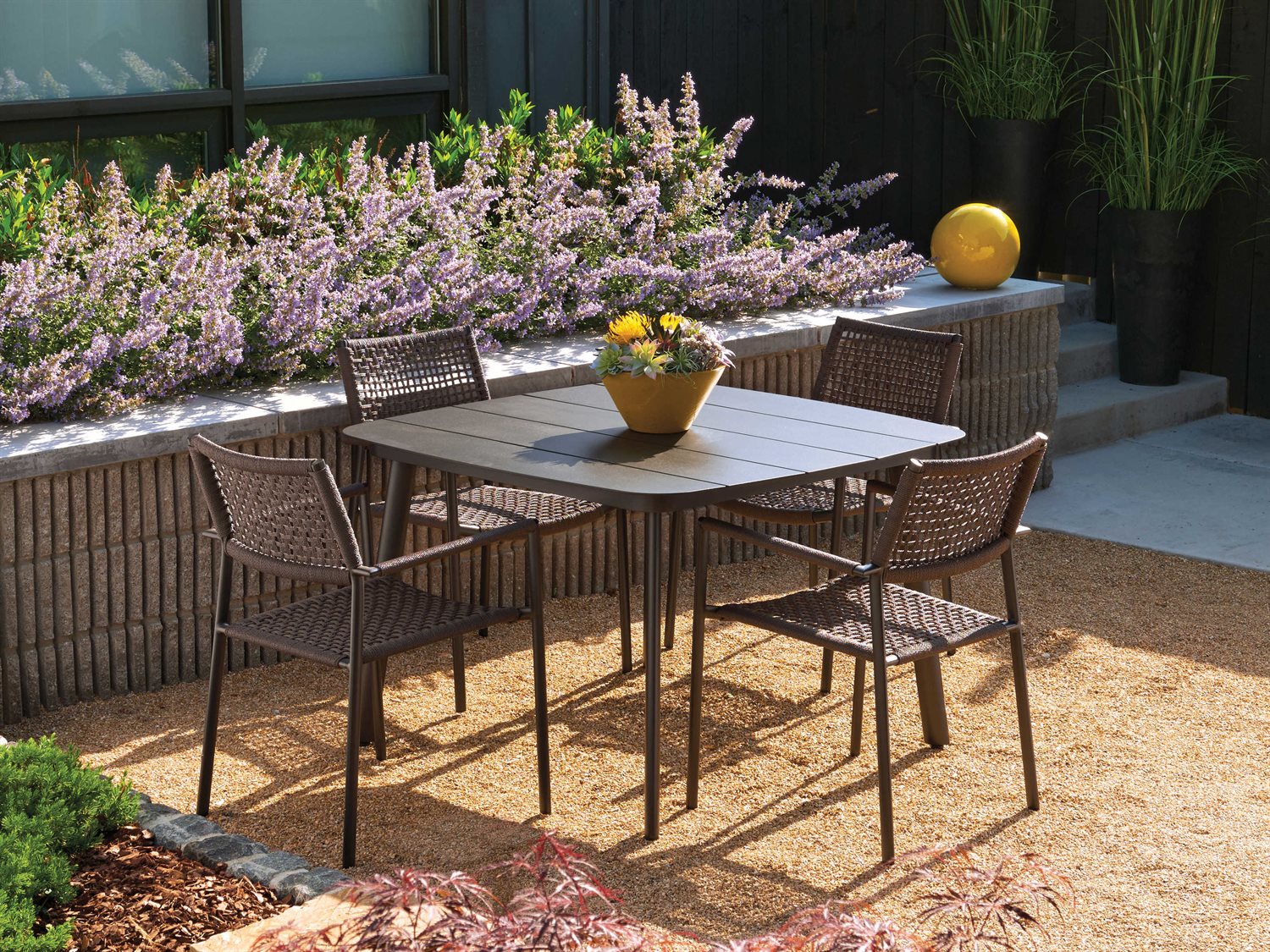 - Set Includes: Eiland 45in Square Dining Table -Carbon, 4 Eiland Armchairs -Carbon w/ Mocha finish