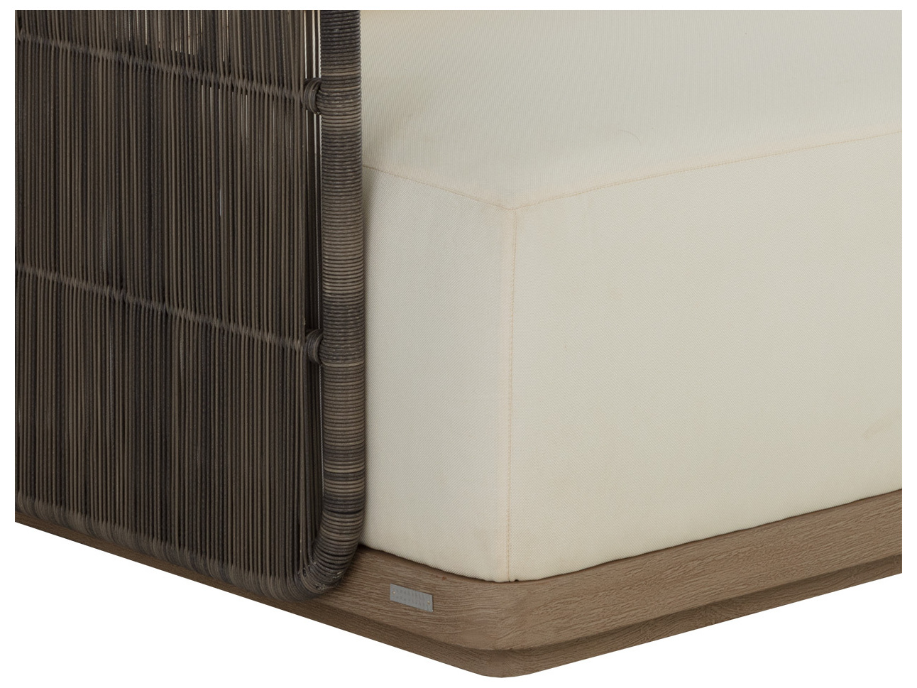Relax and enjoy the weather with the comfortable Ravenna Sofa. Constructed with a drift brown teak wood base with a linear handwoven design made from ore grey polyrod on a black aluminum frame. Suitable for indoor and covered outdoor spaces.