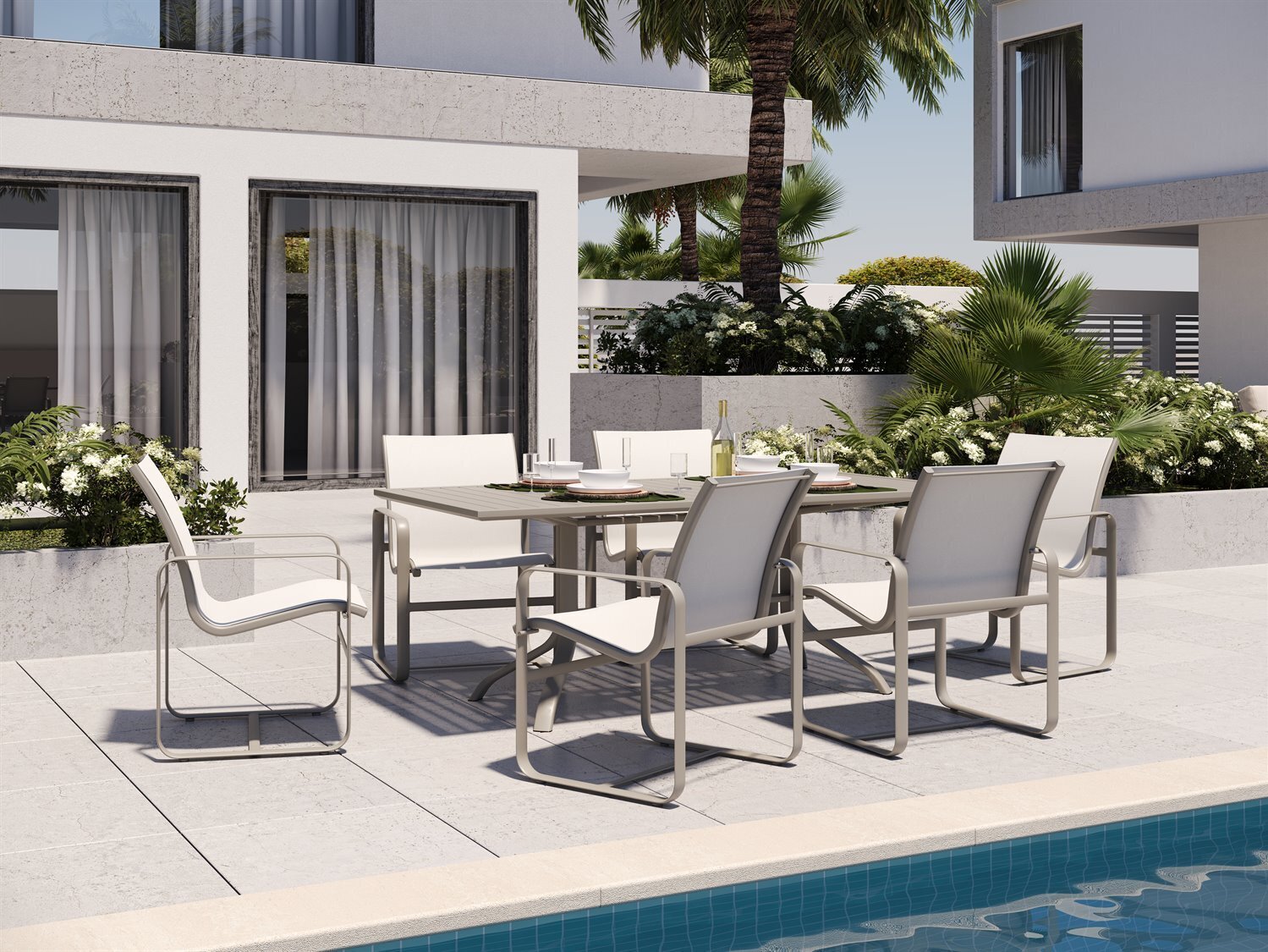 The Brasilia Sling Dining Chair elevates the pleasures of open-air dining with style. Its structured, yet open silhouette with gently rounded armrests and a low curved back provide just the right amount of support. The all-weather sling fabric provides breezy good looks and carefree maintenance. Customize your dining chair with Tropitone’s exclusive sling mesh fabrics and powder coat finishes.